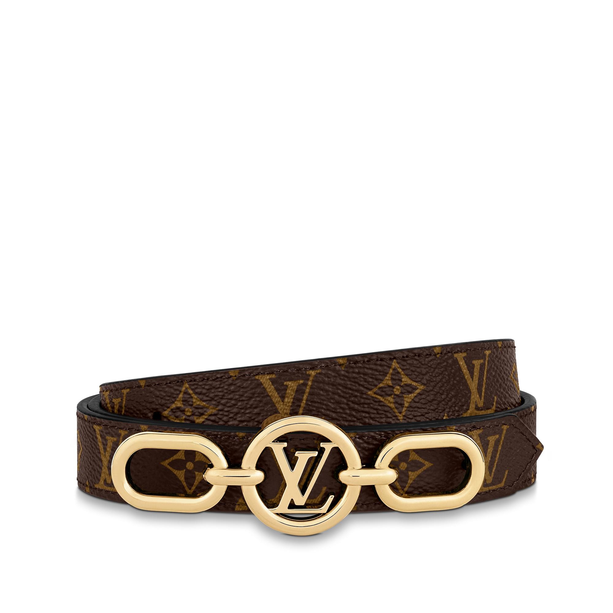 The belt buckle on the LV Circle Prime 20mm reversible belt is reminiscent of those found in the Louis Vuitton shoe collection. The buckle has a central LV Circle flanked by interlacing links. This reversible belt has smooth leather on one side and the House's iconic Monogram canvas on the other. Product details 33.5 inches (length) Width: 7.9 inches/20 mm Buckle height: 1.2 inches/3 cm Buckle width: 3.3 inches/8.5 cm Black Leather Monogram canvas Gold-color hardware LV CircleM0510V Louis Vuitton LV Circle Prime 20MM Reversible Belt - Women - AccessoriesWomen - Accessories - Belts - LV Circle Prime 20MM Reversible Belt