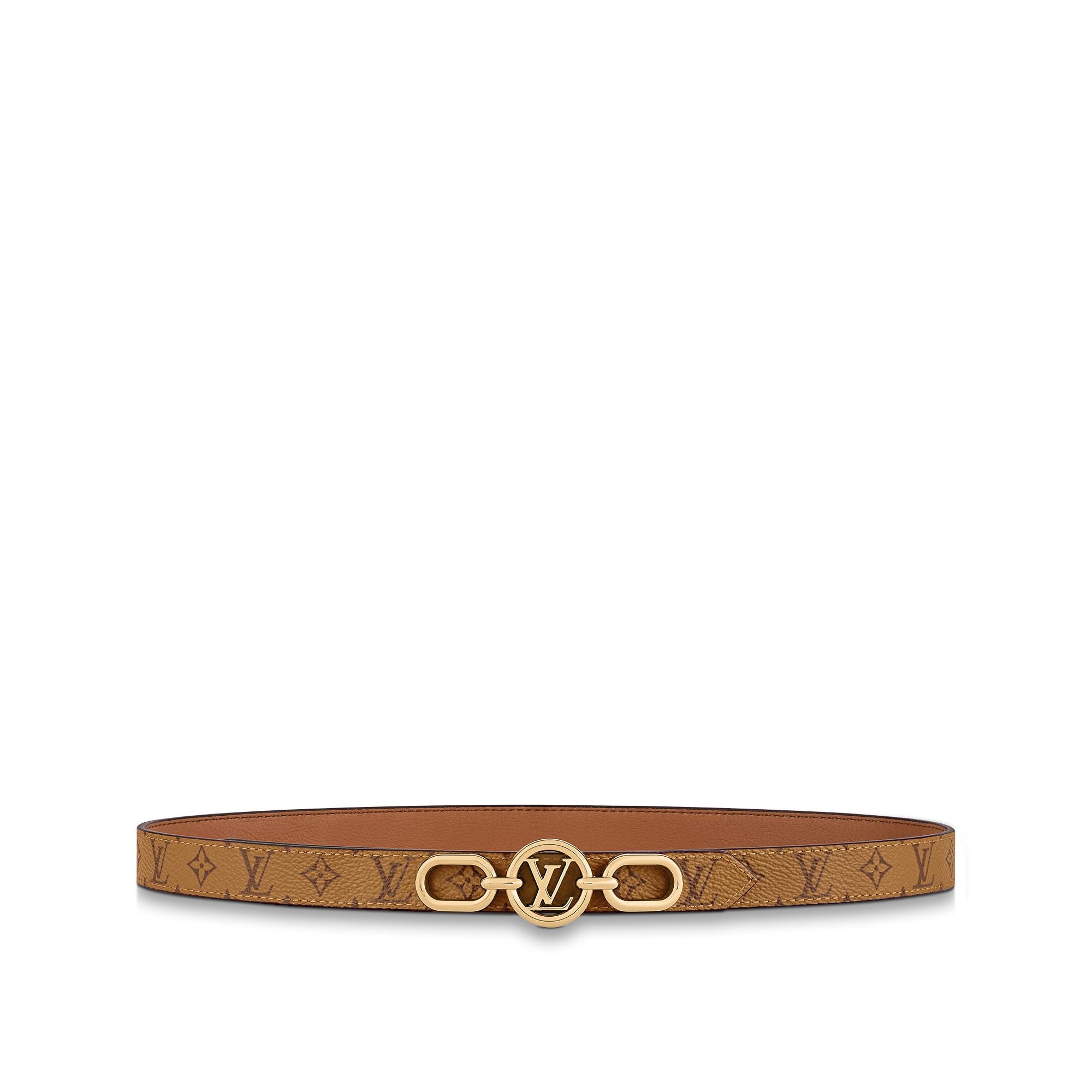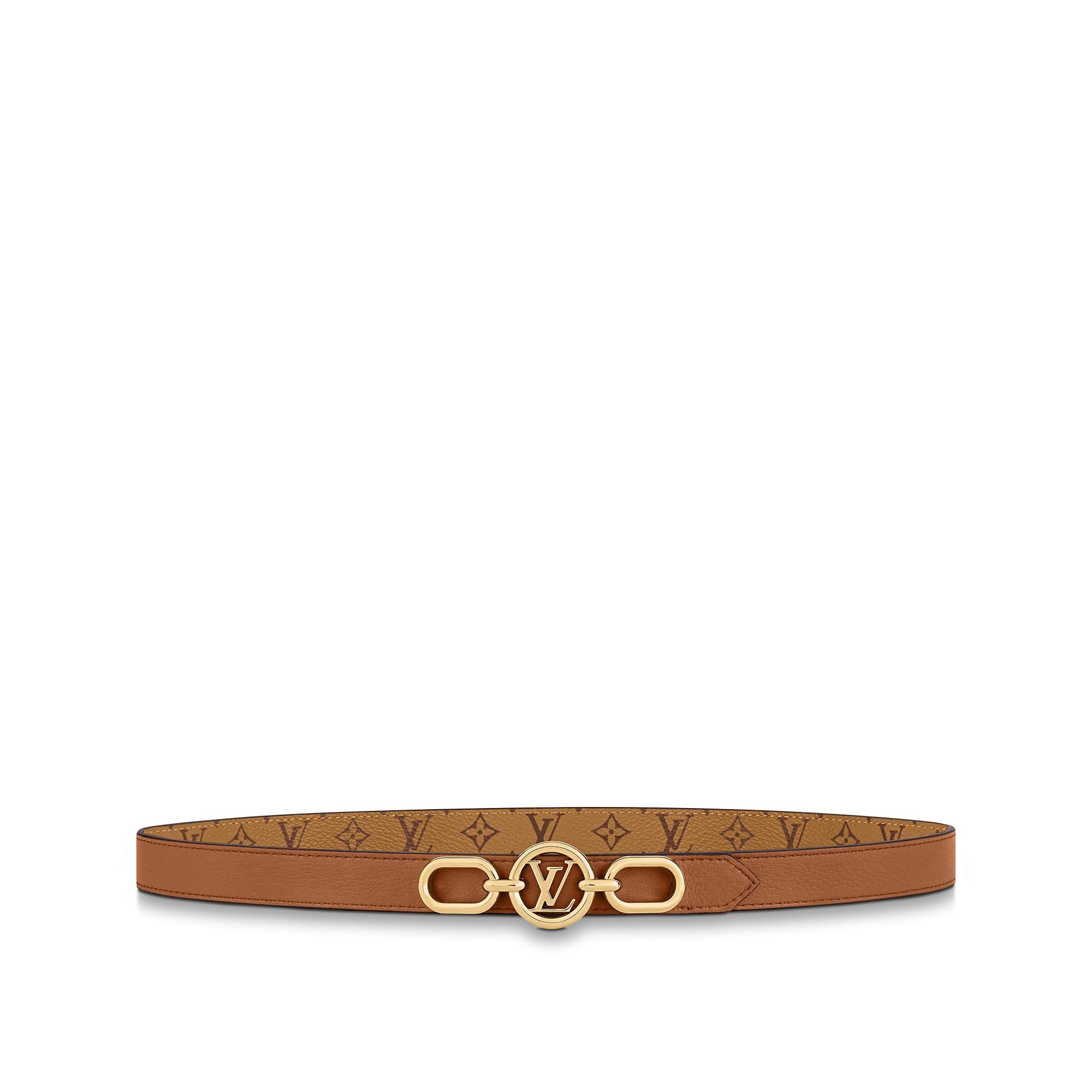 The LV Circle Prime 20mm reversible belt features a closure inspired by buckles from the House's shoe collection. This new signature hardware includes the LV Circle signature and interlocking chain links. The slim belt has both a leather and Monogram Reverse canvas side for added versatility. Product details 29.5 inches (length) Width: 7.9 inches/22 mm Buckle height: 1.2 inches/3 cm Buckle width: 3.3 inches/8.5 cm Tan Leather Monogram Reverse canvas Gold-color hardware LV Circle buckleM0547X Louis Vuitton LV Circle Prime 20MM Reversible Belt - Women - AccessoriesWomen - Accessories - Belts - LV Circle Prime 20MM Reversible Belt