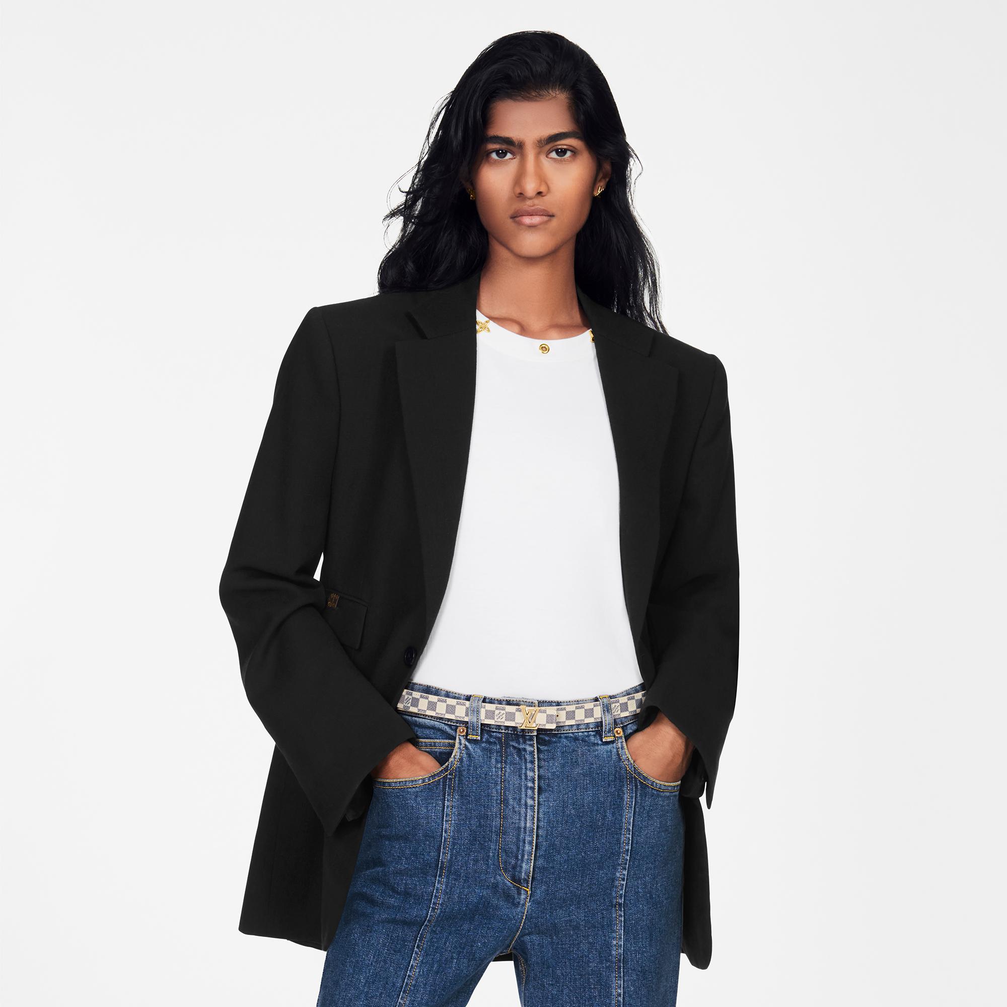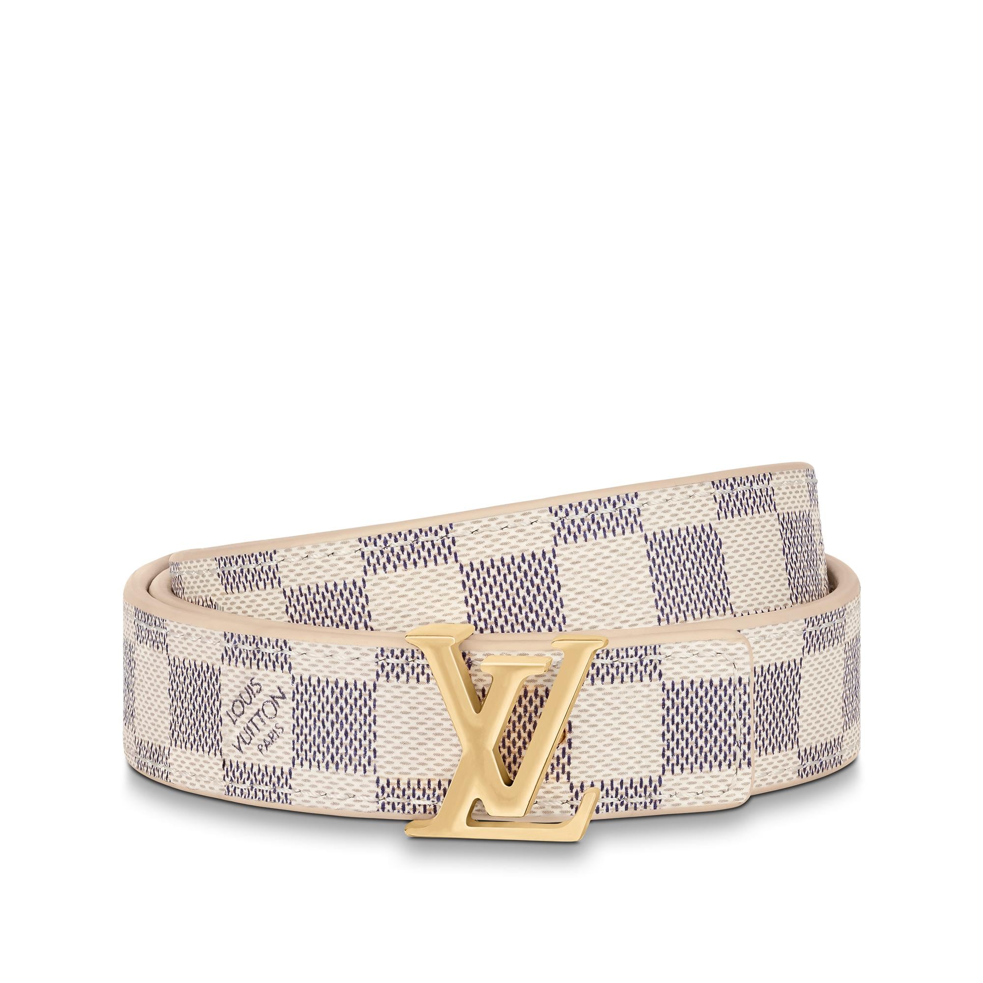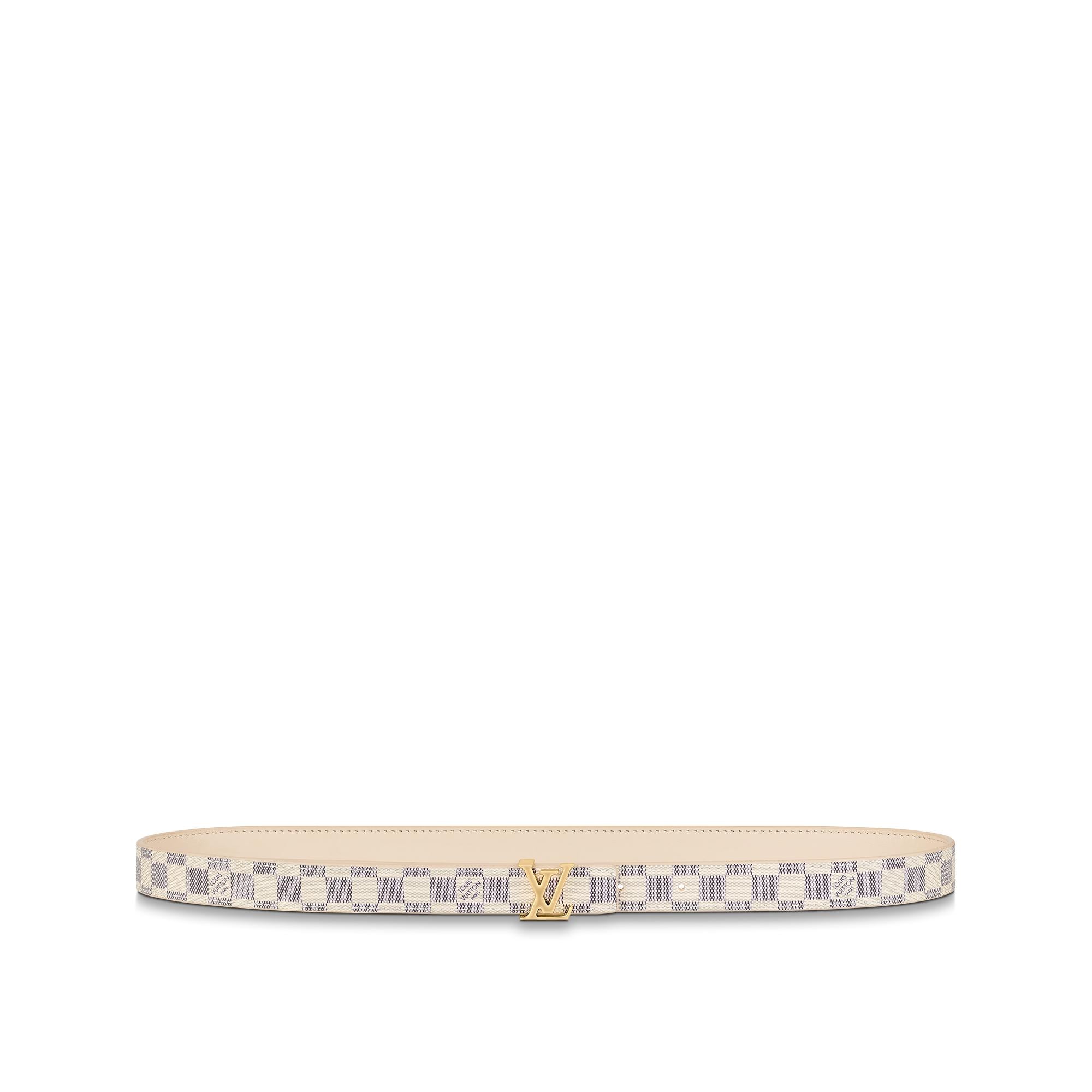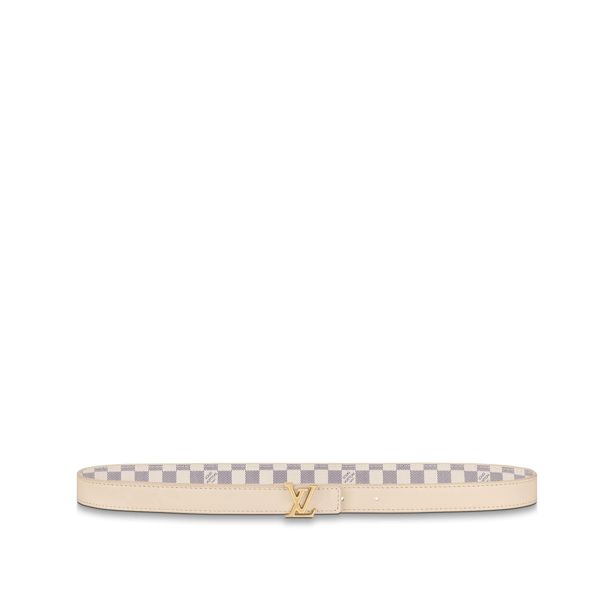 The LV Iconic 20 mm reversible belt features the House's Damier Azur canvas on one side and smooth calf leather on the other. The belt buckle shows off the LV Initials in gleaming hardware. This accessory coordinates with a bucket hat from the same collection and with many pieces from the Ready-to-Wear collection. Product details 25.6 inches (length) 0.8 inches/2 cm Damier Azur canvas recto side Cream calf leather verso side Gold-color hardware LV Initials buckleM0466M Louis Vuitton LV Iconic 20 mm Reversible Belt - Women - AccessoriesWomen - Accessories - Belts - LV Iconic 20 mm Reversible Belt