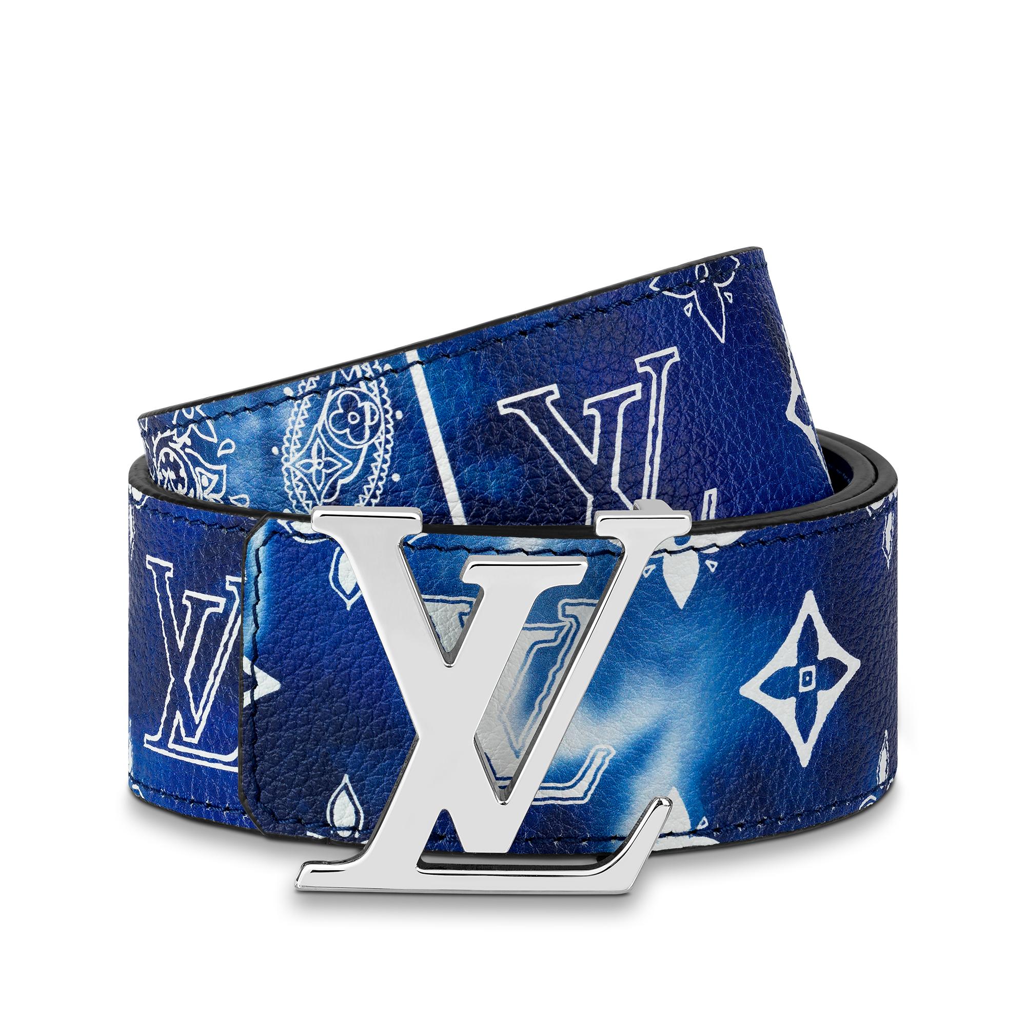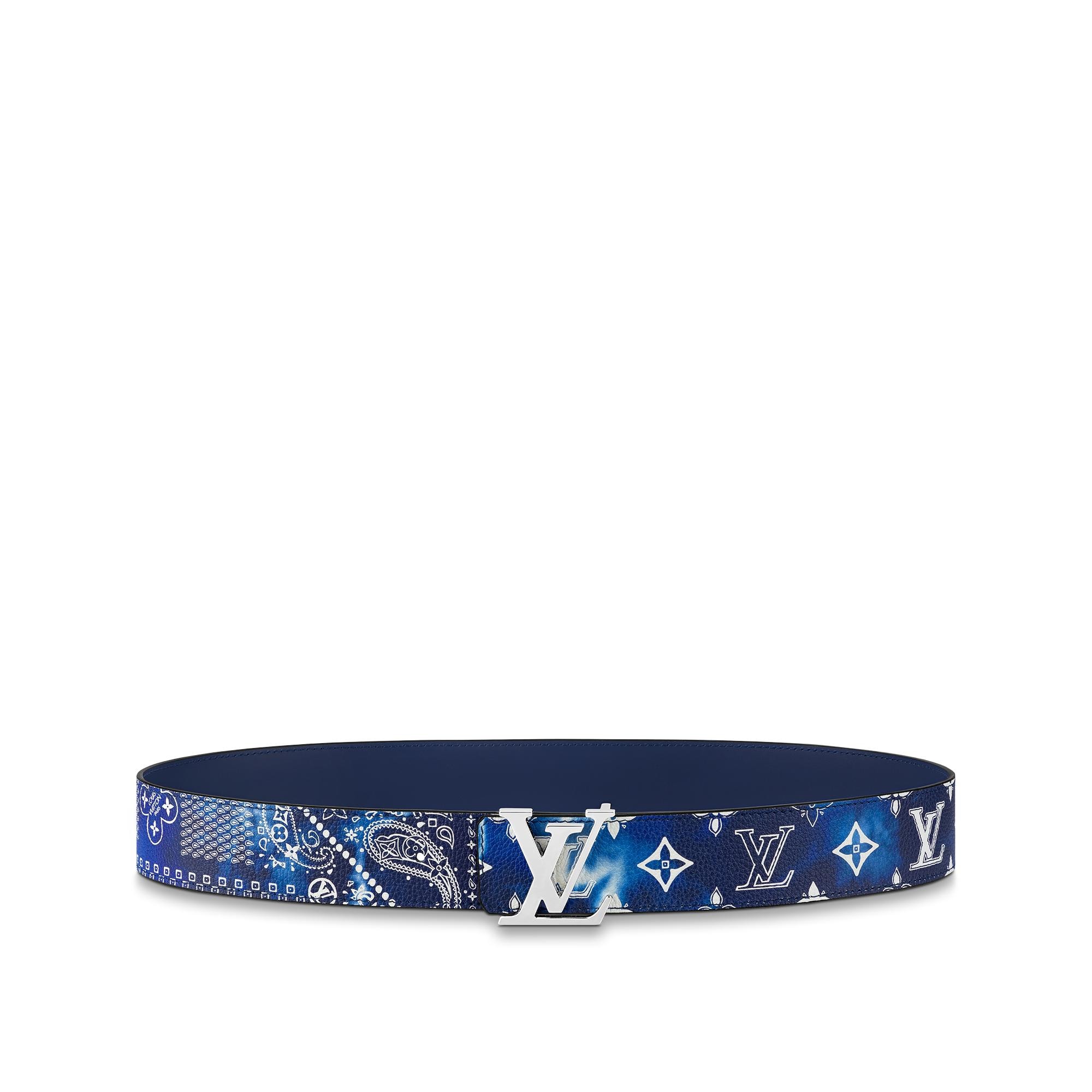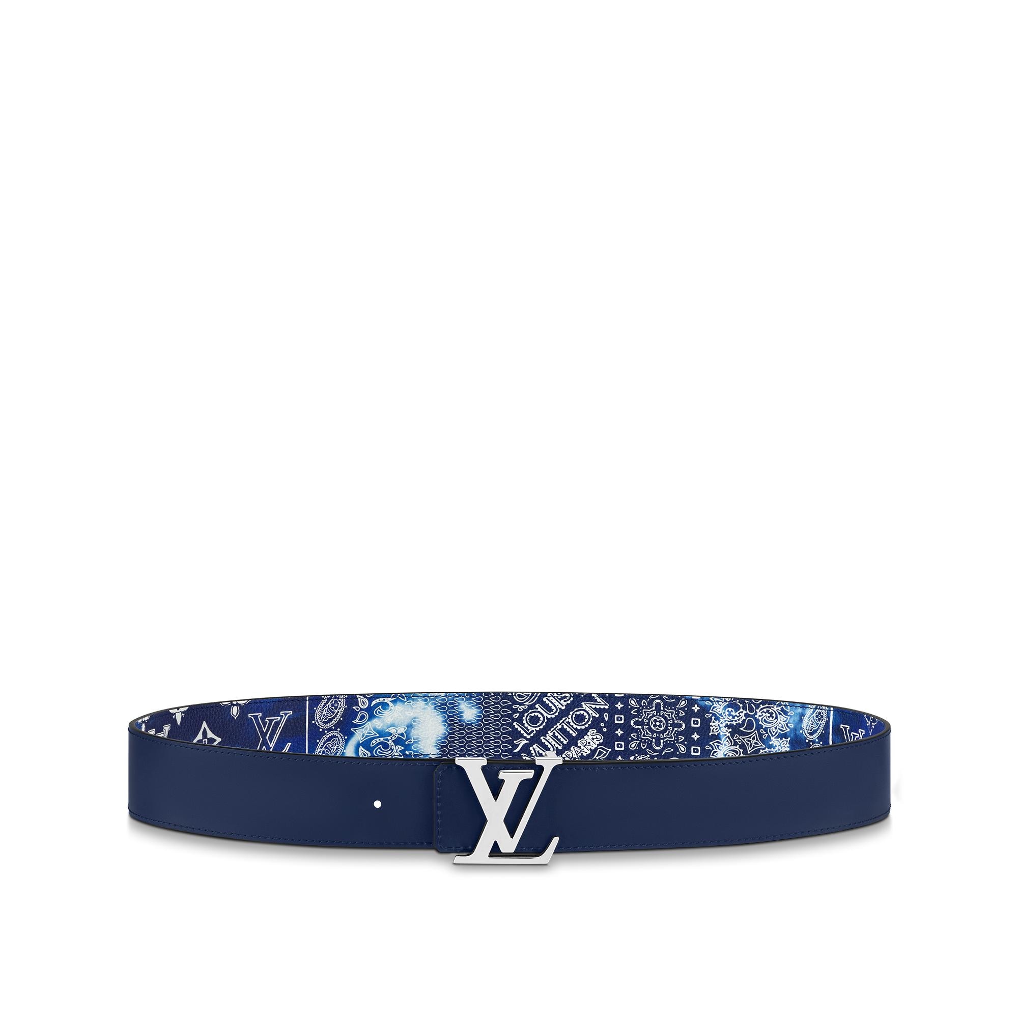 The LV Initials MNG Bandana 40mm Reversible Belt offers a bold twist on a classic House style. One side of the accessory showcases the lively Monogram Bandana canvas as seen throughout the Fall-Winter 2022 Collection, while the other features block-colour calf leather. A gleaming LV Initials buckle secures this versatile accessory. Product details 37.4 x 15.7 inches (length x Width) Width: 40 mm/1.6 inches Blue Monogram Bandana canvas front side Calf leather reverse side Silver-colour hardware LV Initials buckle Made in SpainM0530T Louis Vuitton LV Initials MNG Bandana 40MM Reversible Belt - Men - AccessoriesMen - Accessories - New This Season - LV Initiales MNG Bandana 40MM Reversible Belt