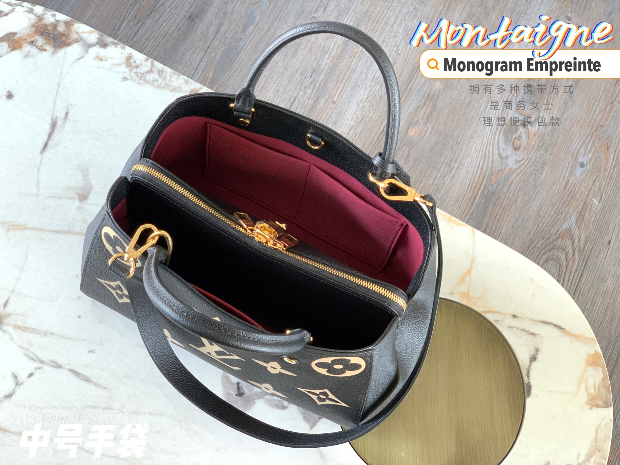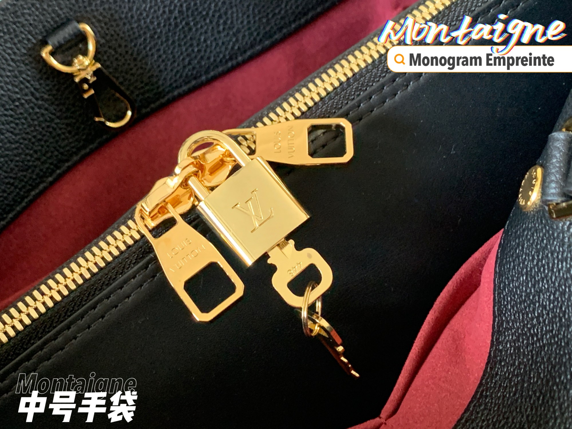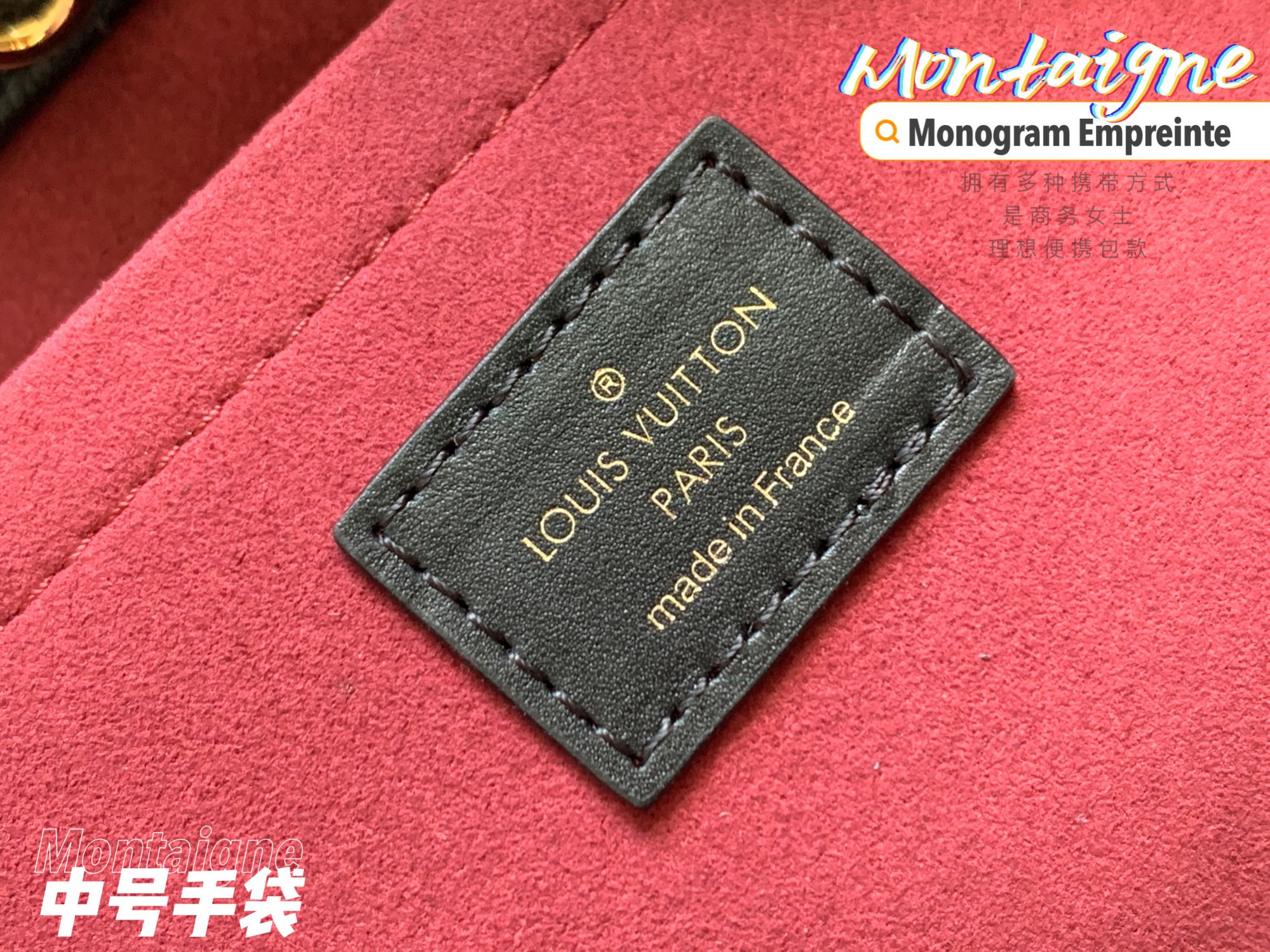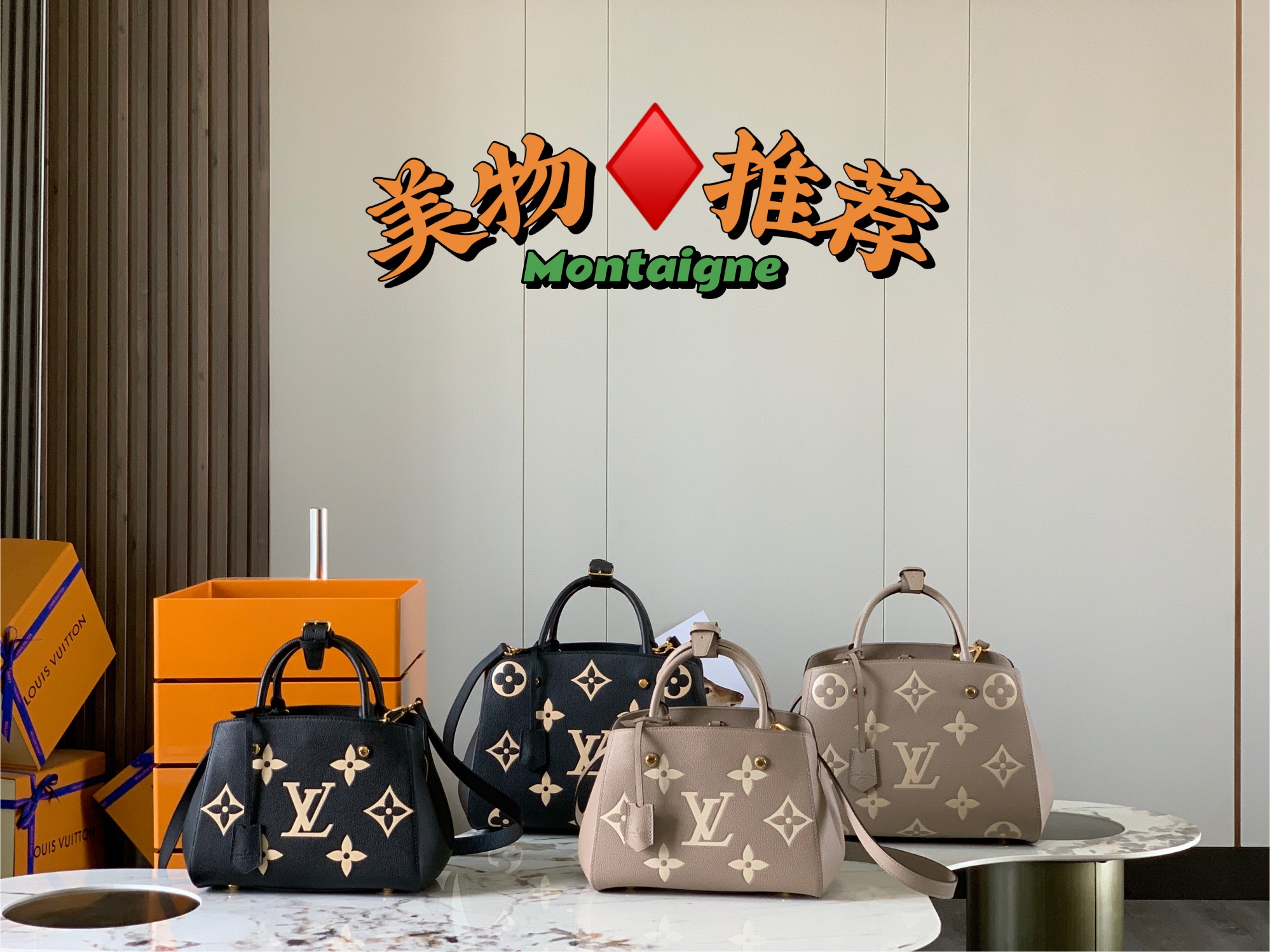 The Montaigne BB handbag is made from grained leather with a medium-sized all-over Monogram motif. The pattern is first printed then embossed into the leather. The result is an eye-catching bag with structured lines, ideal for office to off-duty use. It can be worn over the shoulder, thanks to its detachable strap. 29.0 x 20.0 x 13.0 cm ( length x height x width ) Black/Beige Embossed grained cowhide leather Grained cowhide-leather trim Microfiber lining Gold-color hardware Hook to secure belongings Central zipped compartment 2 wide compartments Inside double pocket Inside flat pocket Key bell 4 protective metal base feet Strap: Removable, not adjustable Strap Drop: 55.0 cm Handle: Double This reference is either Made in France, Spain, Italy or in the US. M45489 Tourterelle/Cream M45778 Black/Beige Your browser does not support the video tag.