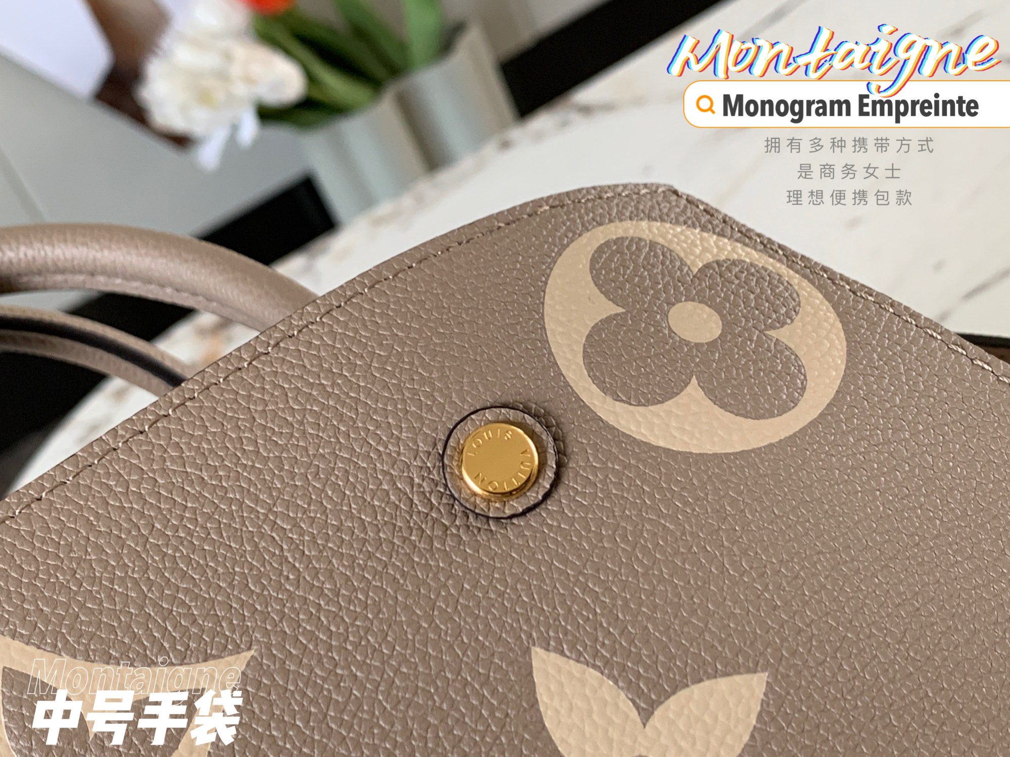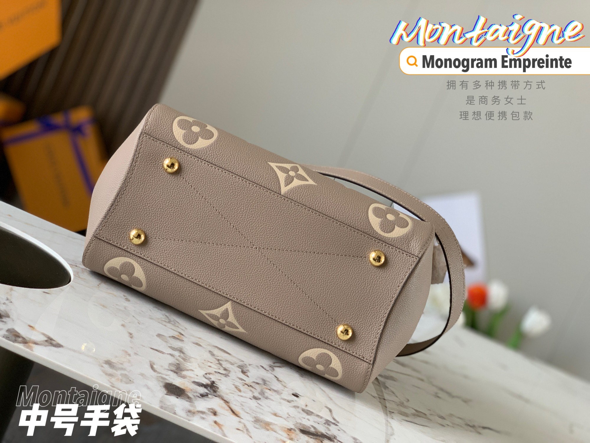 The Montaigne BB handbag is made from grained leather with a medium-sized all-over Monogram motif. The pattern is first printed then embossed into the leather. The result is an eye-catching bag with structured lines, ideal for office to off-duty use. It can be worn over the shoulder, thanks to its detachable strap. 29.0 x 20.0 x 13.0 cm ( length x height x width ) Tourterelle Gray/Cream Embossed grained cowhide leather Grained cowhide-leather trim Microfiber lining Gold-color hardware Hook to secure belongings Central zipped compartment 2 wide compartments Inside double pocket Inside flat pocket Key bell 4 protective metal base feet Strap: Removable, not adjustable Strap Drop: 55.0 cm Handle: Double This reference is either Made in France, Spain, Italy or in the US. M45489 Tourterelle/Cream M45778 Black/Beige Your browser does not support the video tag.