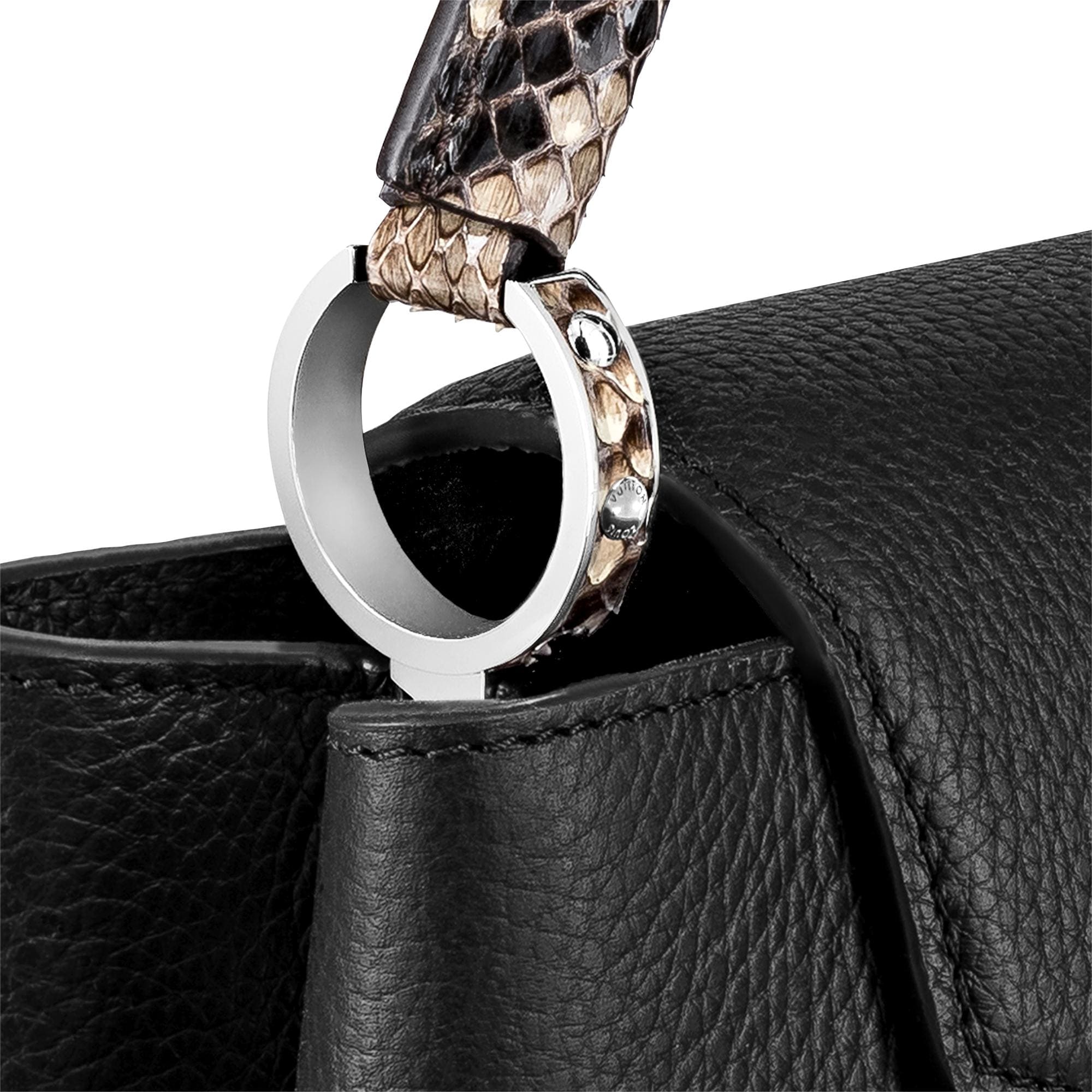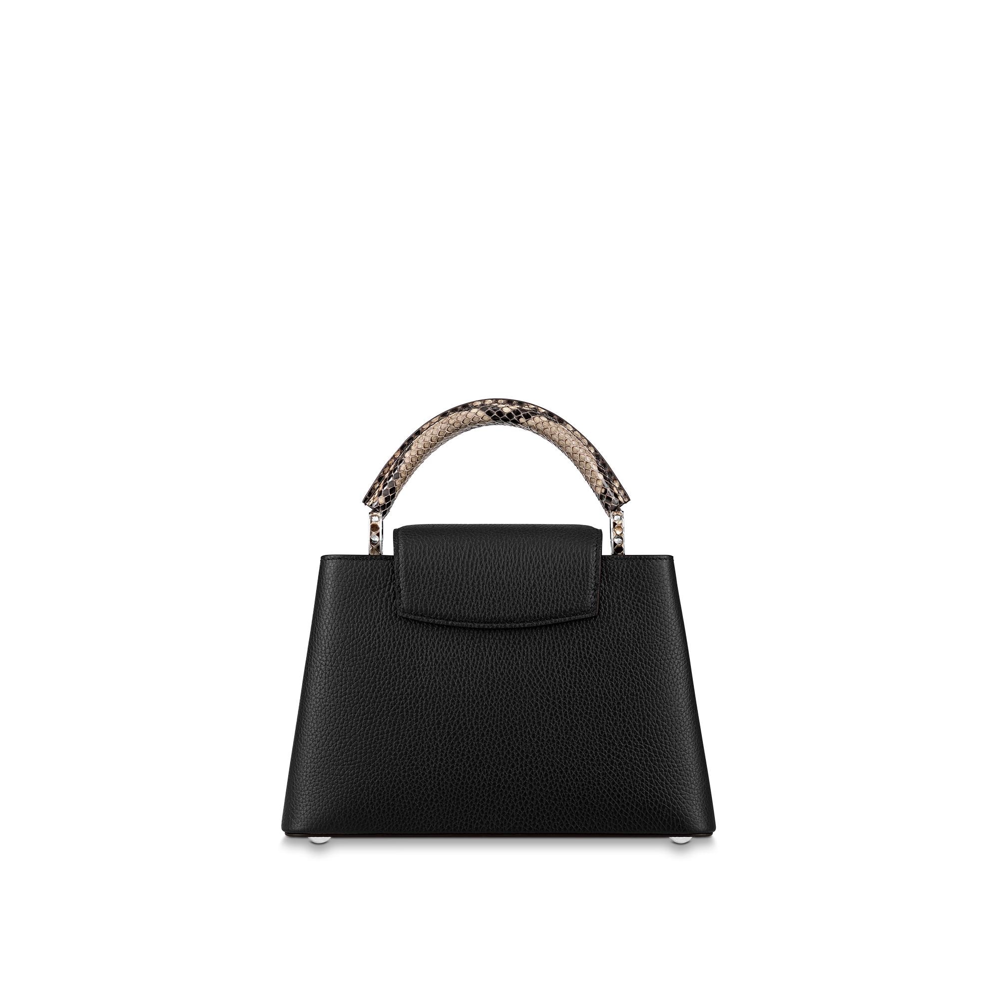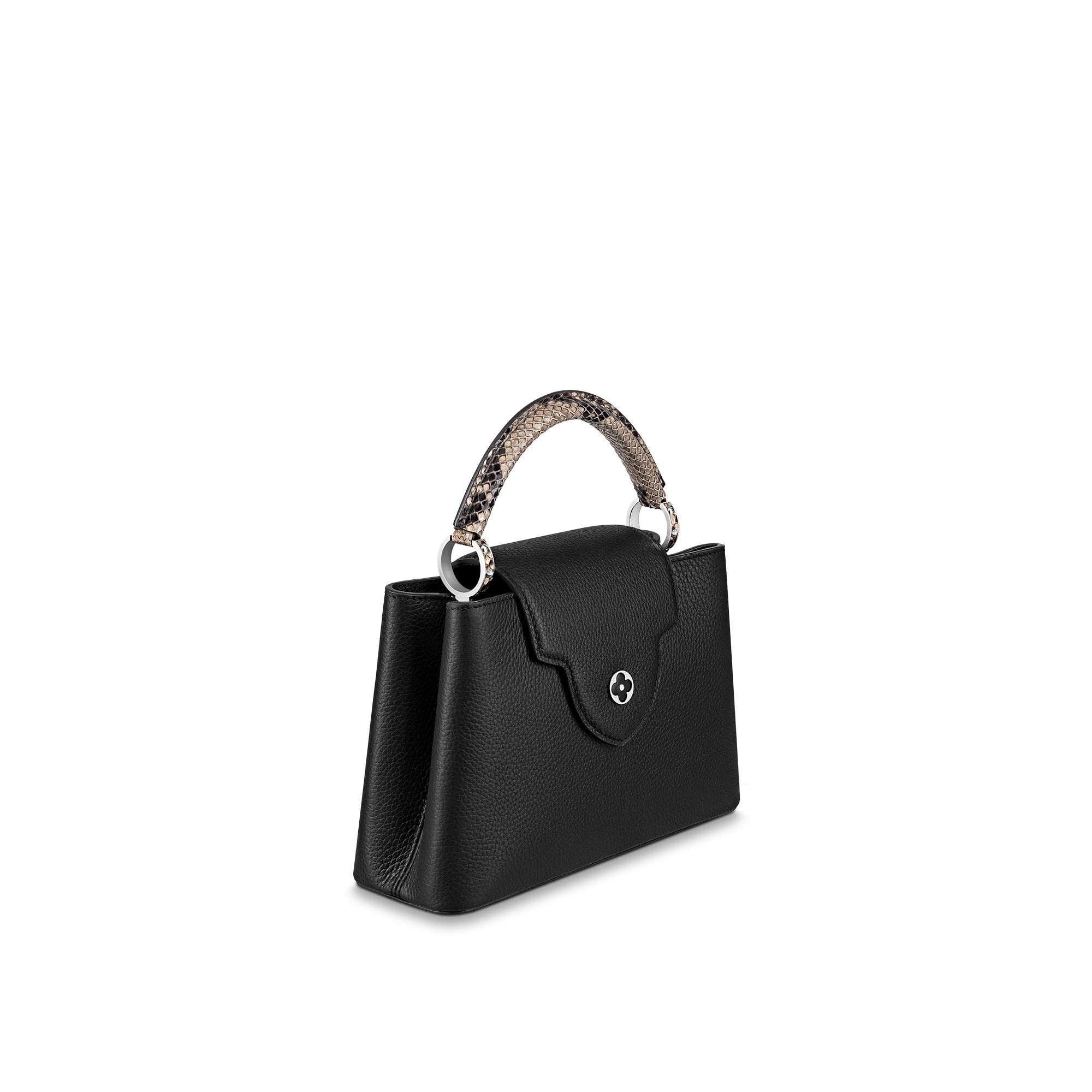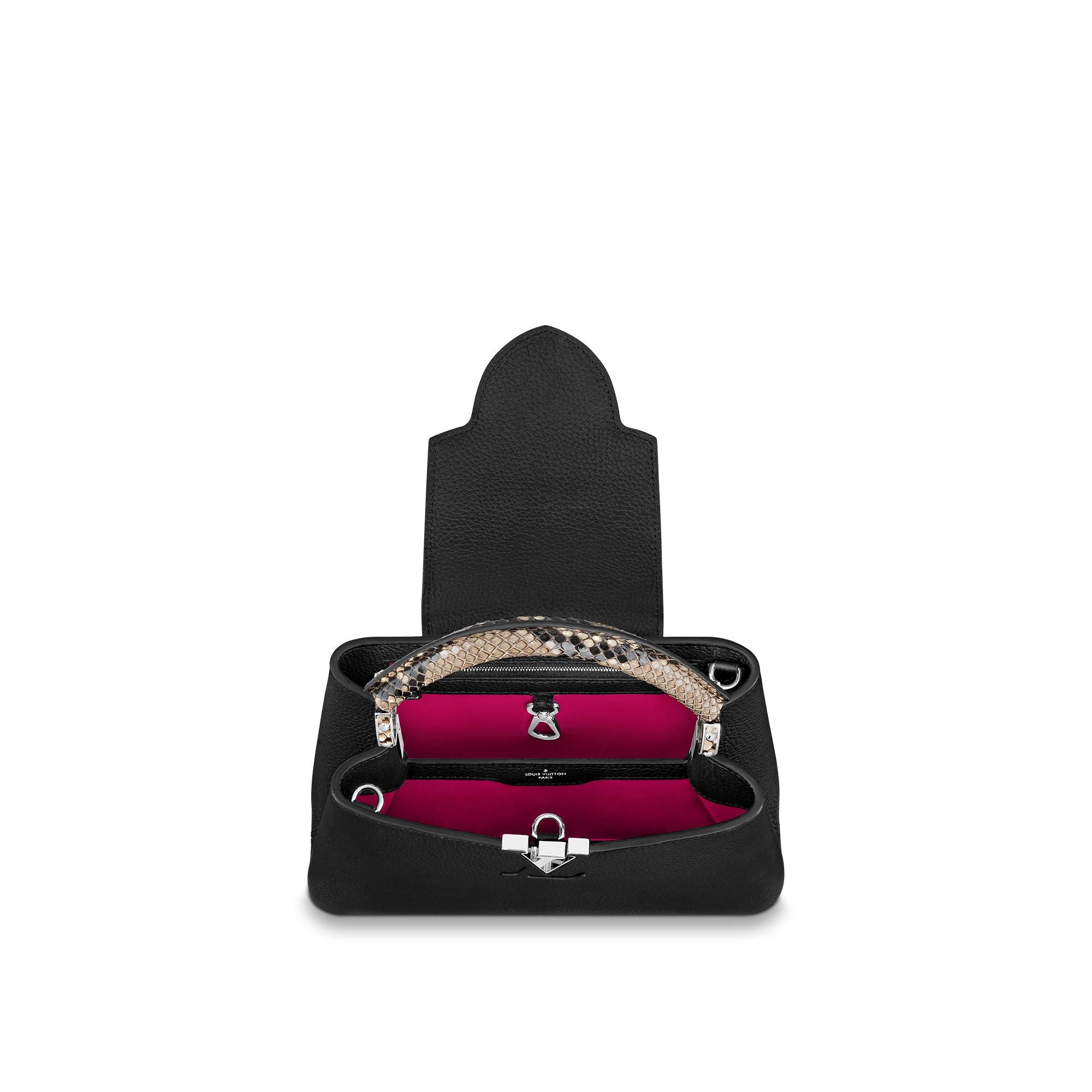 Fashioned from full-grain Taurillon leather, the now-classic Capucines BB handbag displays a host of House signatures: leather-wrapped LV Initials, jewel-like handle mounts inspired by historic trunks, and a distinctive flap with a Monogram Flower motif. This model features a handle crafted from luxe python skin – a sophisticated touch. First launched in 2013, the Capucines is named for the Parisian street where Louis Vuitton first opened shop, in 1854. Product details 27 x 18 x 9 cm (length x height x width ) Black Taurillon leather Taurillon-leather and python-leather trim Cowhide-leather lining Silver-color hardware Snap hook to secure belongings Double carry style: flap inside or outside Compartmented interior with zipped pocket 4 protective metal bottom studs Strap : Removable, adjustable Strap Drop : 48.0 cm Strap Drop Max. : 53.0 cm Handle : Single The reference is either made in France, Spain, Italy or in the US. N92040 NoirLouis Vuitton Capucines BB Python Leather - HandbagsLOUIS VUITTON Women - Handbags - Iconic Bags - Capucines BB