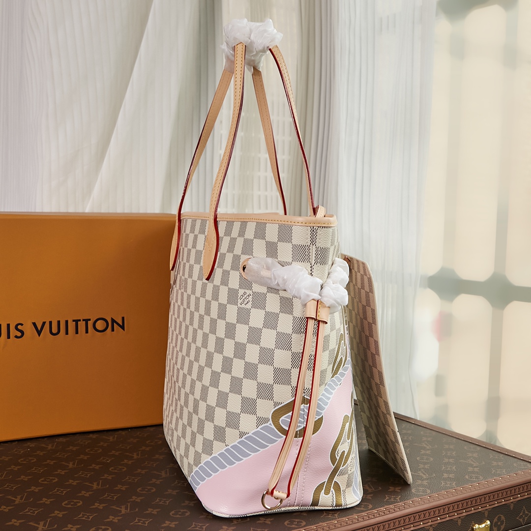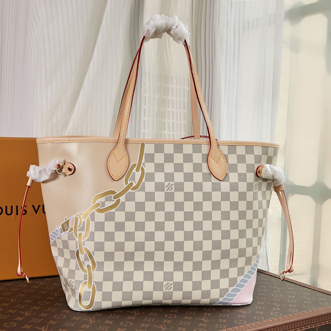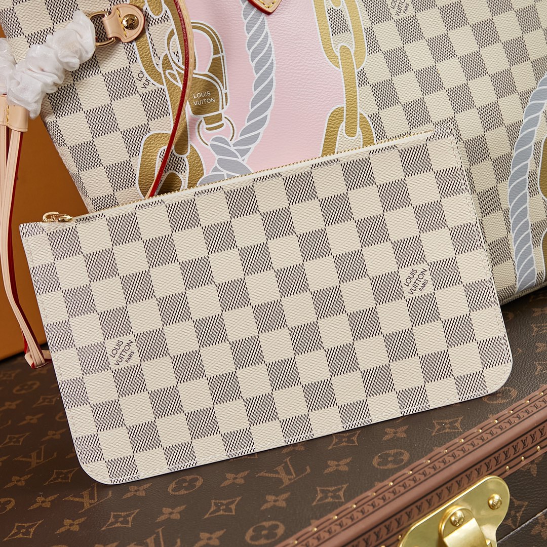 This Neverfull MM tote bag is made from Damier Azur coated canvas customized with a bold five-color nautical print of ropes and chains, bringing a fresh twist to the classic checkerboard pattern. This versatile bag features side laces that can be cinched for a sleeker silhouette or loosened for a more casual look. Product details 12.2 x 11 x 5.5 inches (length x Height x Width) Damier Azur coated canvas Natural cowhide-leather trim Textile lining Gold-color hardware 4 side laces Hook closure Flat, textile-lined zipped inside pocket Removable zipped pouch D-ring Handle:Double This reference is either Made in France, Spain, Italy or in the US. N40471 Louis Vuitton Neverfull MM Damier Azur - Women - Handbags Women - Handbags - Totes - Neverfull MM