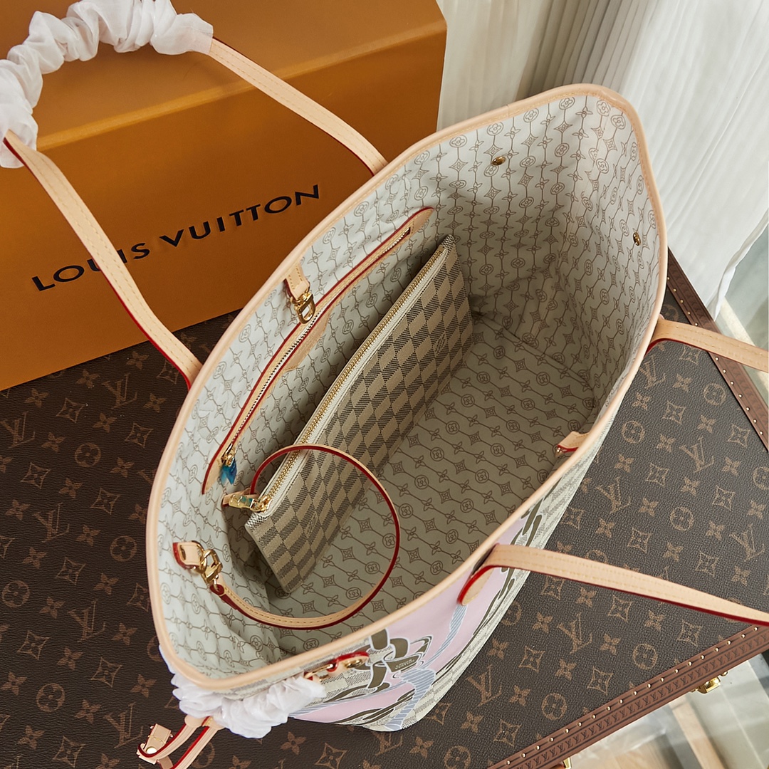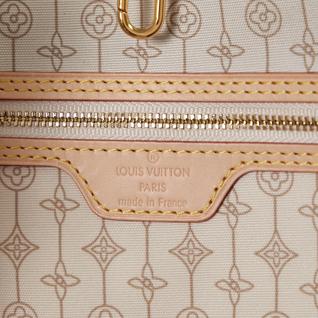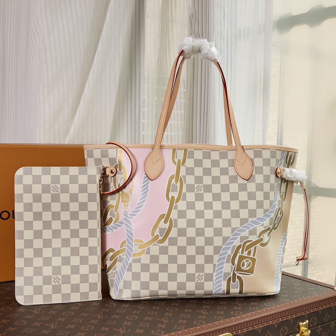 This Neverfull MM tote bag is made from Damier Azur coated canvas customized with a bold five-color nautical print of ropes and chains, bringing a fresh twist to the classic checkerboard pattern. This versatile bag features side laces that can be cinched for a sleeker silhouette or loosened for a more casual look. Product details 12.2 x 11 x 5.5 inches (length x Height x Width) Damier Azur coated canvas Natural cowhide-leather trim Textile lining Gold-color hardware 4 side laces Hook closure Flat, textile-lined zipped inside pocket Removable zipped pouch D-ring Handle:Double This reference is either Made in France, Spain, Italy or in the US. N40471 Louis Vuitton Neverfull MM Damier Azur - Women - Handbags Women - Handbags - Totes - Neverfull MM