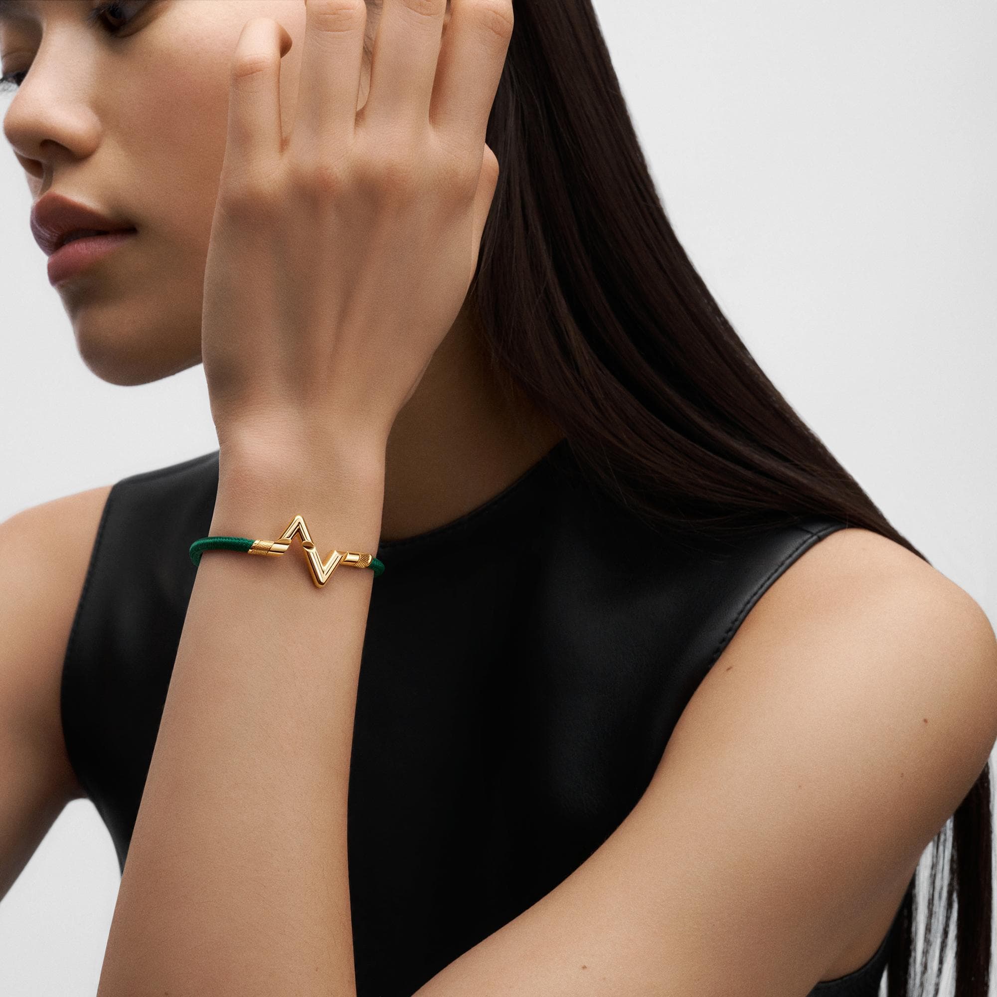 The LV Volt Play bracelet features the iconic L and V initials fused in a design that pulses with energy. Cast from 18-karat yellow gold, the jewel fastens securely onto a colorful, interchangeable cord which is offered in four lively hues. This unisex bracelet can be styled solo, in multiples, mixed or matched with other pieces from the collection.