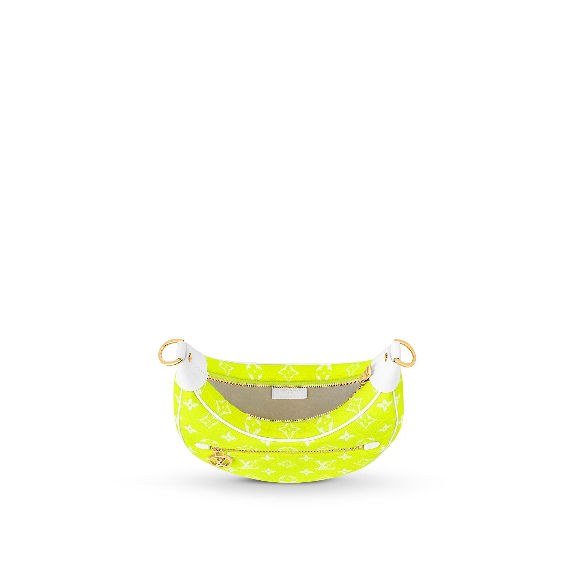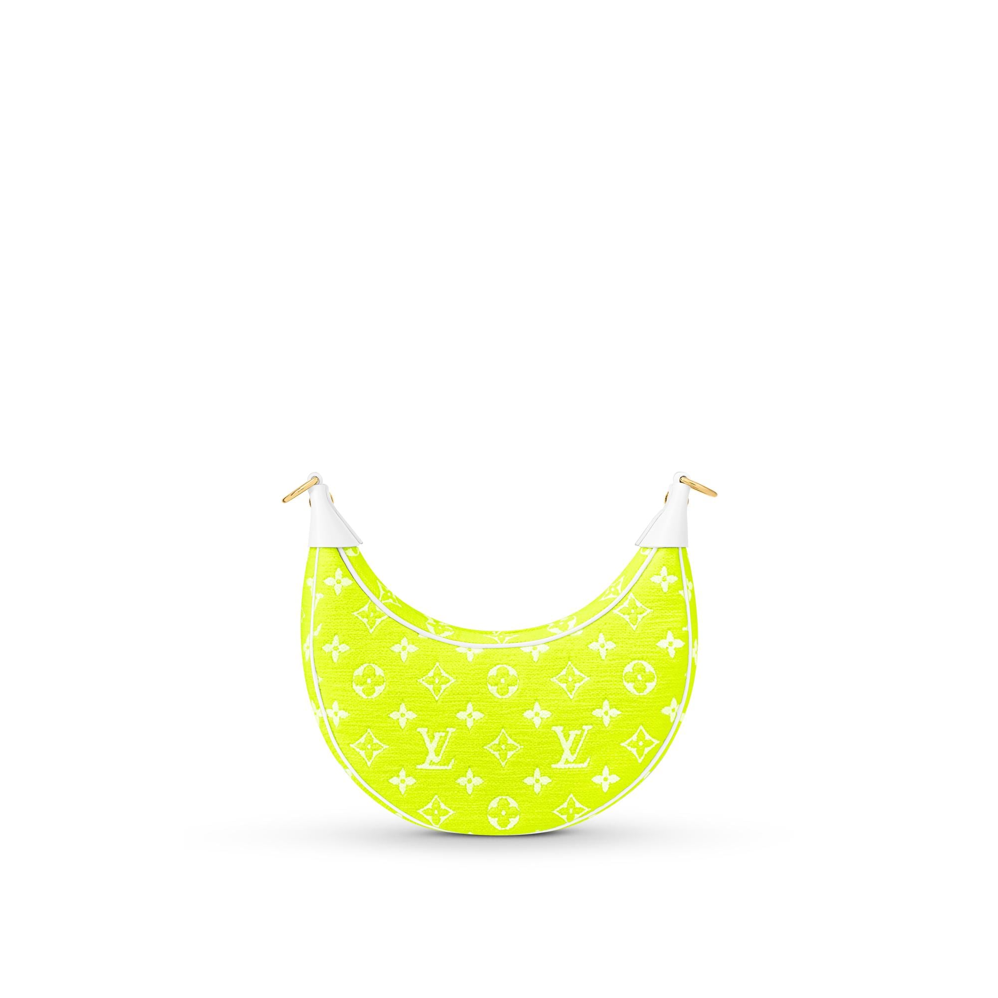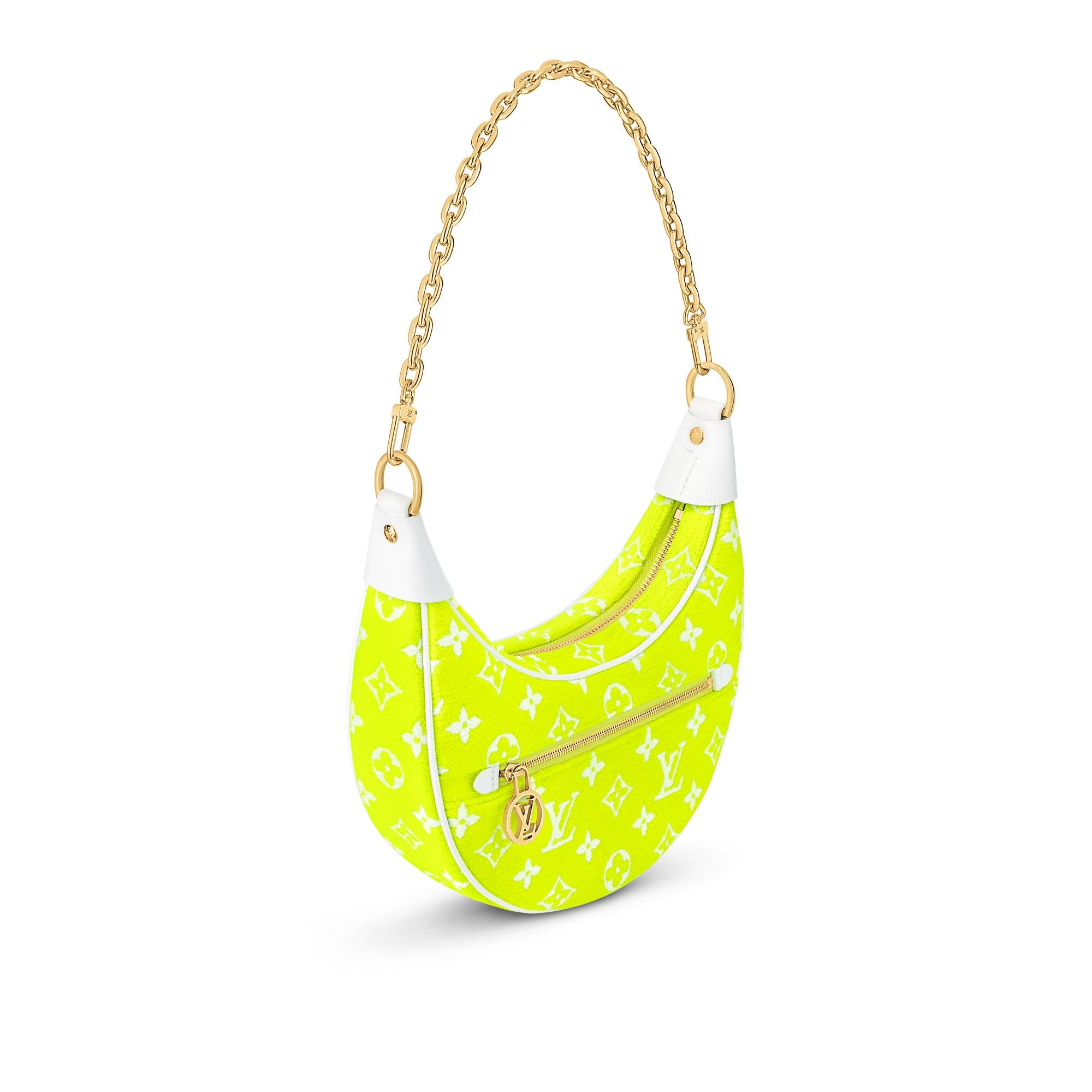 The Loop half-moon baguette bag is fashioned from Monogram jacquard velvet in a bright yellow color, reminiscent of the iconic yellow of tennis balls. The jacquard velour is a 100% sustainable material made from recycled yarn. Product details 9.1 x 5.1 x 2.4 inches (length x Height x Width) Yellow Monogram jacquard velvet Cowhide-leather trim Microfiber lining Pale-gold-color hardware Front zipped pocket with a LV Circle zip pull Zip closure Strap:Removable, adjustable Strap drop: 13.8 inches Strap drop max: 19.7 inches Chain:Removable Chain drop: 9.8 inches This reference is either Made in France, Spain, Italy or in the US.M81484 Louis Vuitton Loop Autres Toiles Monogram - Women - HandbagsWomen - Handbags - All Collections - Loop