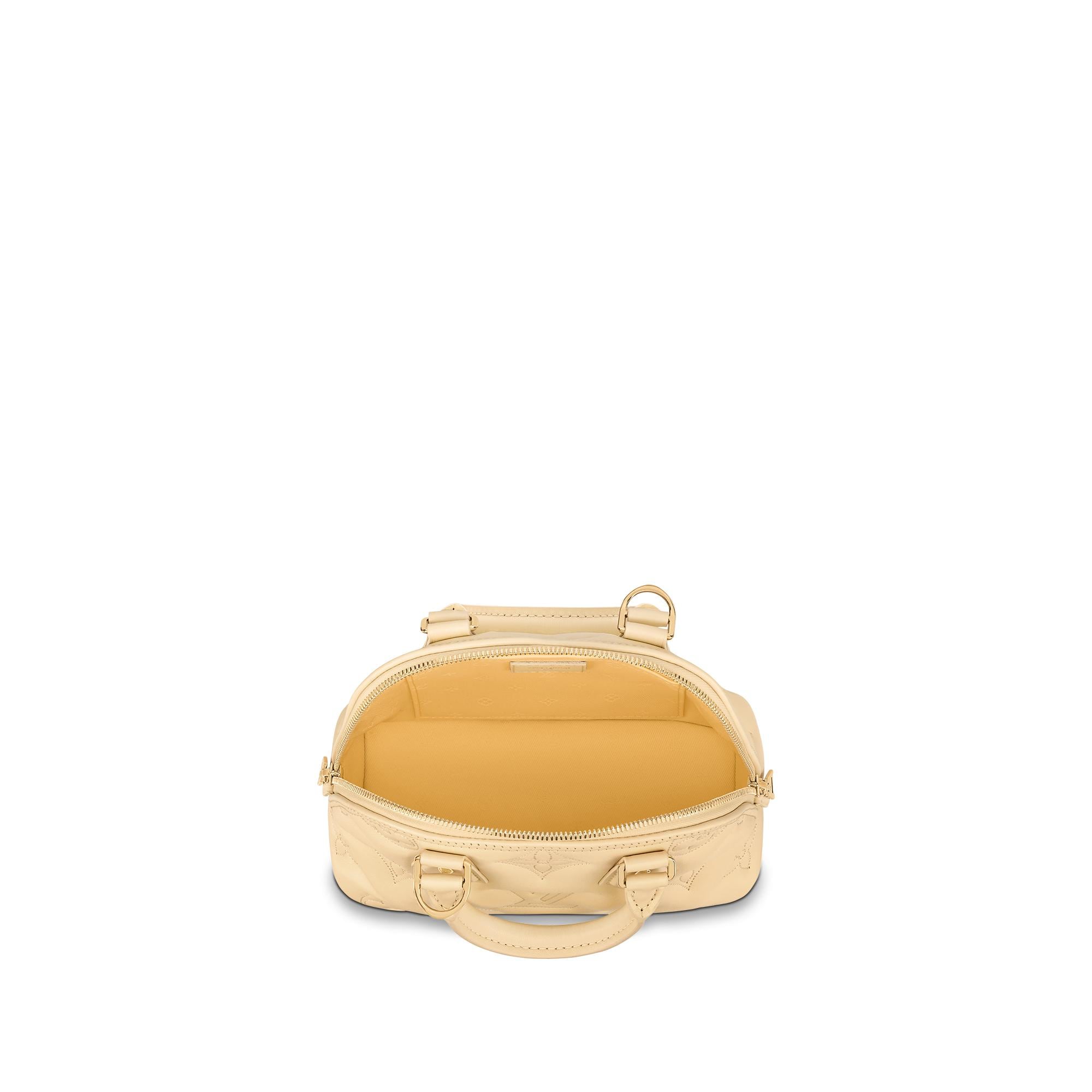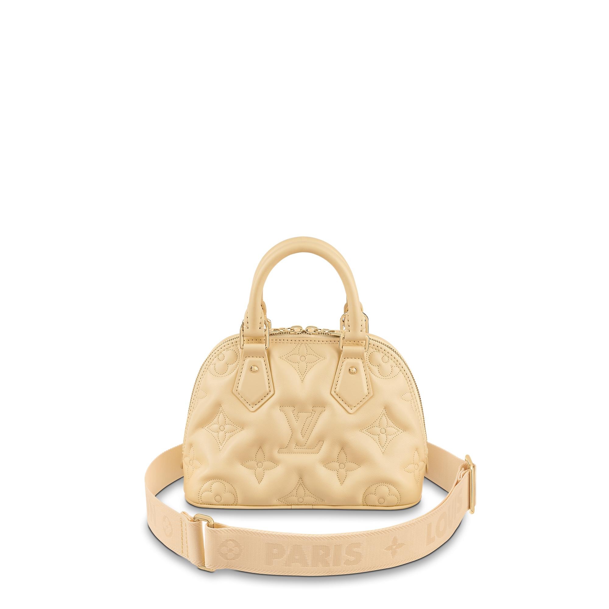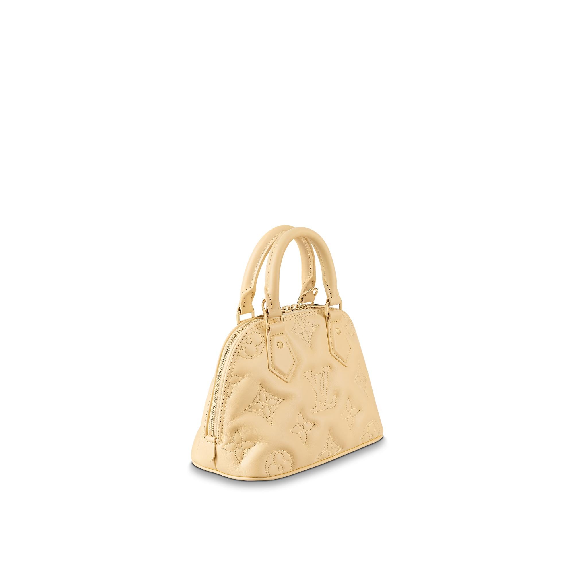 Made from quilted calfskin embroidered with the Monogram motif, the Alma BB handbag is the direct descendant of the Art Deco original from the 1930s. Crafted details like the two rolled-leather top handles complement the puffy leather. Equipped with a removable and adjustable strap, this small bag is perfect for cross-body wear in addition to hand carry. Product details 9.6 x 7.1 x 4.7 inches (length x Height x Width) Banana Yellow Quilted and embroidered smooth calf leather Nylon strap Jacquard with Nano Monogram lining Gold-color hardware 2 top handles for hand carry 1 adjustable & removable nylon strap for shoulder or crossbody carry Double zip closure Inside flat pocket 4 protective bottom studs Strap:Removable, adjustable Strap drop: 16.5 inches Strap drop max: 23.6 inches Handle:Double This reference is either Made in France, Spain, Italy or in the US.M59793 Black M59821 Banana M59822 Blue GlacierLouis Vuitton Alma BB Bubblegram Leather - Women - HandbagsWomen - Handbags - All Collections - Alma BB