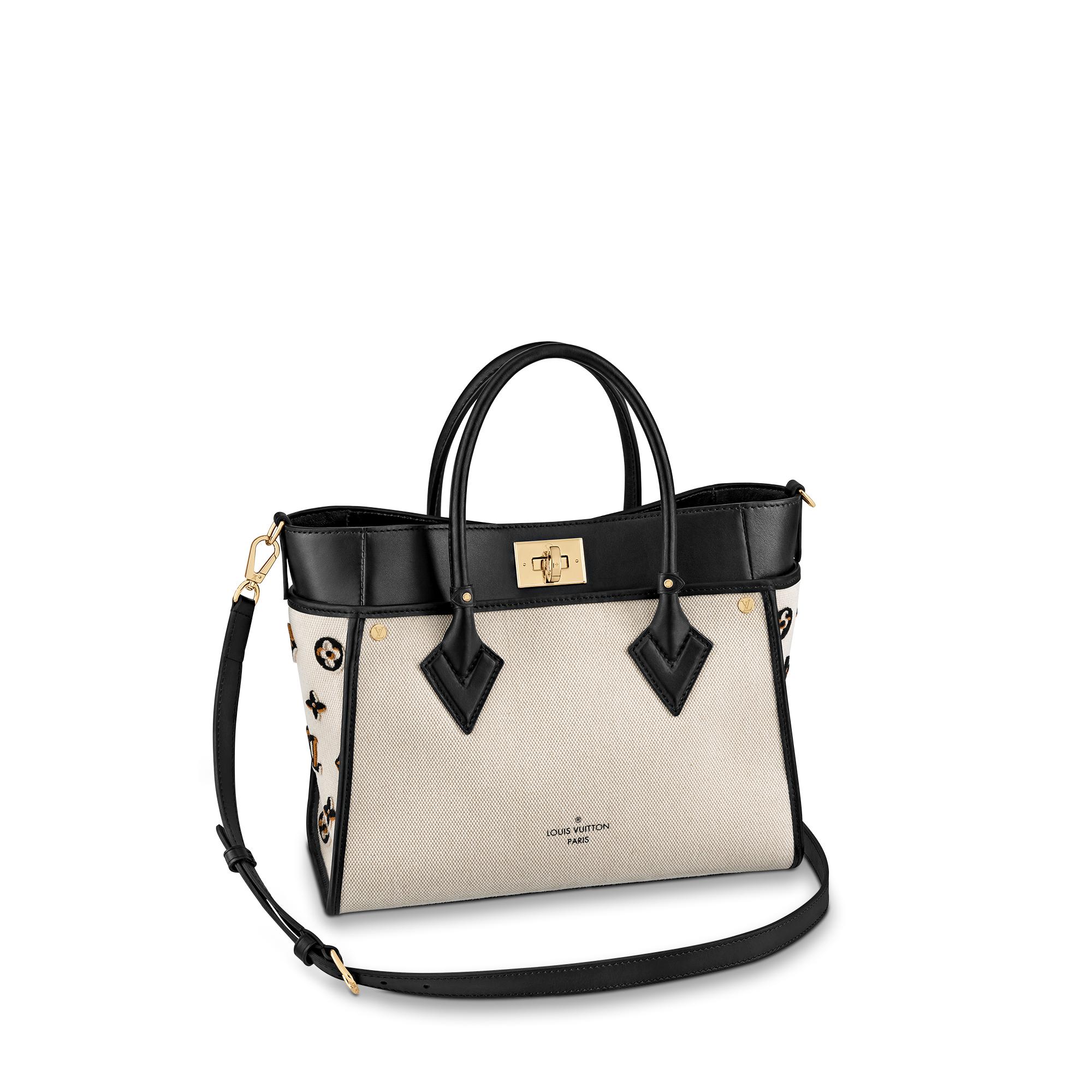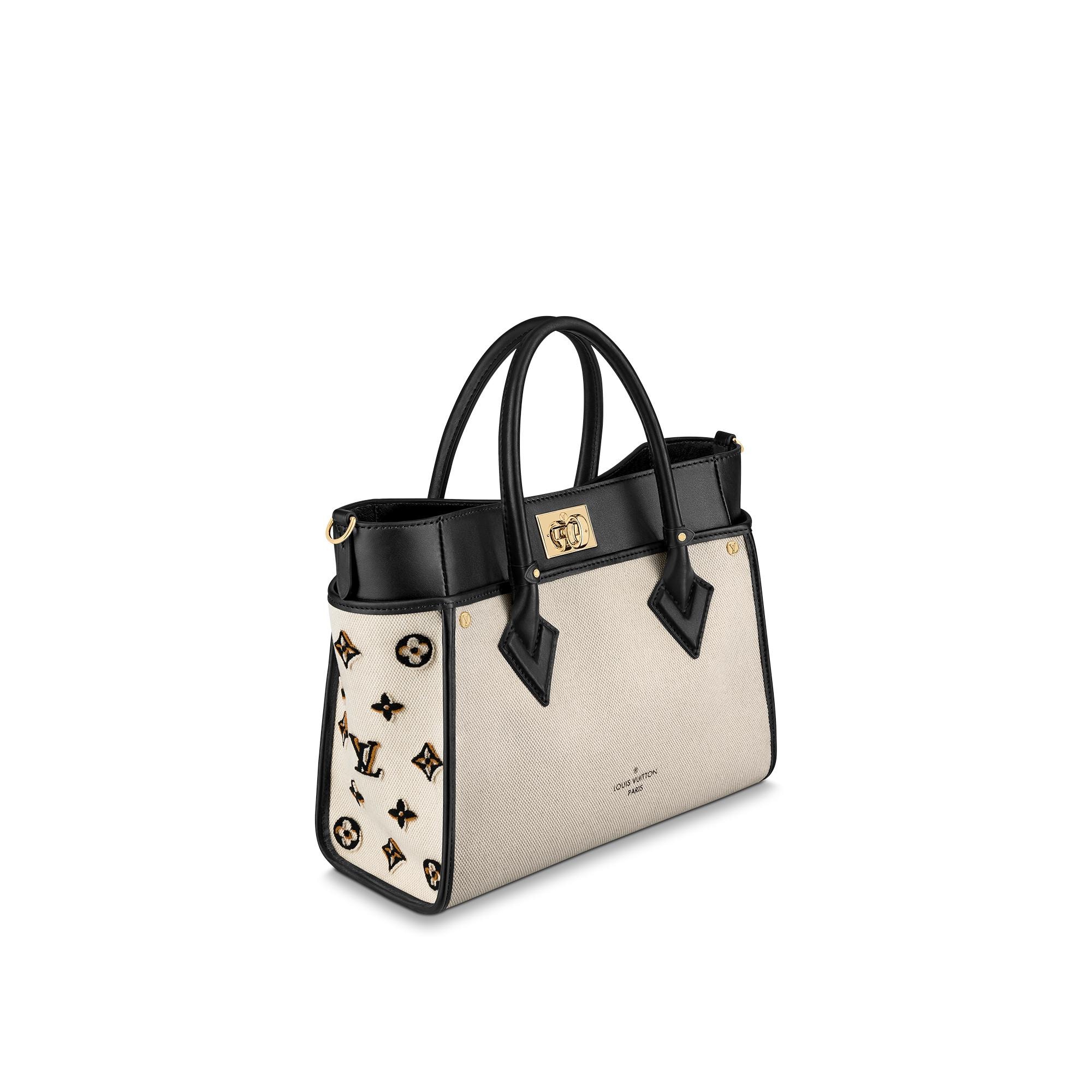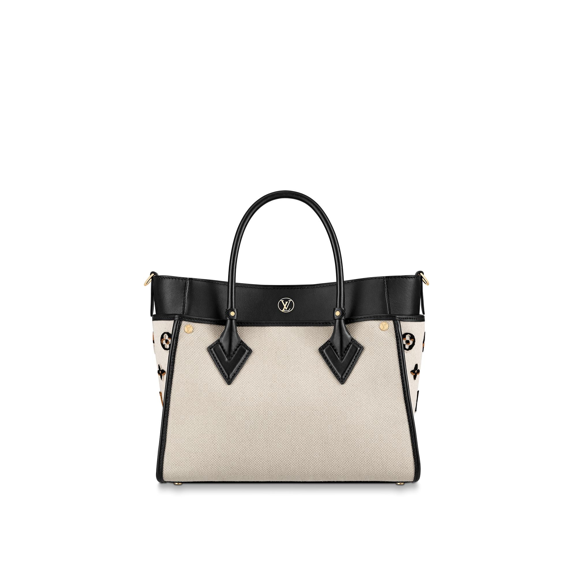 Cream-color canvas is matched with smooth leather trim and top handles on this On My Side MM tote bag for an elegant and summery proposition. Details like Monogram tufting on the gusseted sides and striped-canvas lining complete the design and highlight the signature style of the bag. The large outside pockets and spacious interior can hold everything needed for a day out while the adjustable strap enables cross-body carry. Product details 12 x 9.6 x 5.5 inches (length x Height x Width) Black Canvas and smooth cowhide leather Smooth cowhide-leather trim Canvas lining Gold-color hardware Closure system with hook 2 outside pockets on the side 2 outside pockets (front and back) Double smartphone compartments Zipped pocket 4 protective bottom studs Strap:Removable, adjustable Strap drop: 20.1 inches Strap drop max: 22.0 inches Handle:Double This reference is either Made in France, Spain, Italy or in the US.M59842 On My Side MMLouis Vuitton On My Side MM High End Leathers - Women - HandbagsWomen - Handbags - Shoulder and Cross Body Bags - On My Side MM