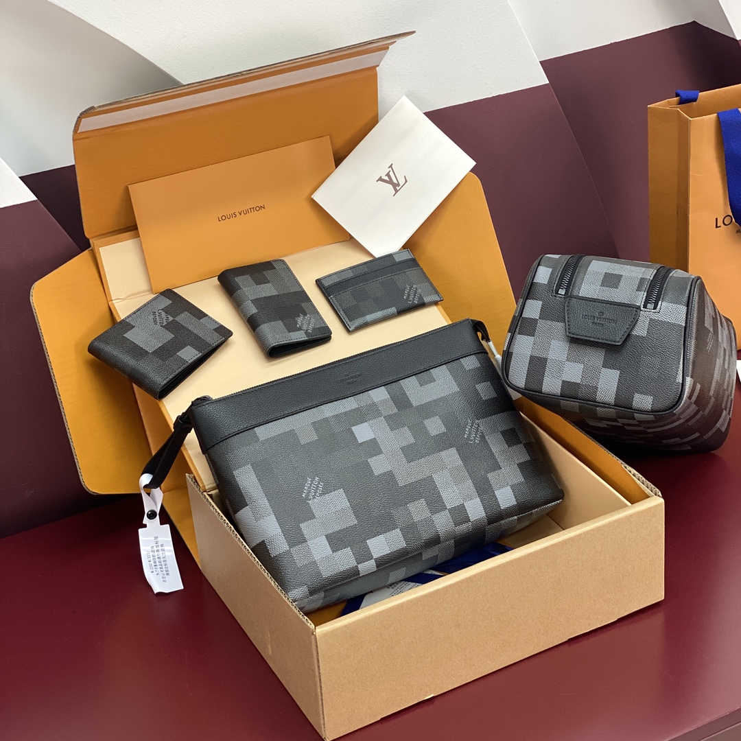 The Pochette Voyage Souple, with its unstructured lines, exudes effortless cool in Damoflage Black coated canvas. This new version of the pixelated Damier checkerboard pattern adds a bold touch to the pouch. In addition to its main zipped compartment, it features a back pocket with a magnetic closure for quick access to essentials. Appearance may vary slightly from photos, depending on the placement of the pattern. Product details 11.8 x 8.3 x 3.0 inches (length x Height x Width)