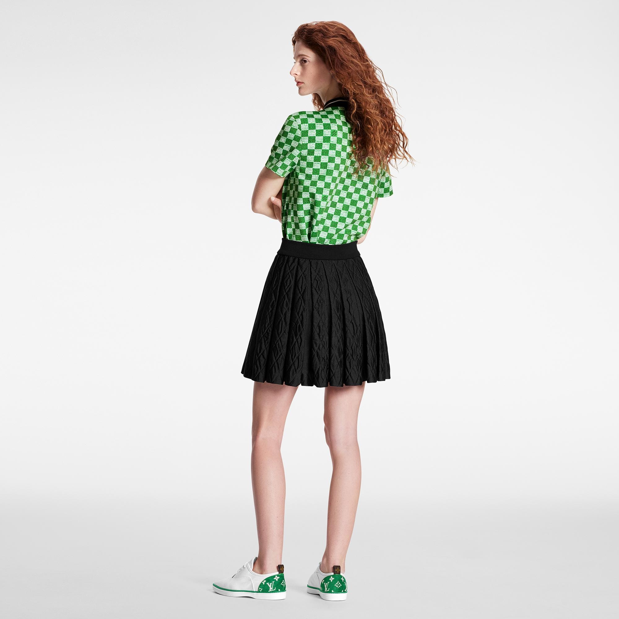 Unexpected texture elevates a classic mini tennis skirt. The LV Match capsule’s wool-blend diamond knit amps up the volume of the pleats, while a pared-back ribbed waistband trims the look for a clean finish and a comfortable fit. Discreetly signed with a rubber Louis Vuitton Vuittamins patch. Product details Length : 47 cm / 18,5 inches Main Material : 52% Polyester, 28% Wool, 19% Polyamide, 1% Elastane Other Material : 100% Polyvinylchloride Black Regular fit Model wears size S Model measurements : Bust 30'' / 76 cm, Height 5' 10" / 176 cm, Waist 23,2" / 59 cm, Hips 34'' / 86 cm Made in Italy Do not wash Do not bleach Do not tumble dry Iron at a maximum sole-plate temperature of 110°C Mild professionnal dry cleaning in hydrocarbons1AA9QR M0Louis Vuitton Diamond Knit Tennis Skirt - Women - Ready-to-WearWomen - Ready-to-Wear - Skirts and Shorts - Diamond Knit Tennis Skirt