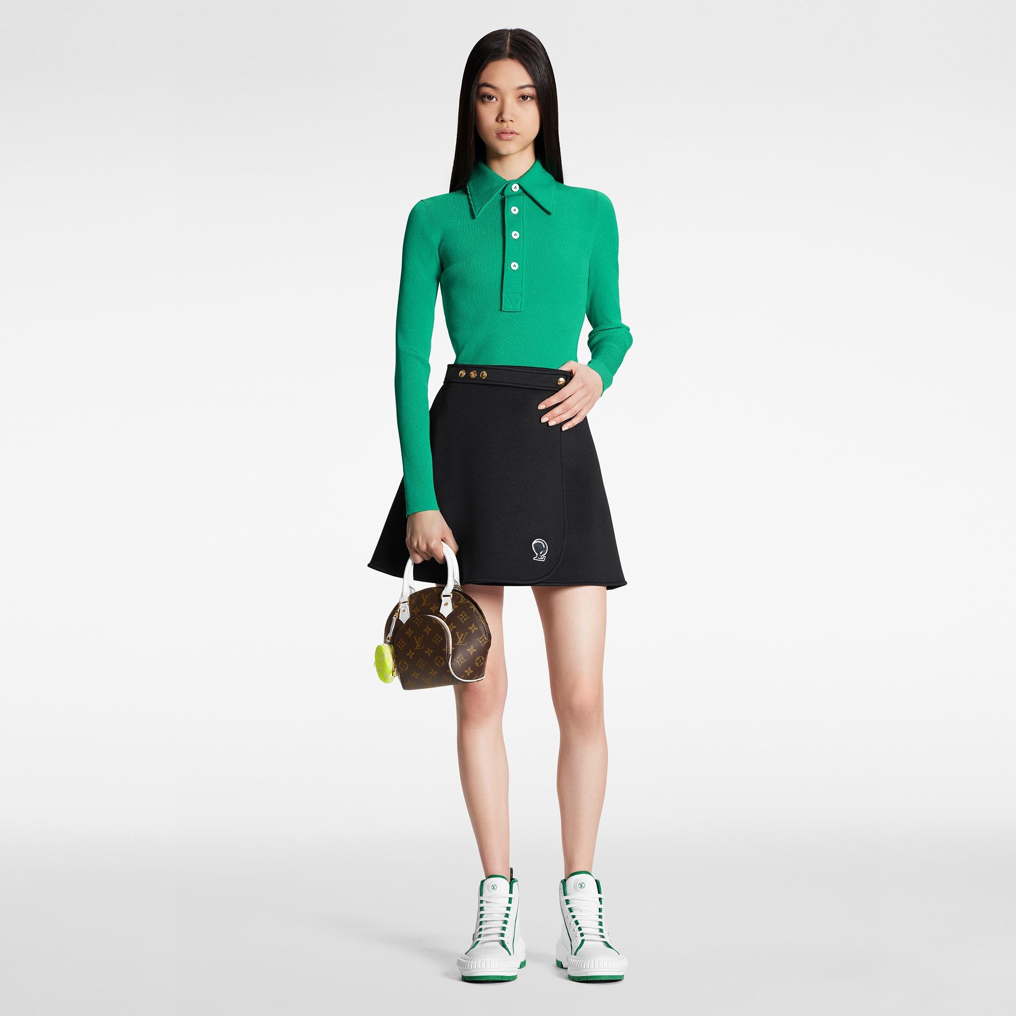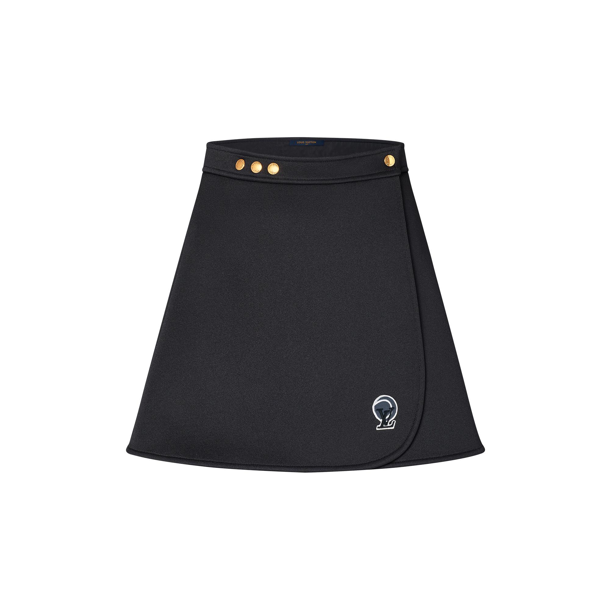 An understated interpretation of the LV Match capsule’s fresh, sporty style. This mini wrap skirt has a clean, structured look in thick cotton-blend double jersey cut in a feminine shape. The waistband is accented with chic brass snap buttons, while the collection’s LV Circle tennis ball patch adds a playful seasonal signature to the front.