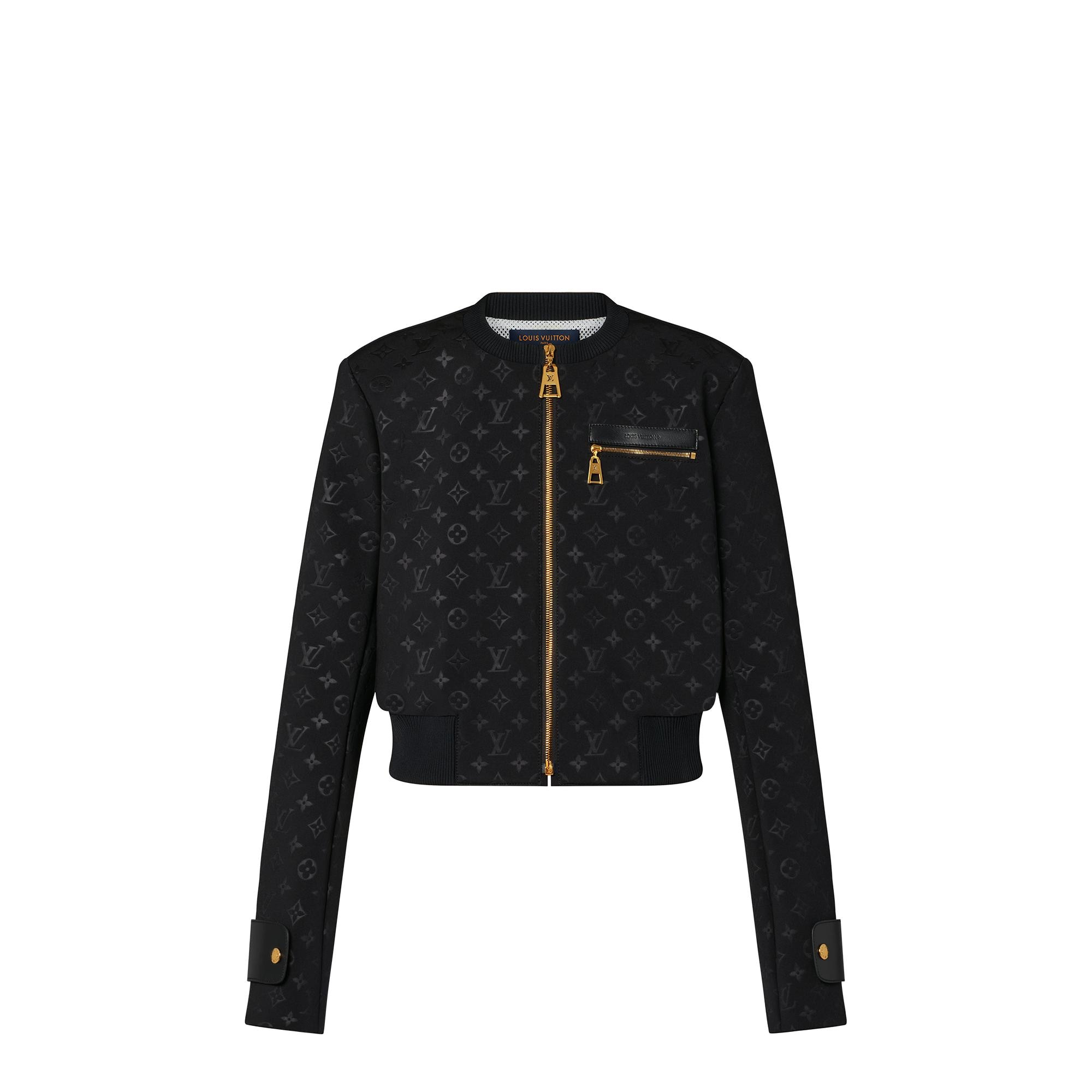 An elegant approach to a timeless bomber jacket. The House’s iconic technical stretch jersey sets a contemporary tone, embossed with the Monogram motif for an understated allover signature. A mesh lining and ribbed details underscore the sporty style while brass hardware and leather accents elevate the look. Complete with a discreet Louis Vuitton patch.
