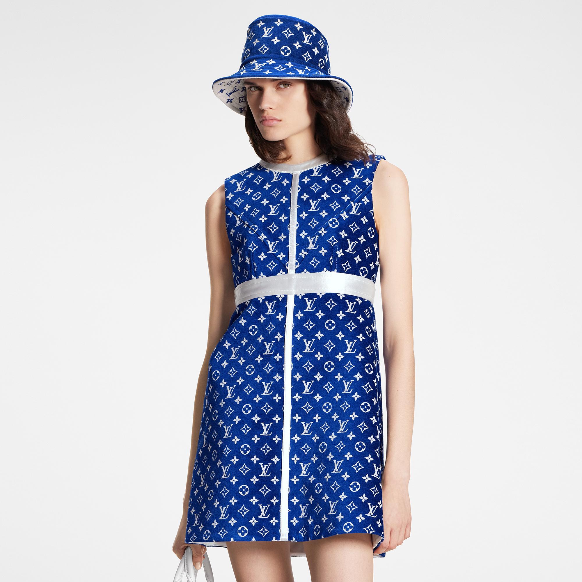 This chic A-line dress pays homage to the US Open in a rich royal blue colorway of the LV Match capsule’s signature Monogram toweling. Contrast satin inserts define a feminine figure and nod to the distinctive markings on a tennis court. An exposed back zipper completes the look with a contemporary detail.