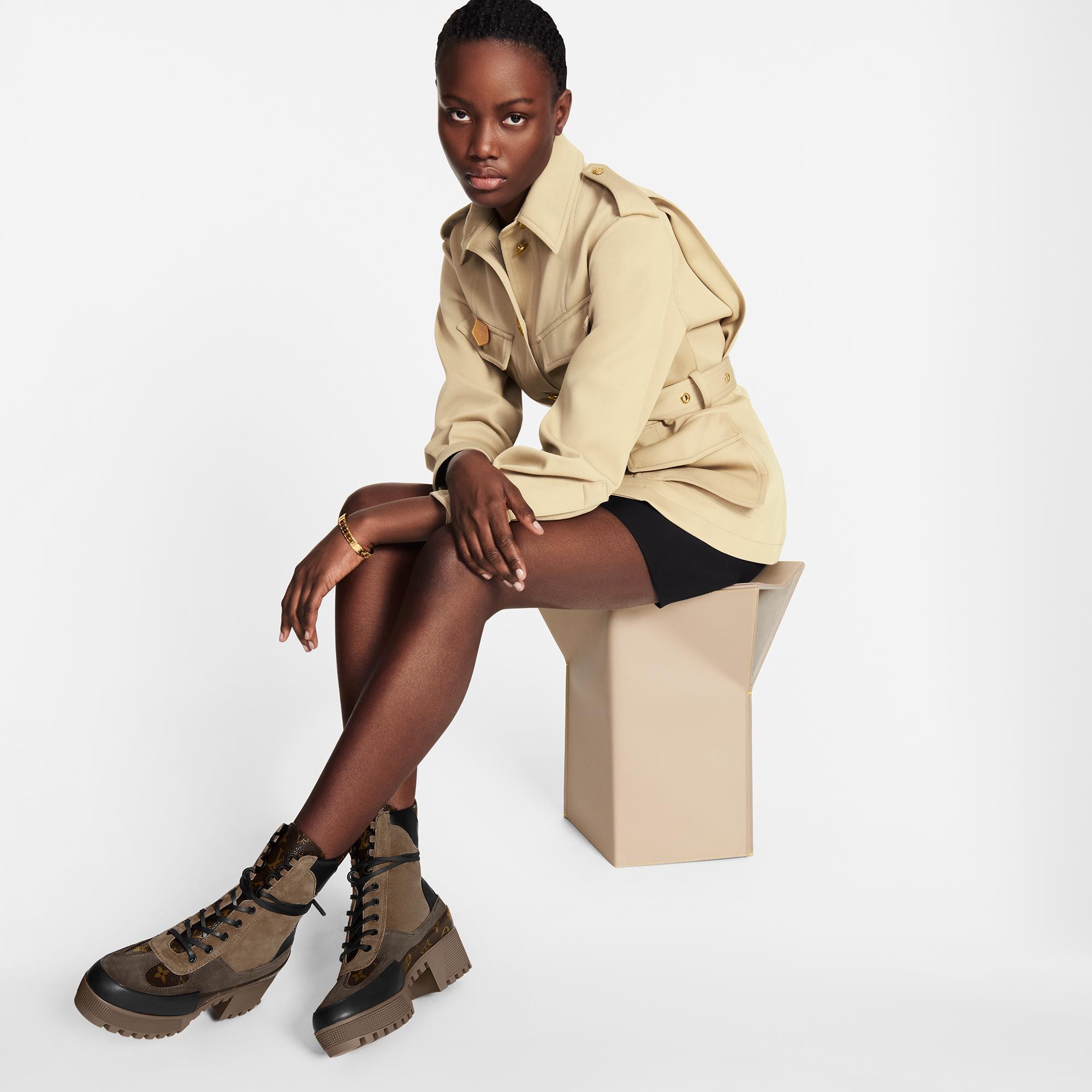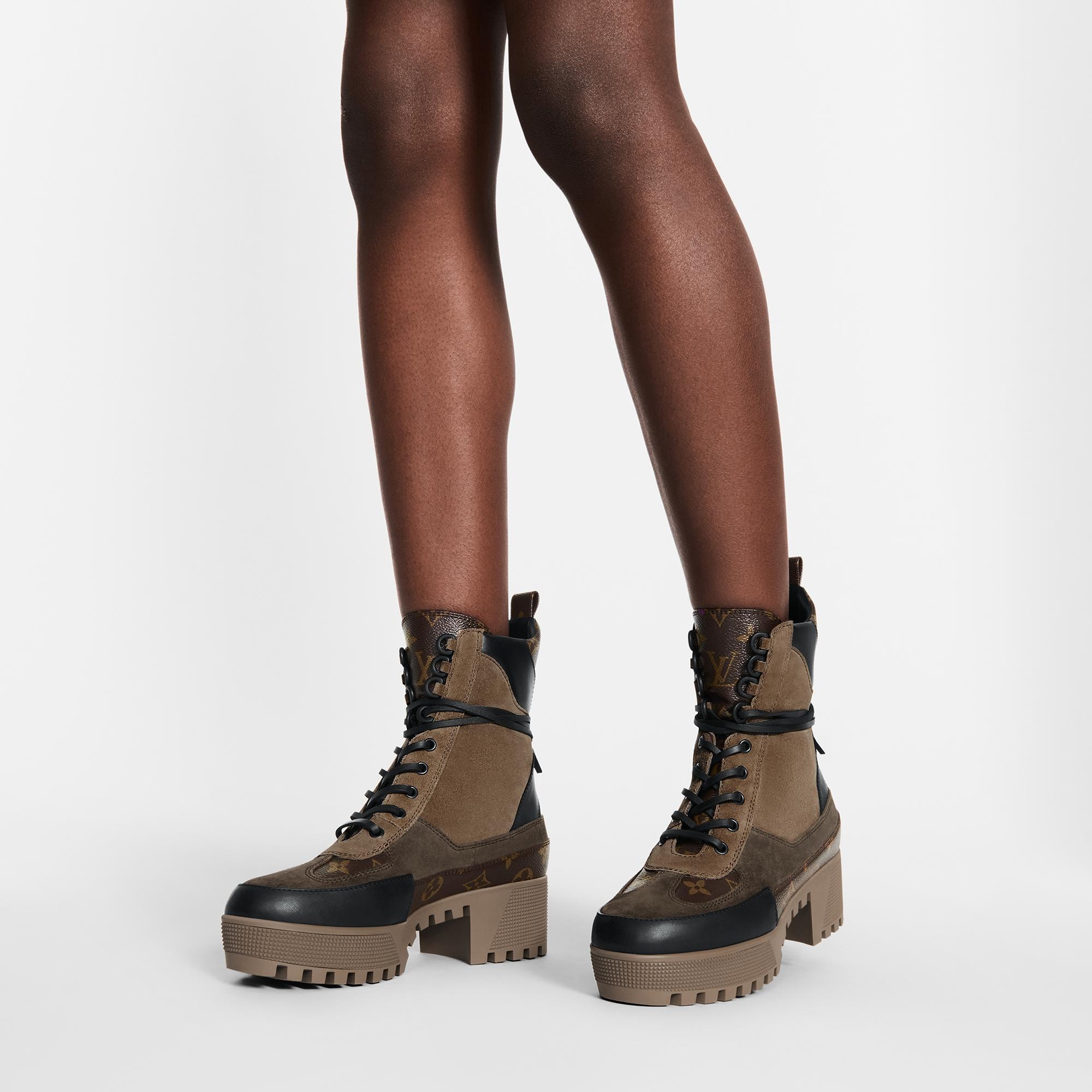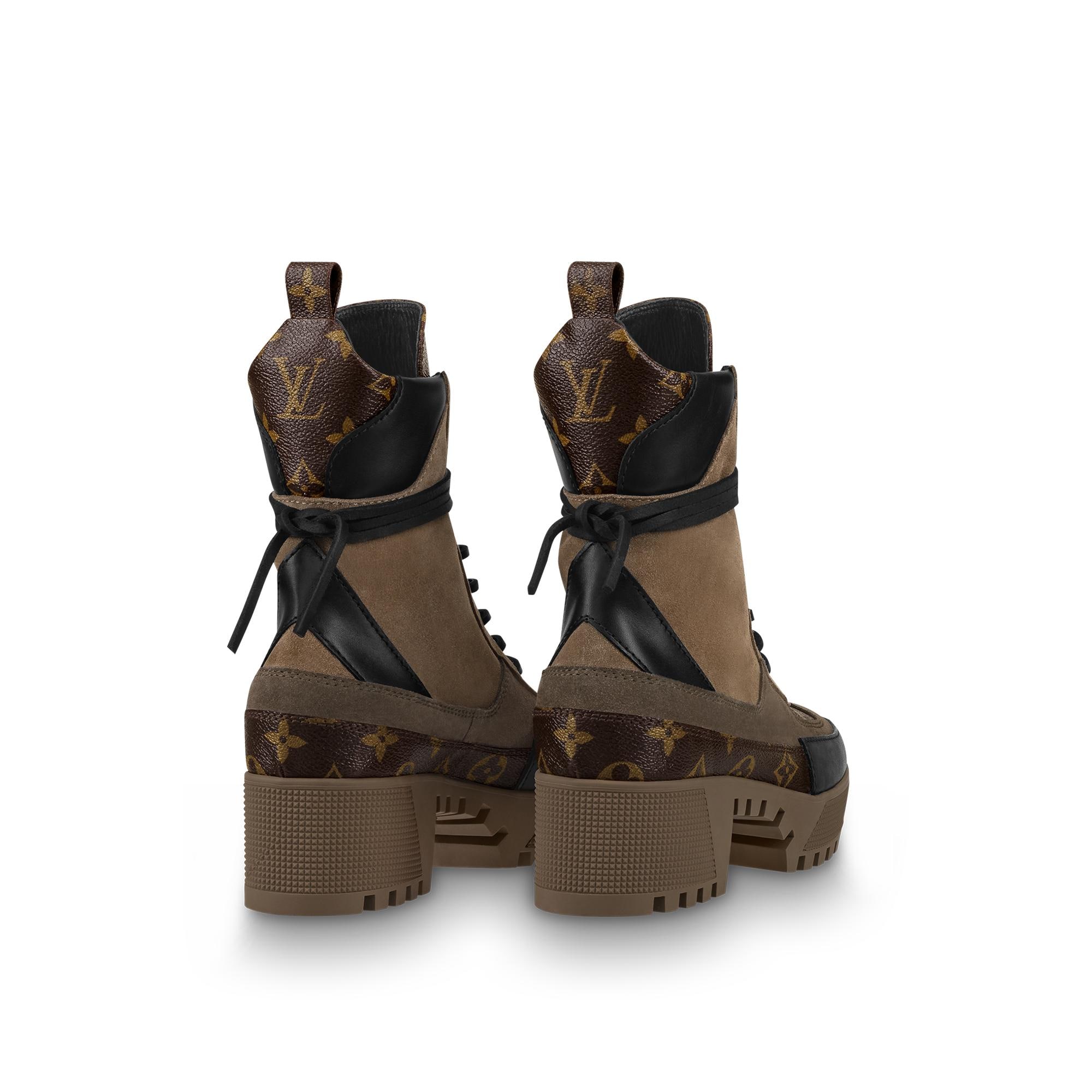 With its wrap-around leather laces, platform construction and treaded rubber outsole, the Laureate desert boot is one of Louis Vuitton's most recognizable styles. Crafted from soft suede calf leather with trim in iconic Monogram canvas, this version combines a go-anywhere spirit with true fashion appeal. Product details Suede calf leather and patent Monogram canvas Beige Treaded rubber outsole 5 cm / 2 inch platform Made in Italy1A4XYE BeigeLouis Vuitton Laureate Platform Desert Boot - Women - ShoesWomen - Shoes - All Shoes - Laureate Platform Desert Boot