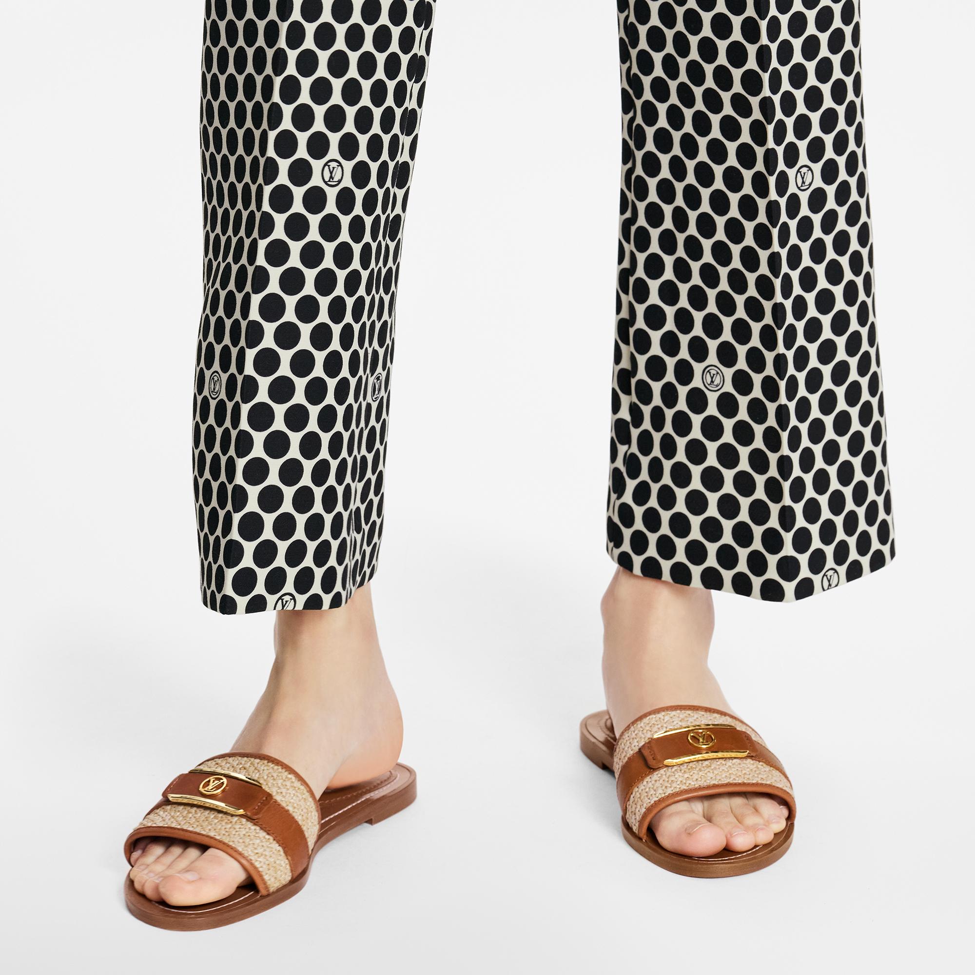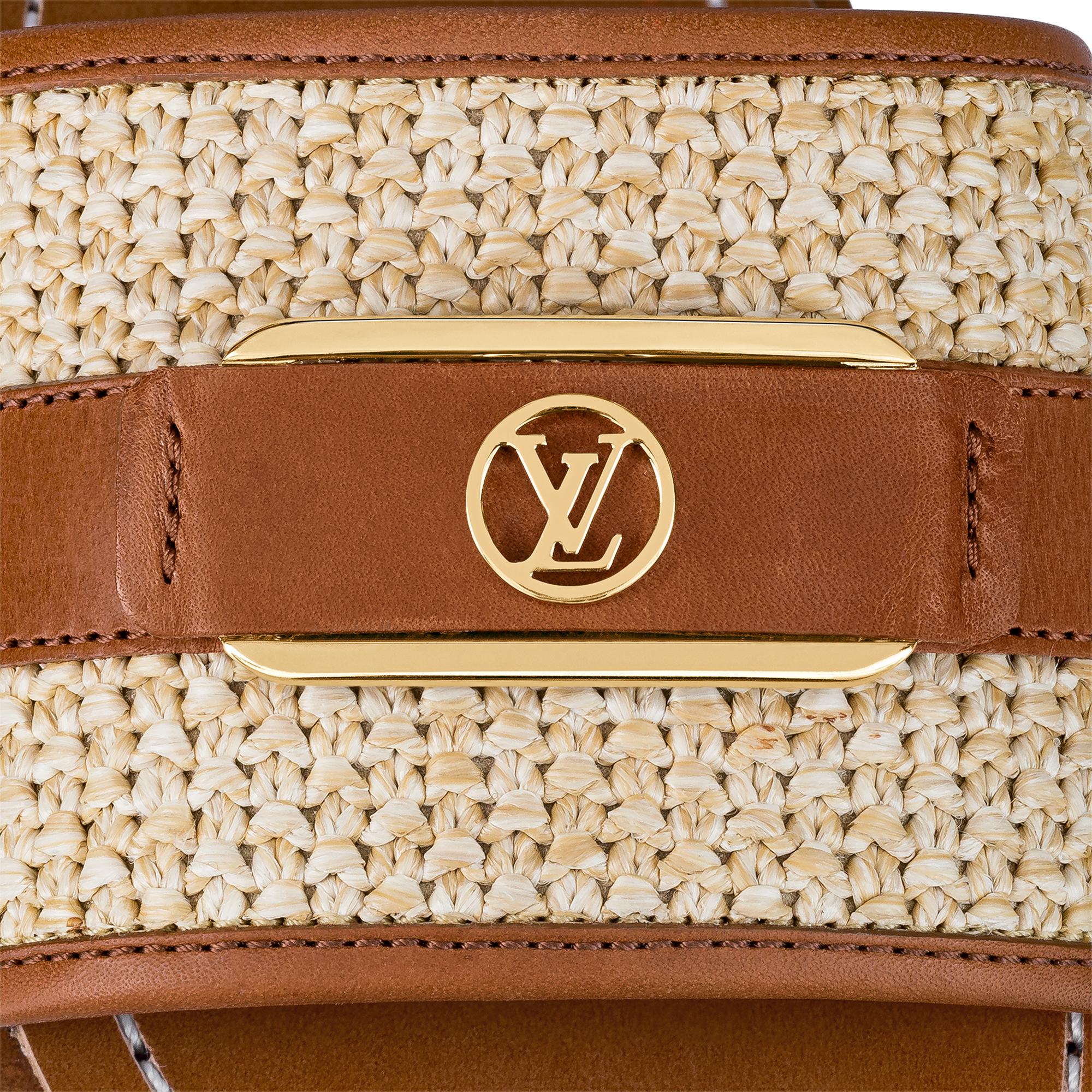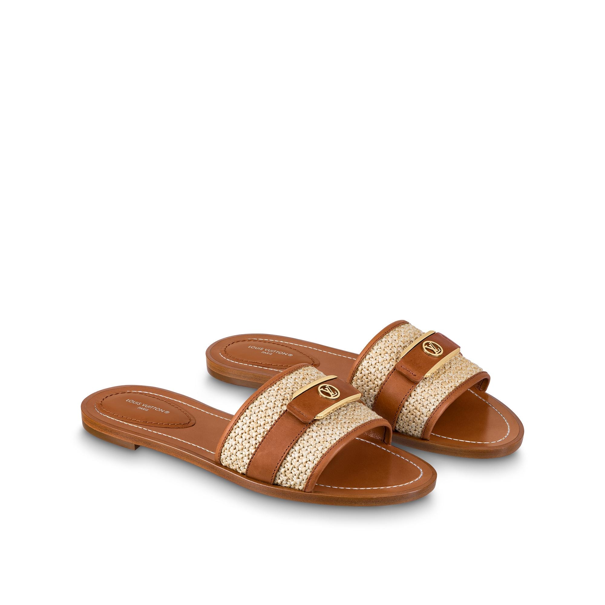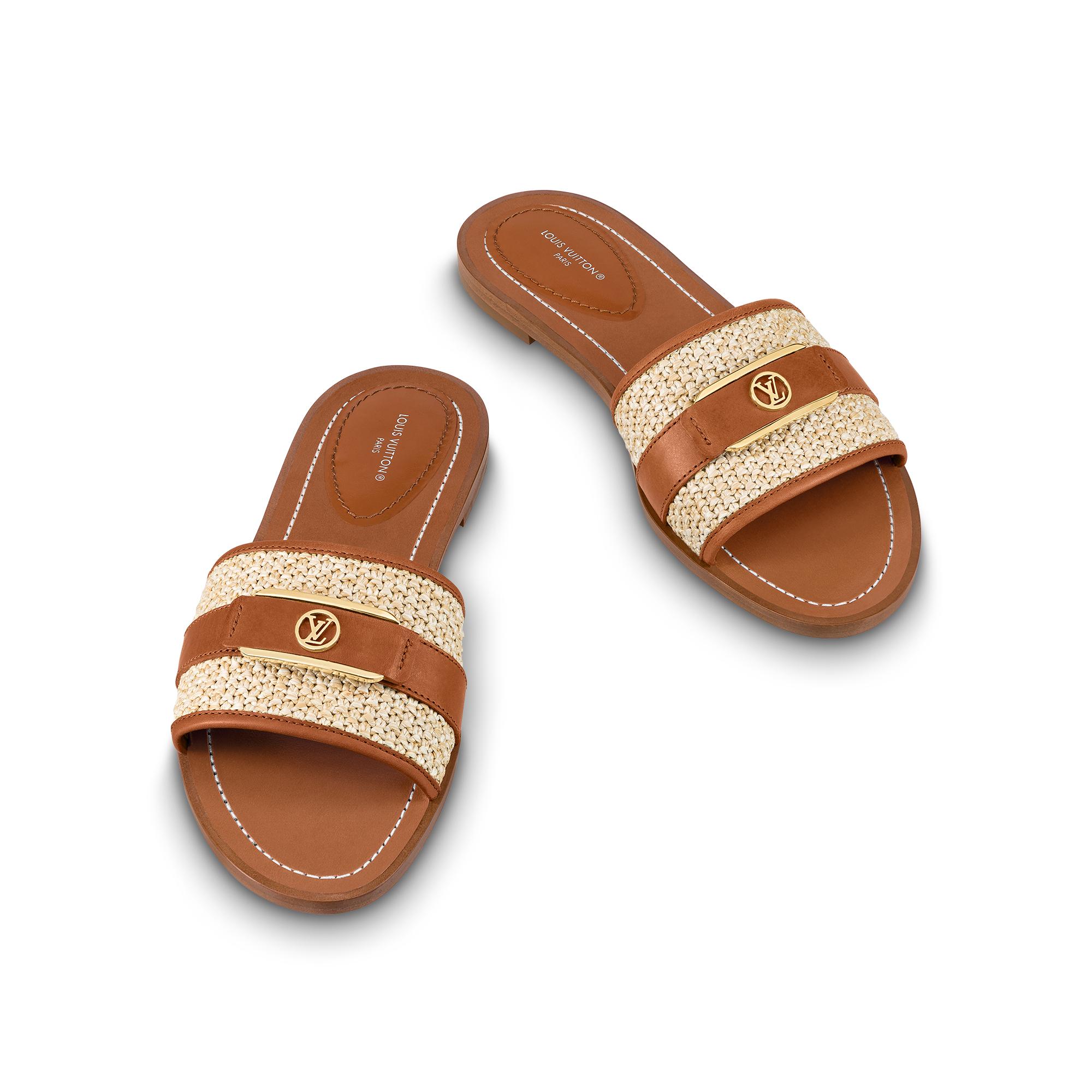 This summery interpretation of the emblematic Lock It flat mule pairs raffia with natural calf leather. The wide front strap is embellished with an oversized LV Circle signature stitched in leather. This model is finished with a durable monobloc outsole, constructed from several layers of leather. Product details Cognac Brown Raffia and calf leather Leather outsole LV Circle signature Made in Italy1AA1A6 CognacLouis Vuitton Lock It Flat Mule - Women - ShoesWomen - Shoes - Mules and Slides - Lock It Flat Mule