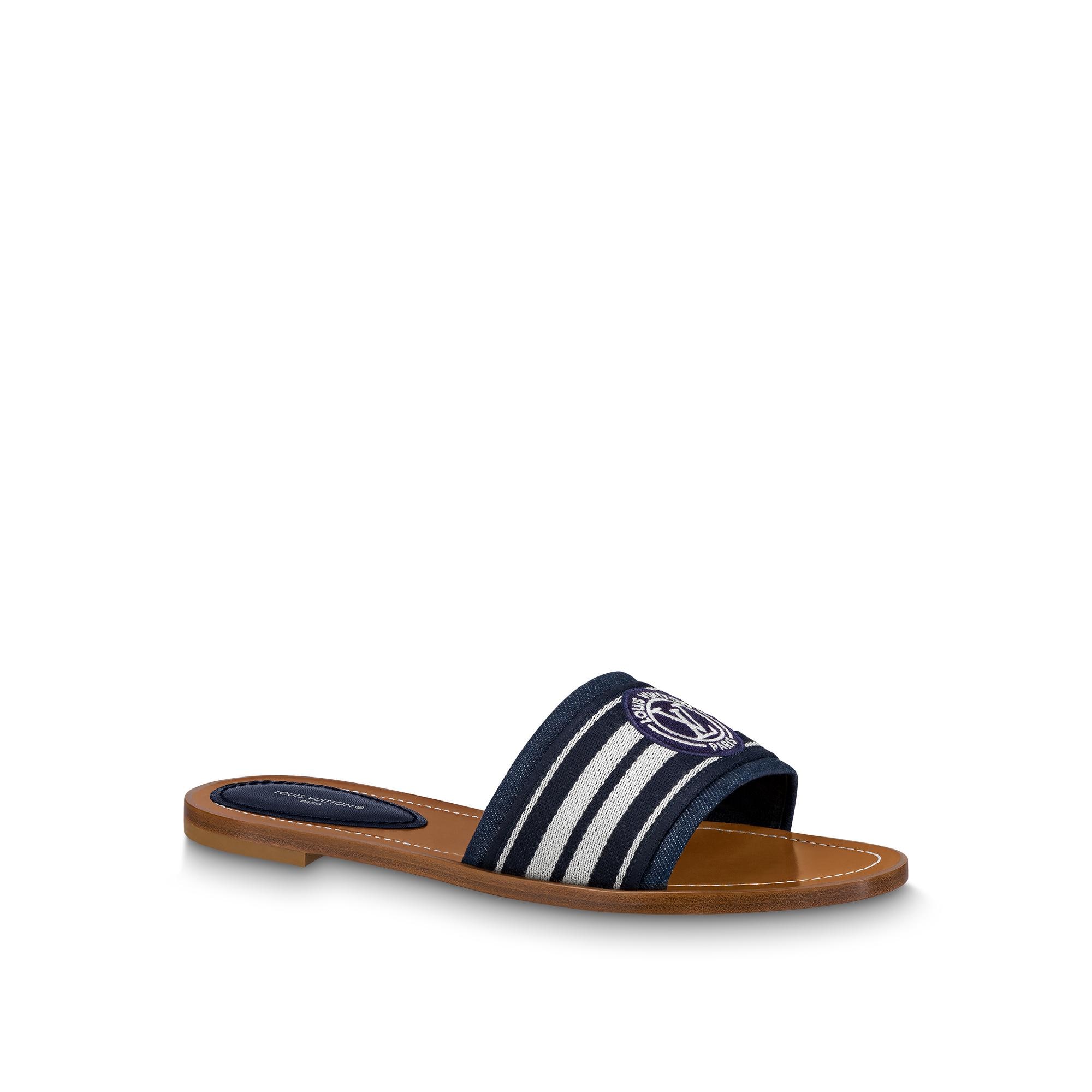 One of Louis Vuitton's iconic styles, the Lock It flat mule is revisited in summery denim. The front strap is embellished with a striped jacquard ribbon embroidered with the LV Circle logo. This model has a padded leather insert on the insole for added comfort and a durable leather outsole. Product details Blue Denim Leather outsole LV Circle on the strap Made in Italy1AADIK Louis Vuitton Lock It Flat Mule - Women - ShoesWomen - Shoes - Mules and Slides - Lock It Flat Mule