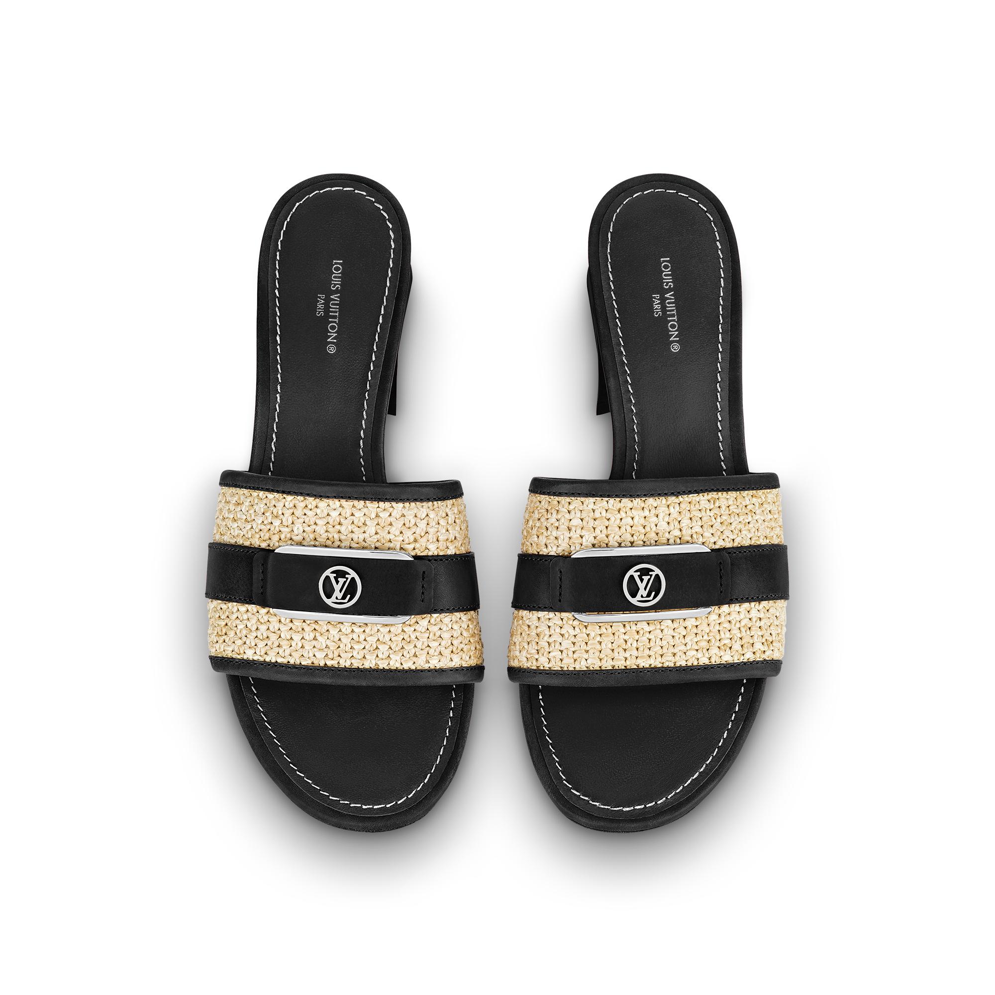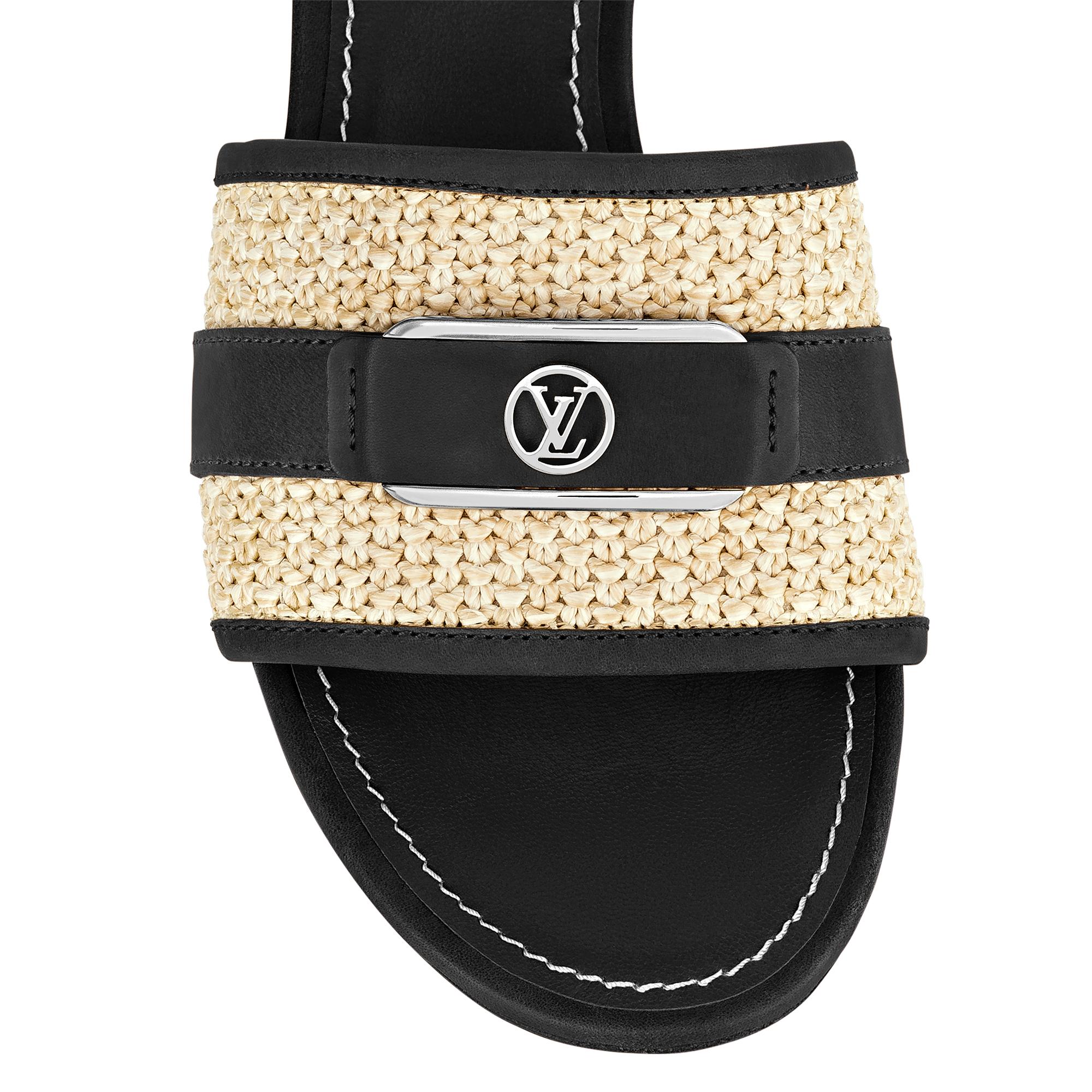 The timeless Lock It mule is revisited in a summery version combining raffia and natural calf leather. The wide front strap is signed with an oversized LV Circle logo stitched in leather. This model is finished with a leather outsole and a low block heel with a distinctive flared shape. Product details Black Raffia and calf leather Leather outsole 3.5 cm / 1.4-inch heel LV Circle signature Made in Italy1AA17M Louis Vuitton Lock It Mule - Women - ShoesWomen - Shoes - Mules and Slides - Lock It Mule