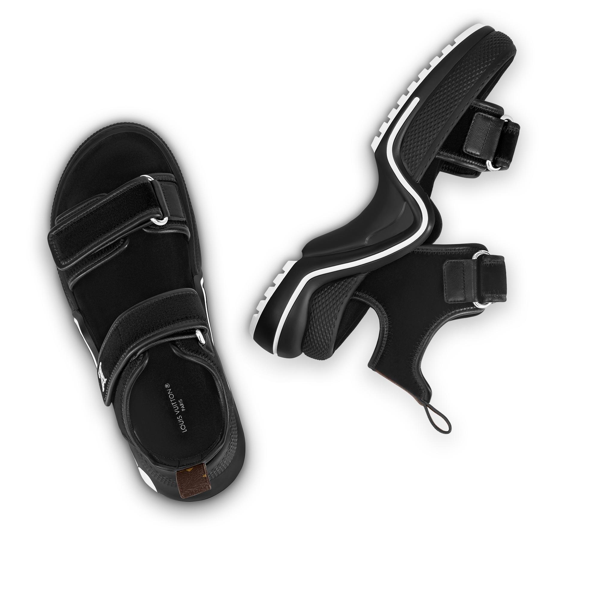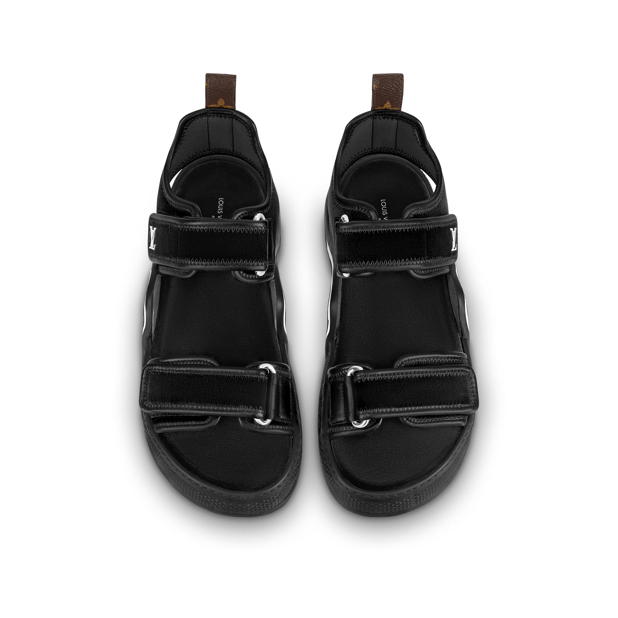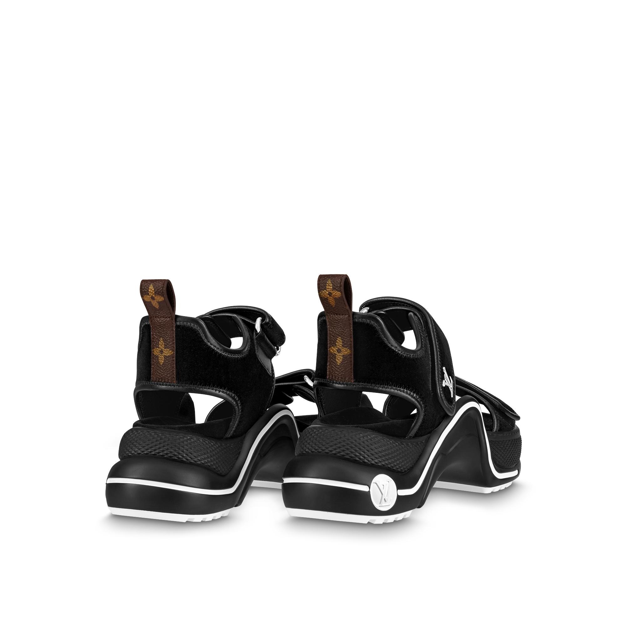 This sophisticated reinterpretation of the LV Archlight flat sandal comes in black velvet with tonal leather edging. Inspired by the iconic LV Archlight sneaker, this sandal features a similiar elevated, wavy outsole, which discreetly adds extra height. The upper has two adjustable velcro straps, one of which is embellished with an LV Initials stud. Product details Black Velvet Velcro straps Oversized rubber outsole (5 cm / 2 inches) LV Initials stud LV Circle on the outsole Patent Monogram-canvas back loop Made in Italy1AA1B8 Louis Vuitton LV Archlight Flat Sandal - Women - ShoesWomen - Shoes - Sandals and Espadrilles - Lv Archlight Flat Sandal