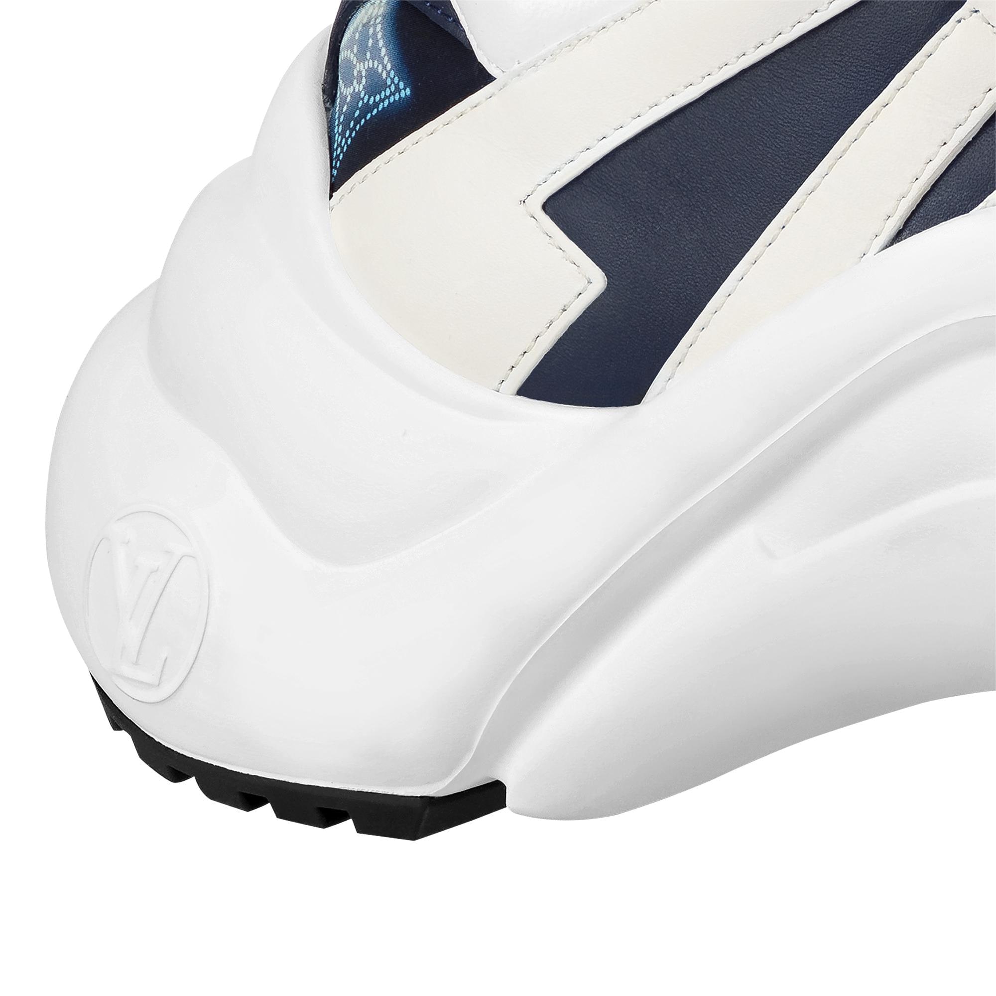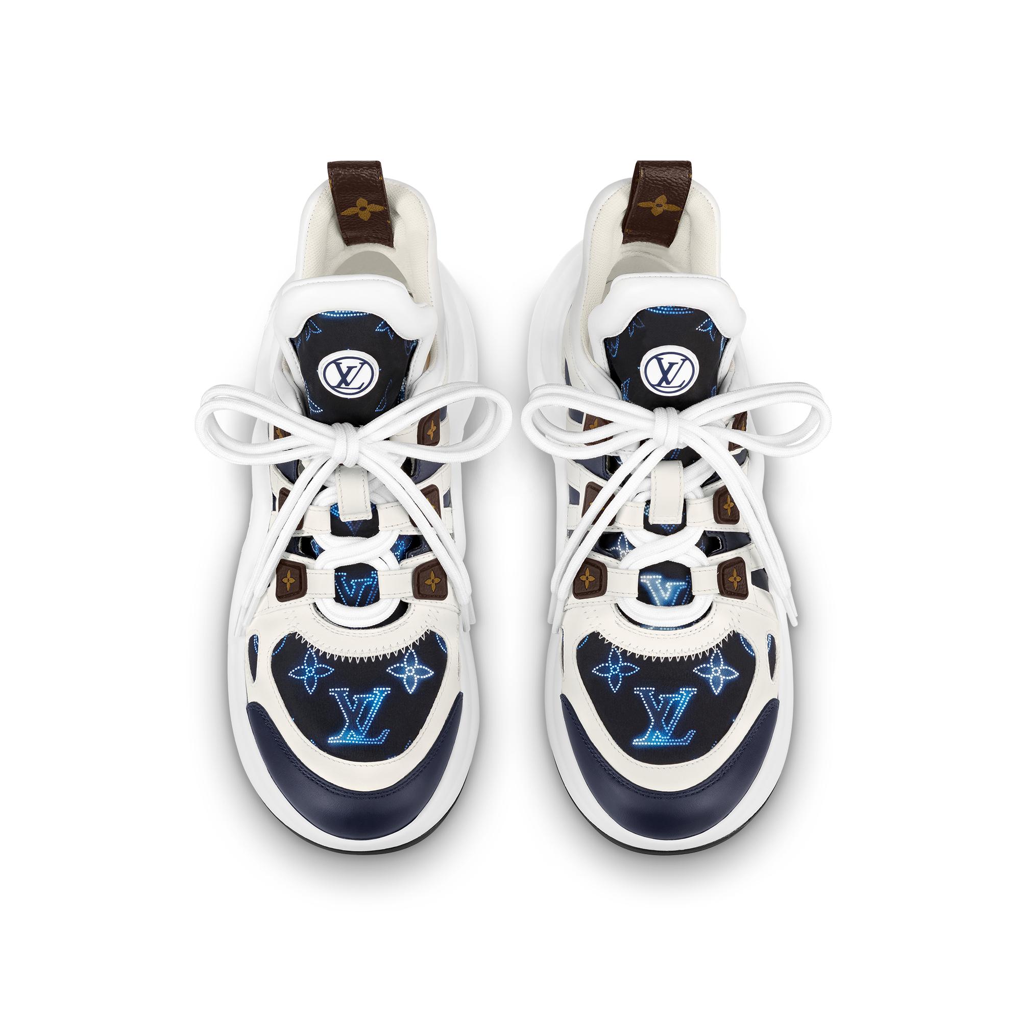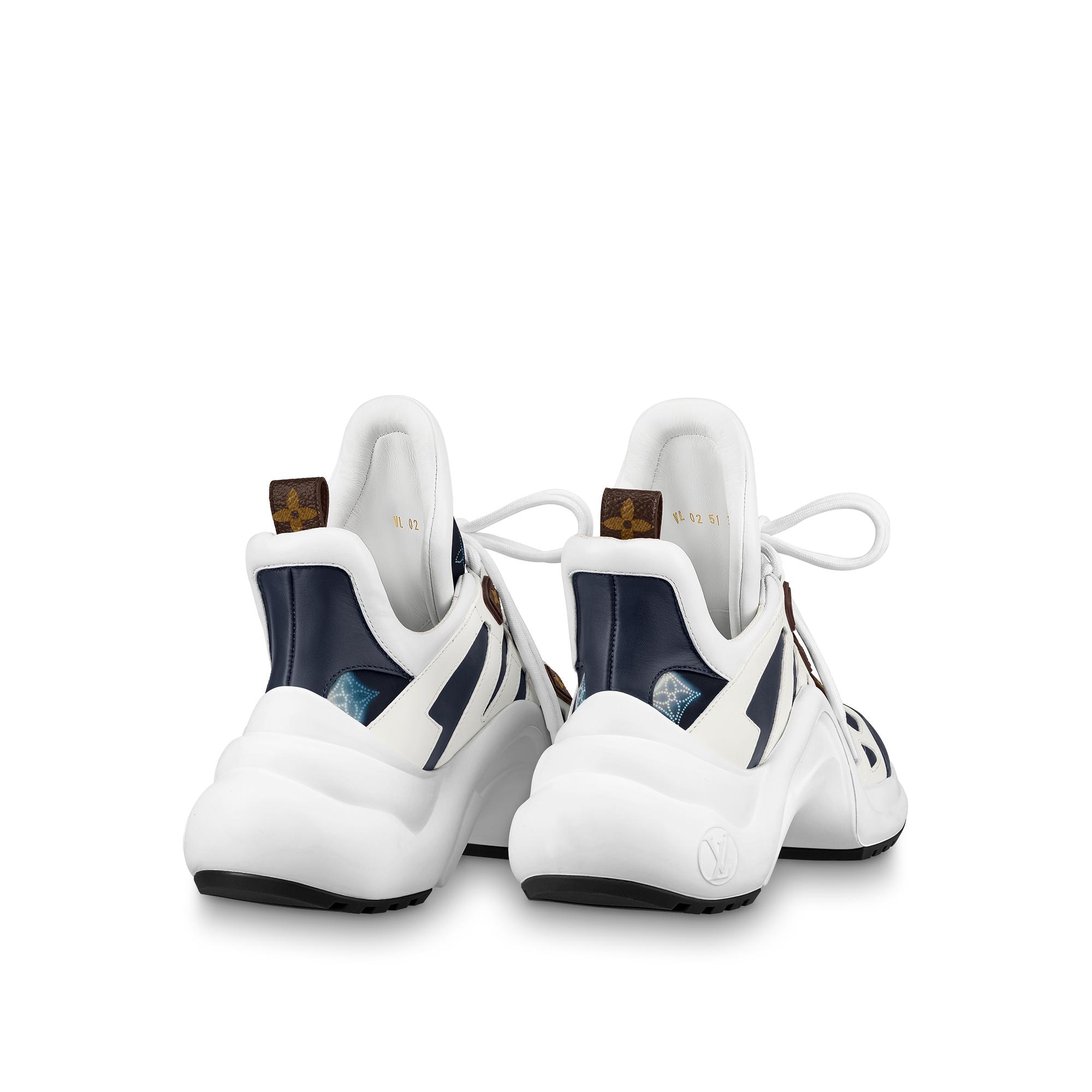 This version of the LV Archlight sneaker combines white calf leather with recycled nylon. This sustainable material is printed with the Flight Mode pattern, a reinterpretation of the Louis Vuitton Monogram, which features across the Spring-Summer 2022 collection. This iconic sneaker is instantly identifiable for its bouncy, wave-shaped outsole and feminine low cut around the ankle. Product details Navy Blue Recycled, printed nylon and calf leather Oversized rubber outsole (5 cm / 2 inches) LV Circle on the tongue and outsole Patent Monogram-canvas back loop Made in Italy1A9RX2 Louis Vuitton Lv Archlight Sneaker - Women - ShoesWomen - Shoes - Sneakers - Lv Archlight Sneaker