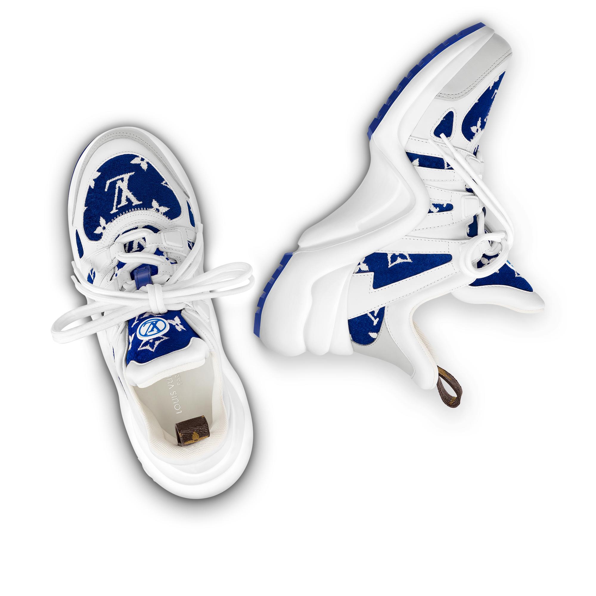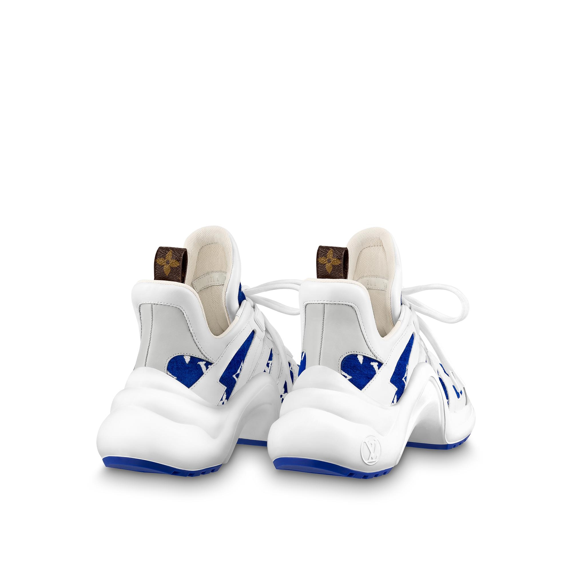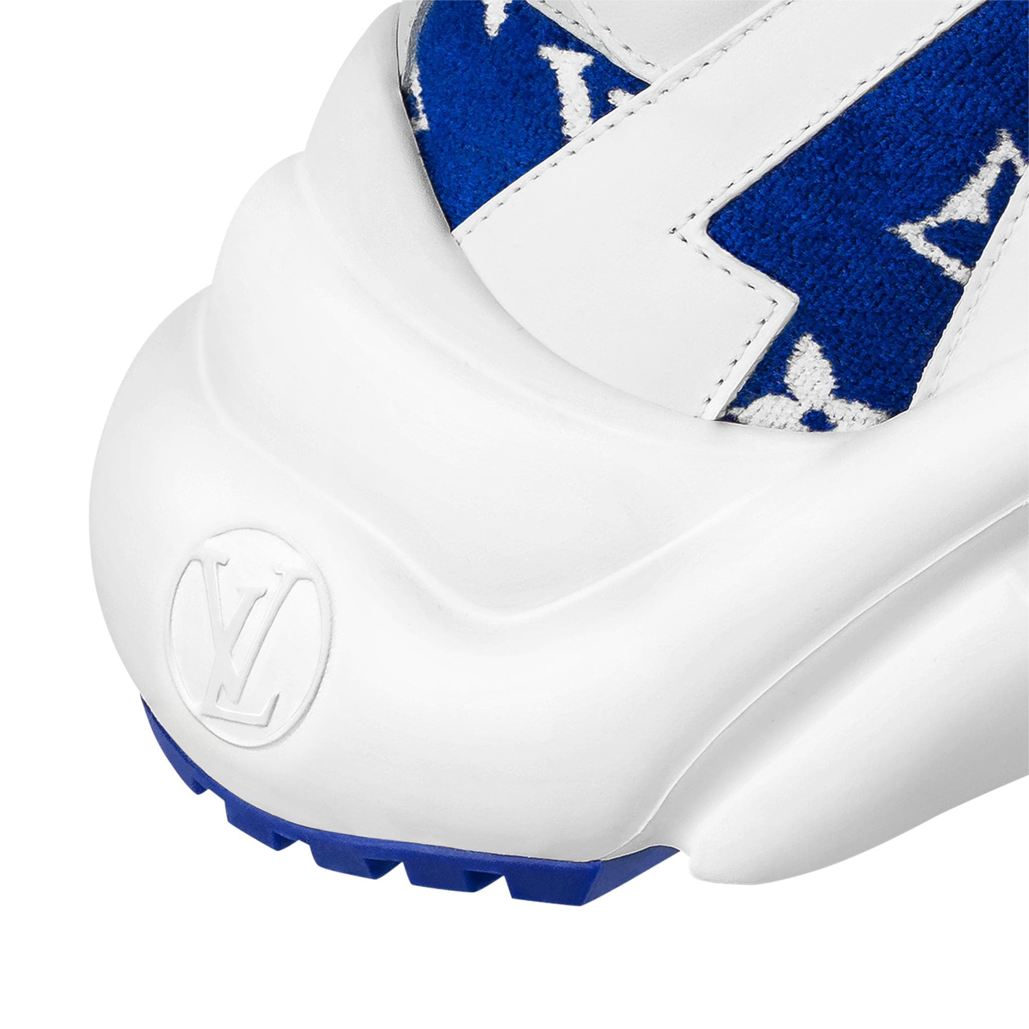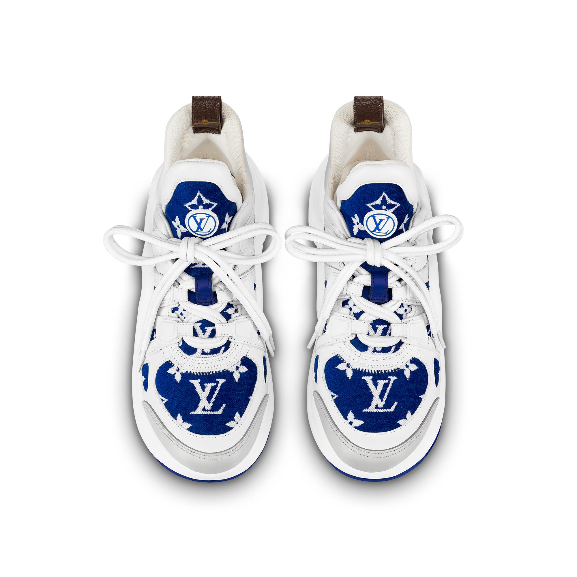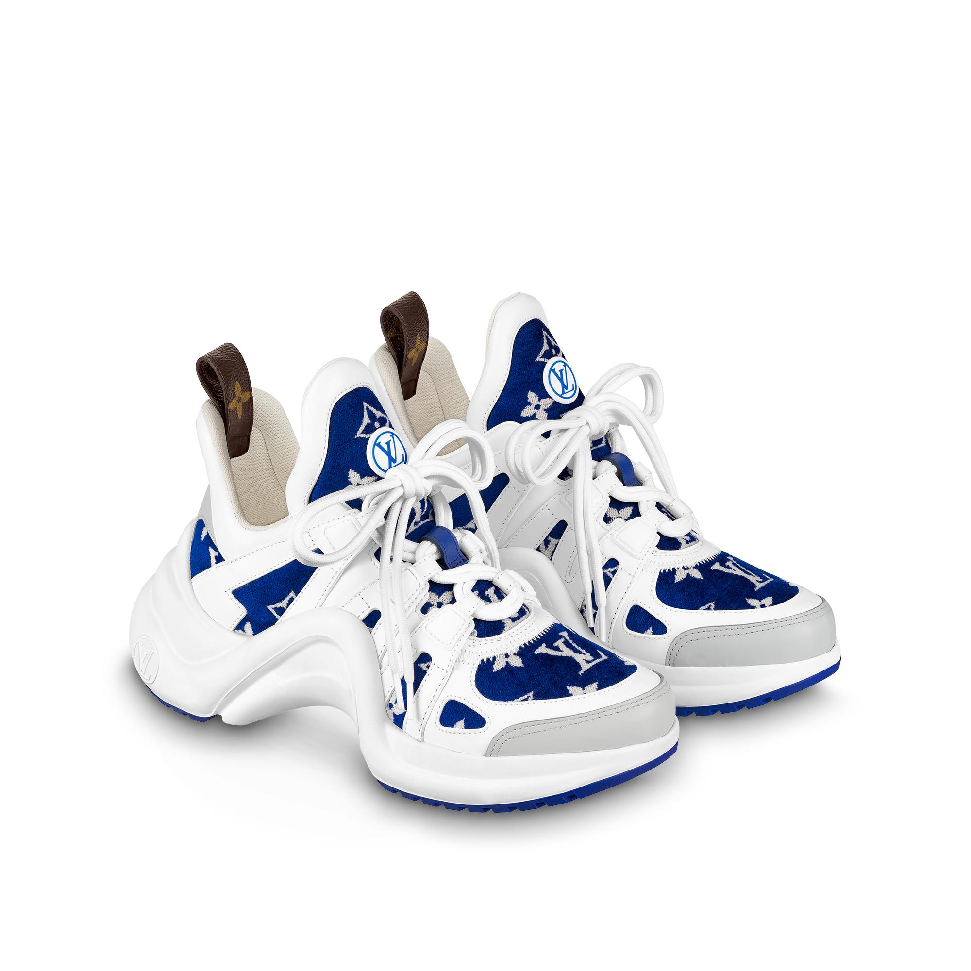 Velvet printed with Louis Vuitton's signature Monogram pattern brings a fresh look to the LV Archlight sneaker. It is combined with calf leather on the elaborately constructed upper, which features a feminine low cut around the ankle and an oversized tongue with a rubber LV Circle logo. A bouncy, wave-shaped outsole completes this iconic design. Product details Blue Monogram velvet Oversized rubber outsole (5 cm / 2 inches) LV Circle on the tongue and outsole Patent Monogram-canvas back loop Made in Italy1AACTS BlueLouis Vuitton Lv Archlight Sneaker - Women - ShoesWomen - Shoes - Sneakers - Lv Archlight Sneaker