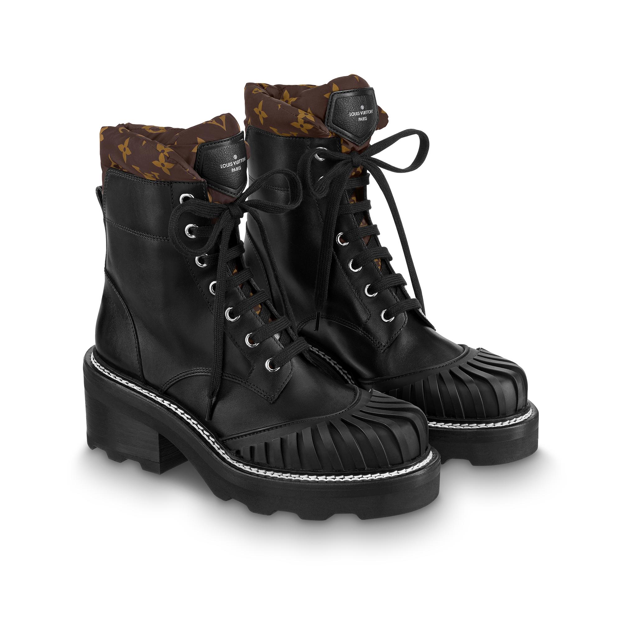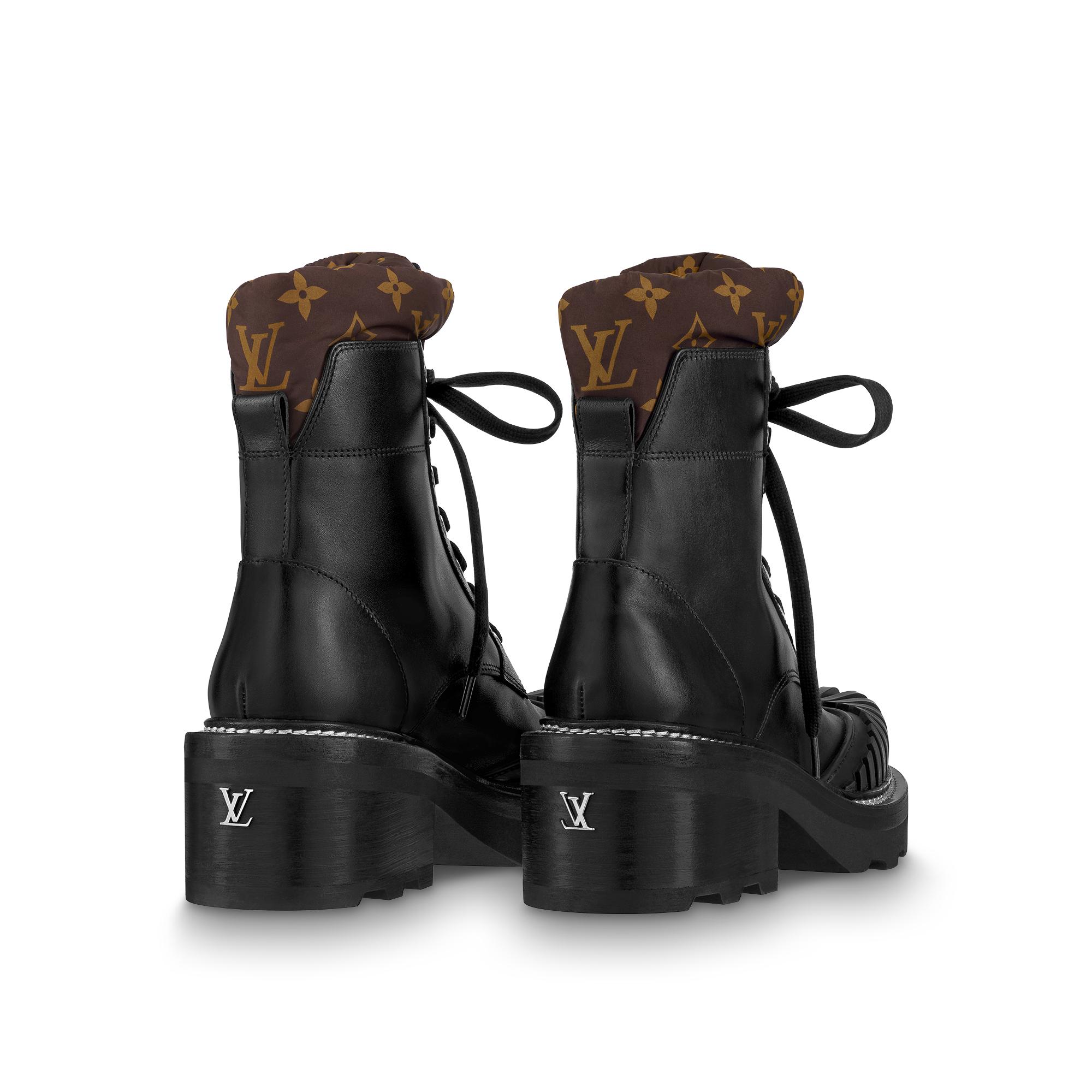 Reinterpreting one of Louis Vuitton's emblematic styles, the LV Beaubourg ankle boot in calf leather draws inspiration from combat boots with its lace-up design and rubber tip. A padded lining in Monogram nylon offers instant warmth and comfort. This model is characterized by its chunky yet lightweight outsole in micro and leather, which is complemented by white stitching. Product details Black Calf leather Monogram-nylon lining Micro and leather outsole 4 cm / 1.6-inch heel Louis Vuitton-embossed leather tag LV Initials insert in the heel Made in Italy1A94N6 Louis Vuitton Lv Beaubourg Ankle Boot - Women - ShoesWomen - Shoes - Boots and Booties - Lv Beaubourg Ankle Boot