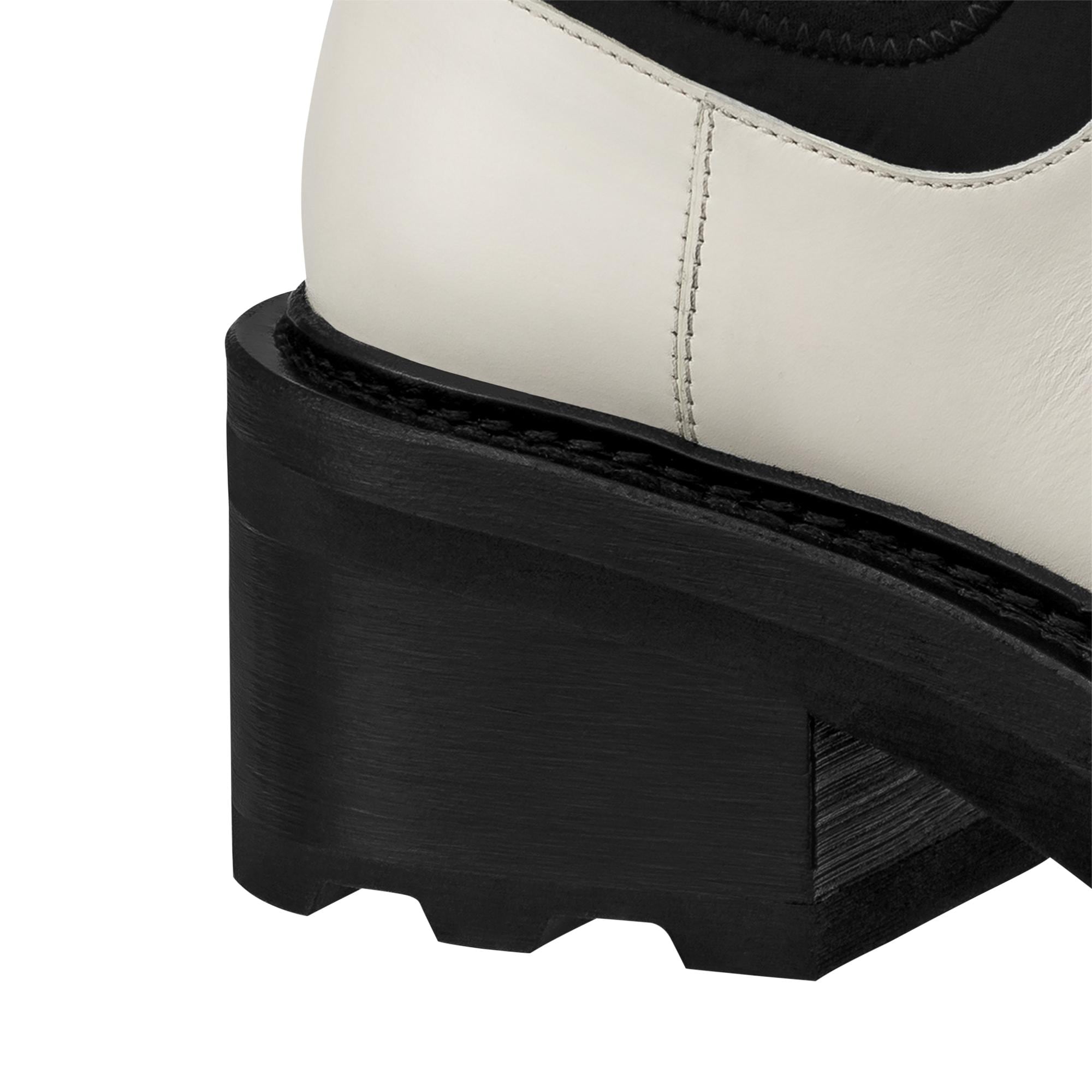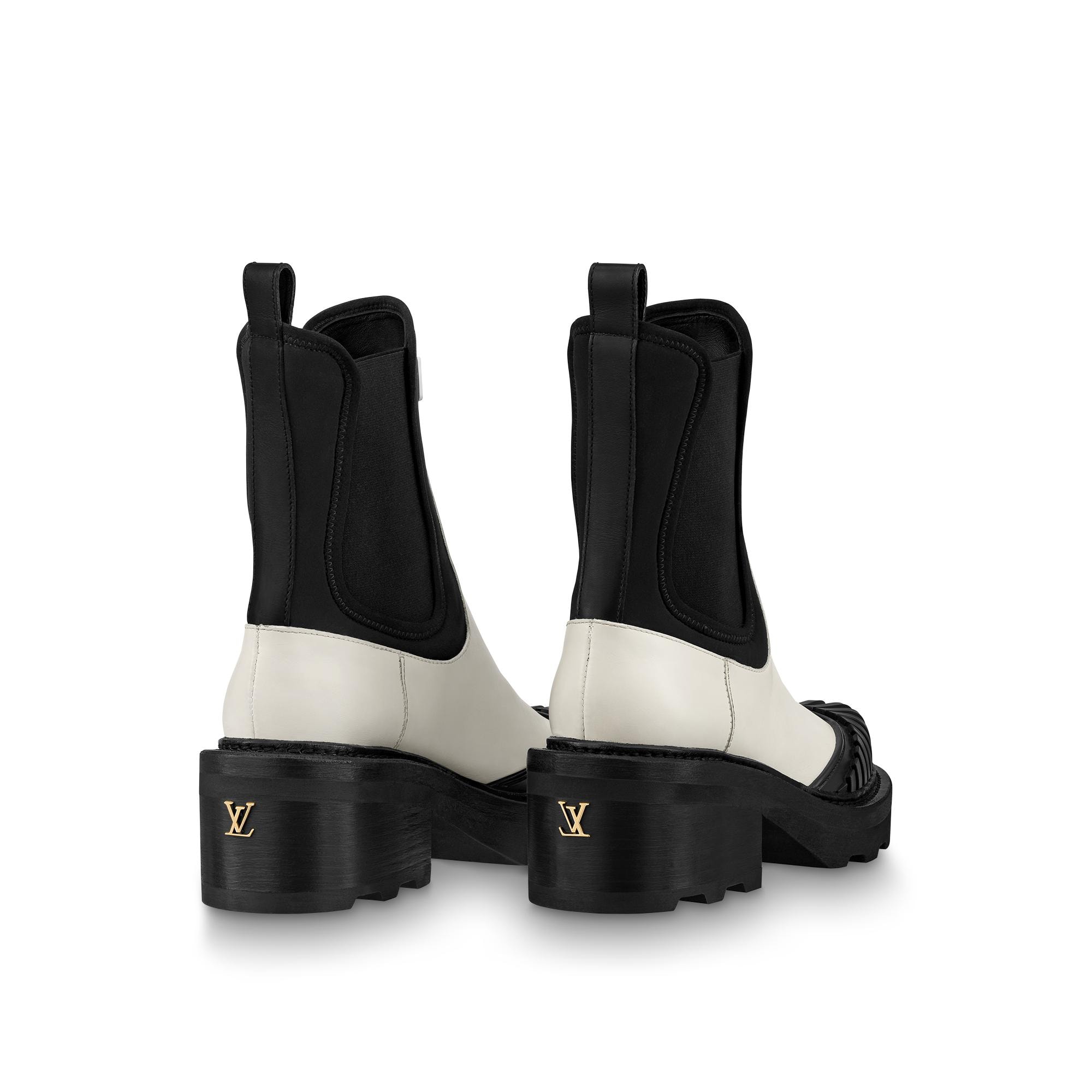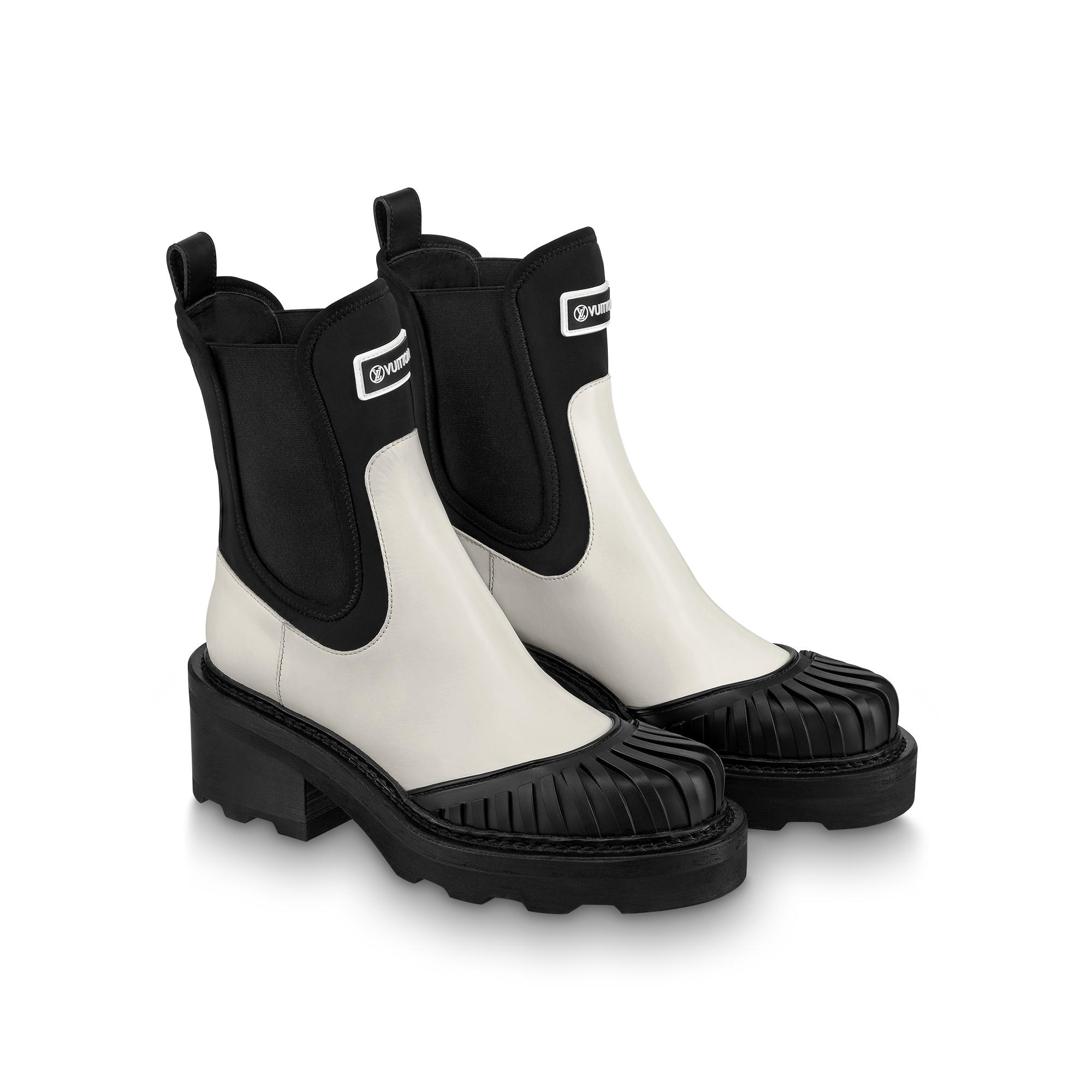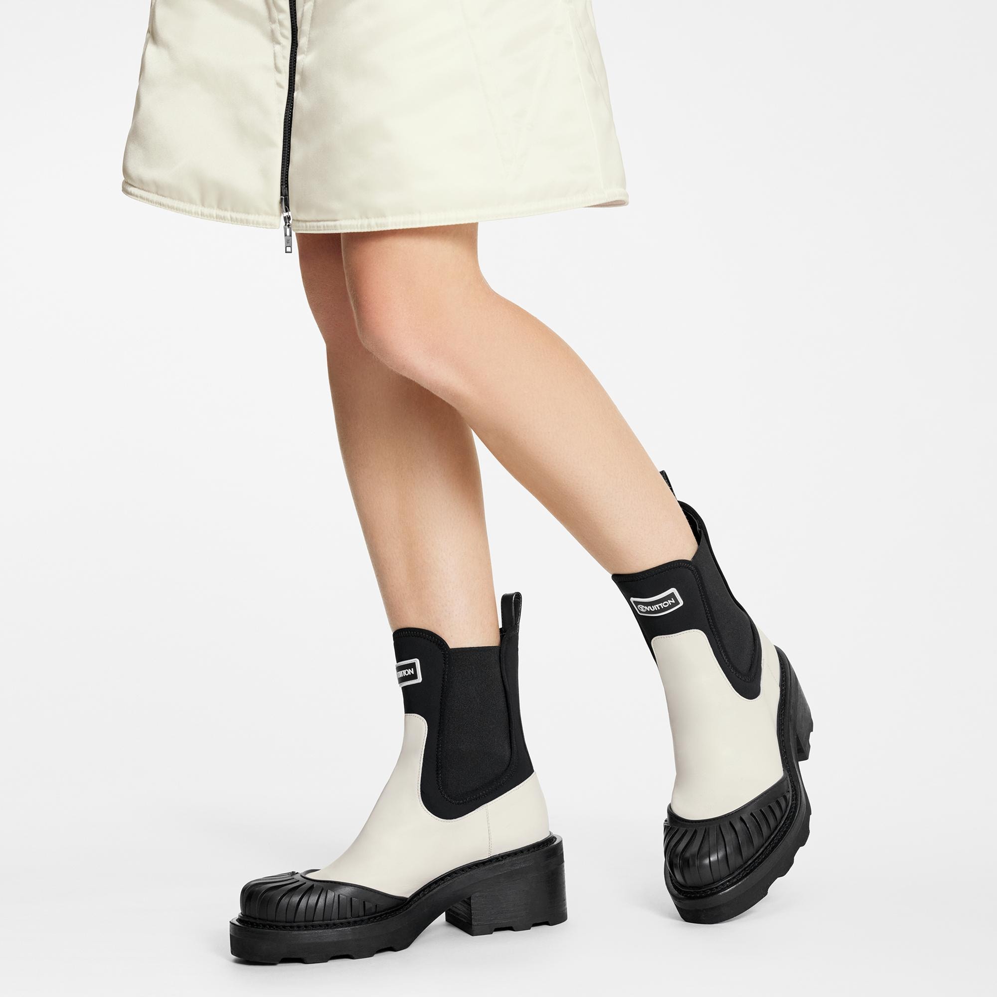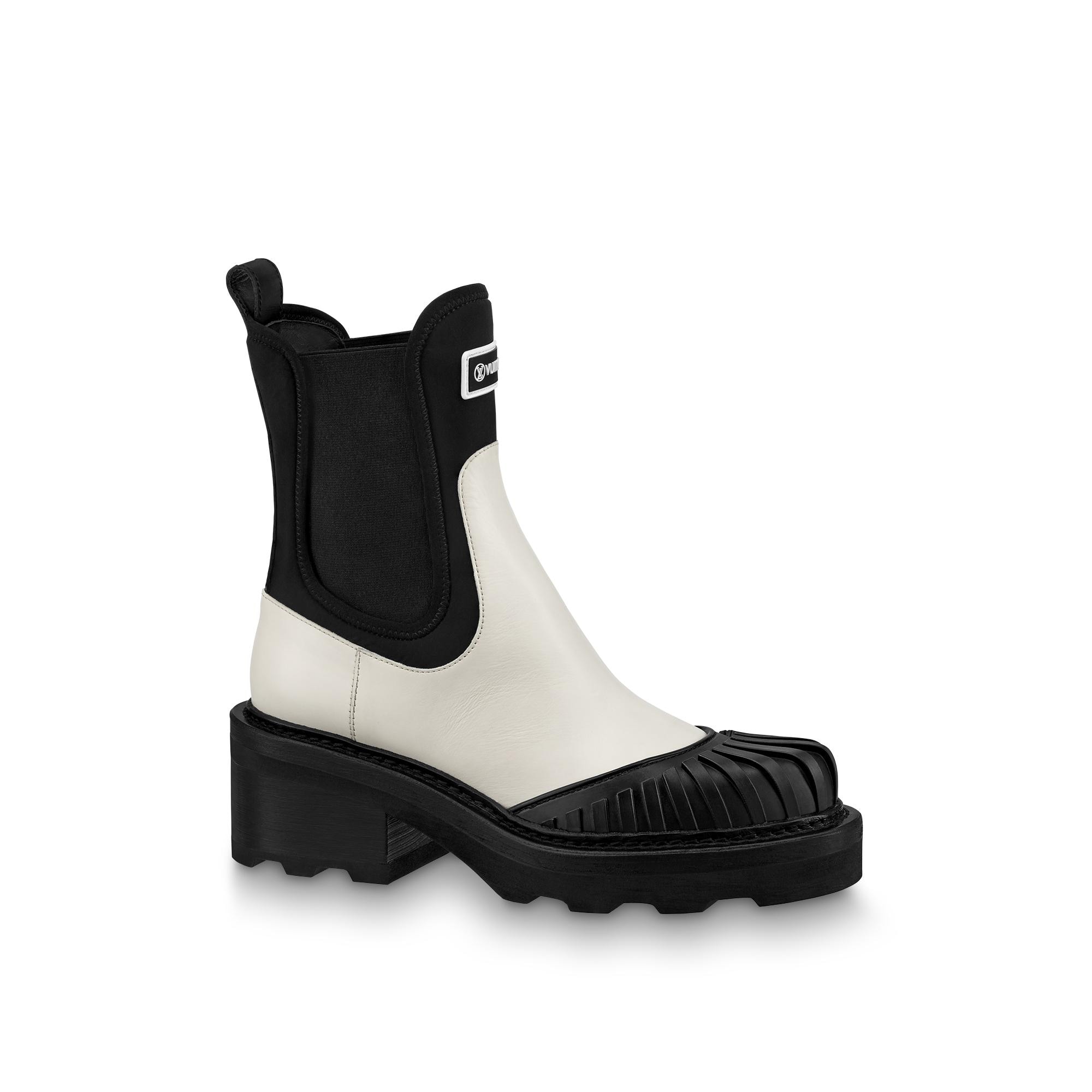 The LV Beaubourg ankle boot is a fashion-forward reinterpretation of the classic Chelsea boot. Its upper combines calf leather with technical neoprene and features a distinctive rubber tip. This model is signed with a rubber Vuitton tag on the upper and gold-tone LV Initials studs in the heel, which are arranged symmetrically to create an original mirror effect. Product details Ecru White Calf leather and neoprene Elastic side panels Micro and leather outsole 4 cm / 1.6-inch heel Vuitton rubber tag LV Initials insert in the heel Patent Monogram-canvas back loop Made in Italy1A9GYA ECRULouis Vuitton Lv Beaubourg Ankle Boot - Women - ShoesWomen - Shoes - Boots and Booties - Lv Beaubourg Ankle Boot