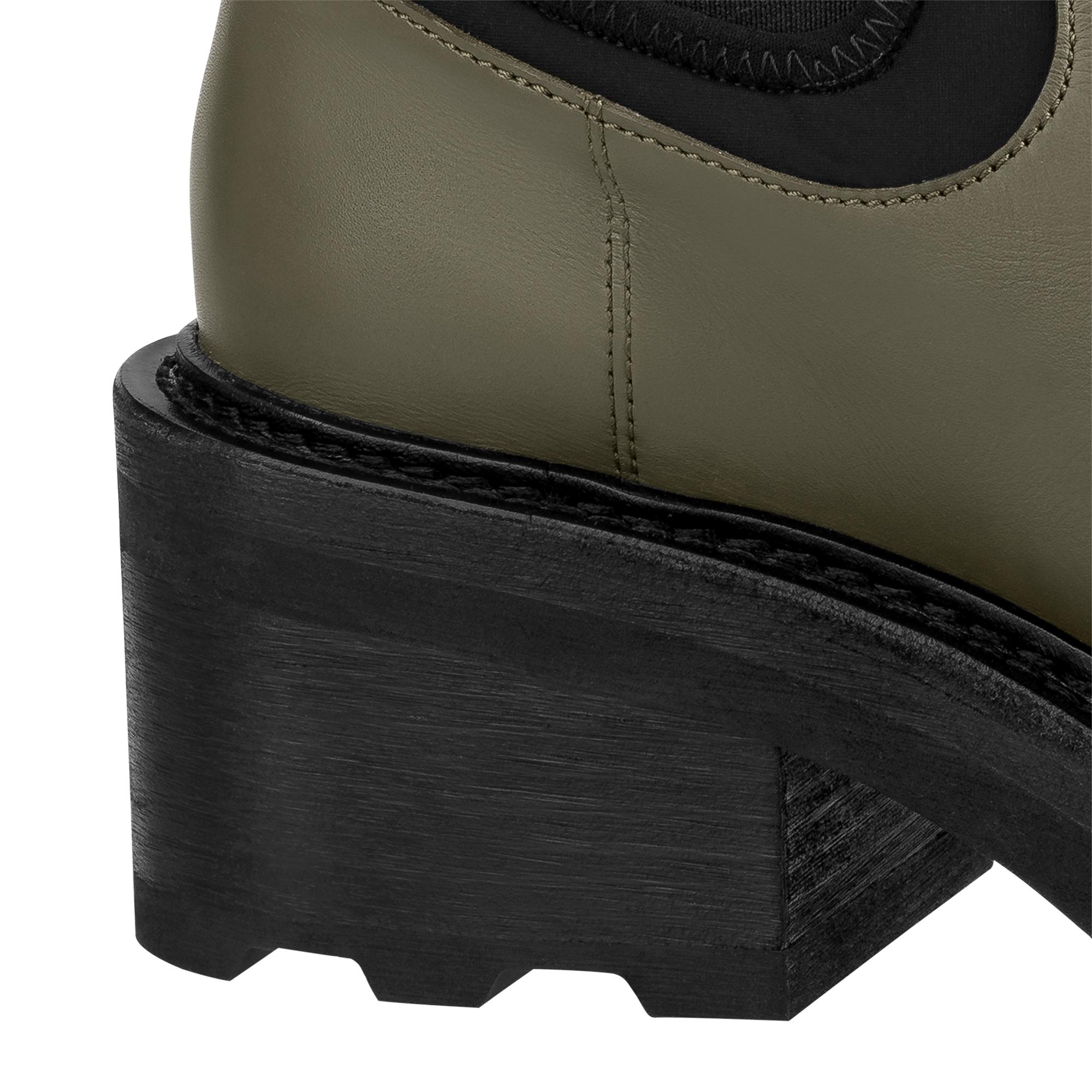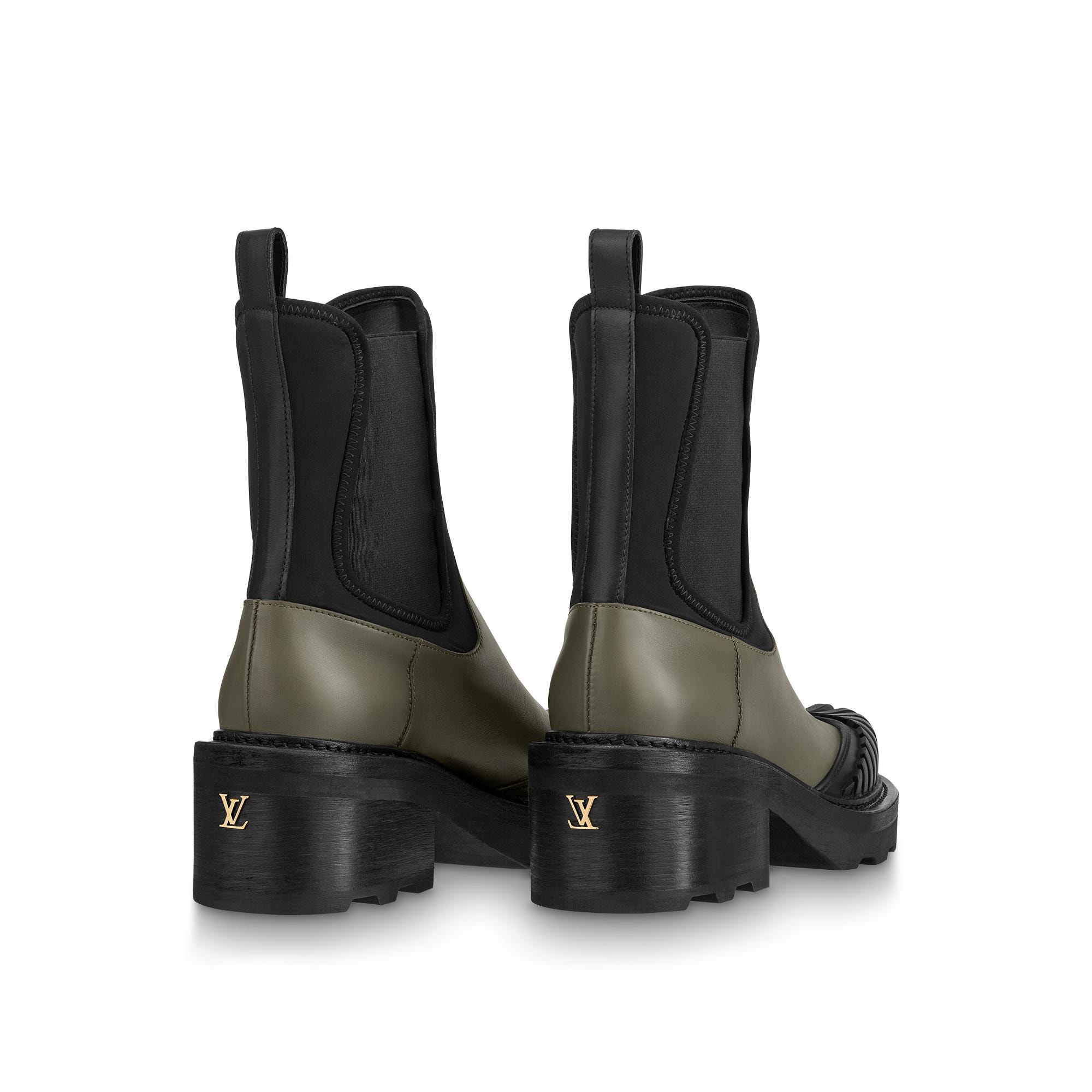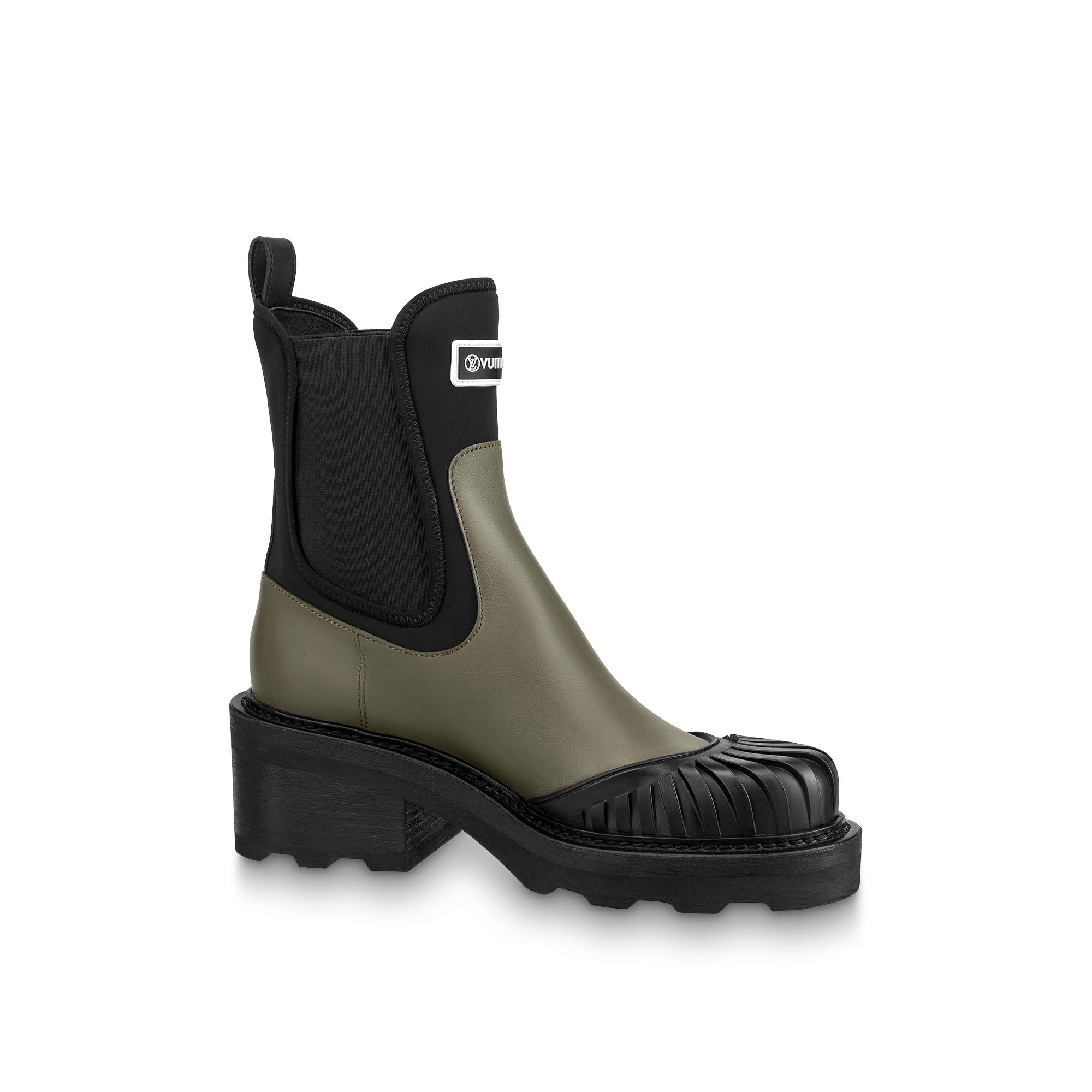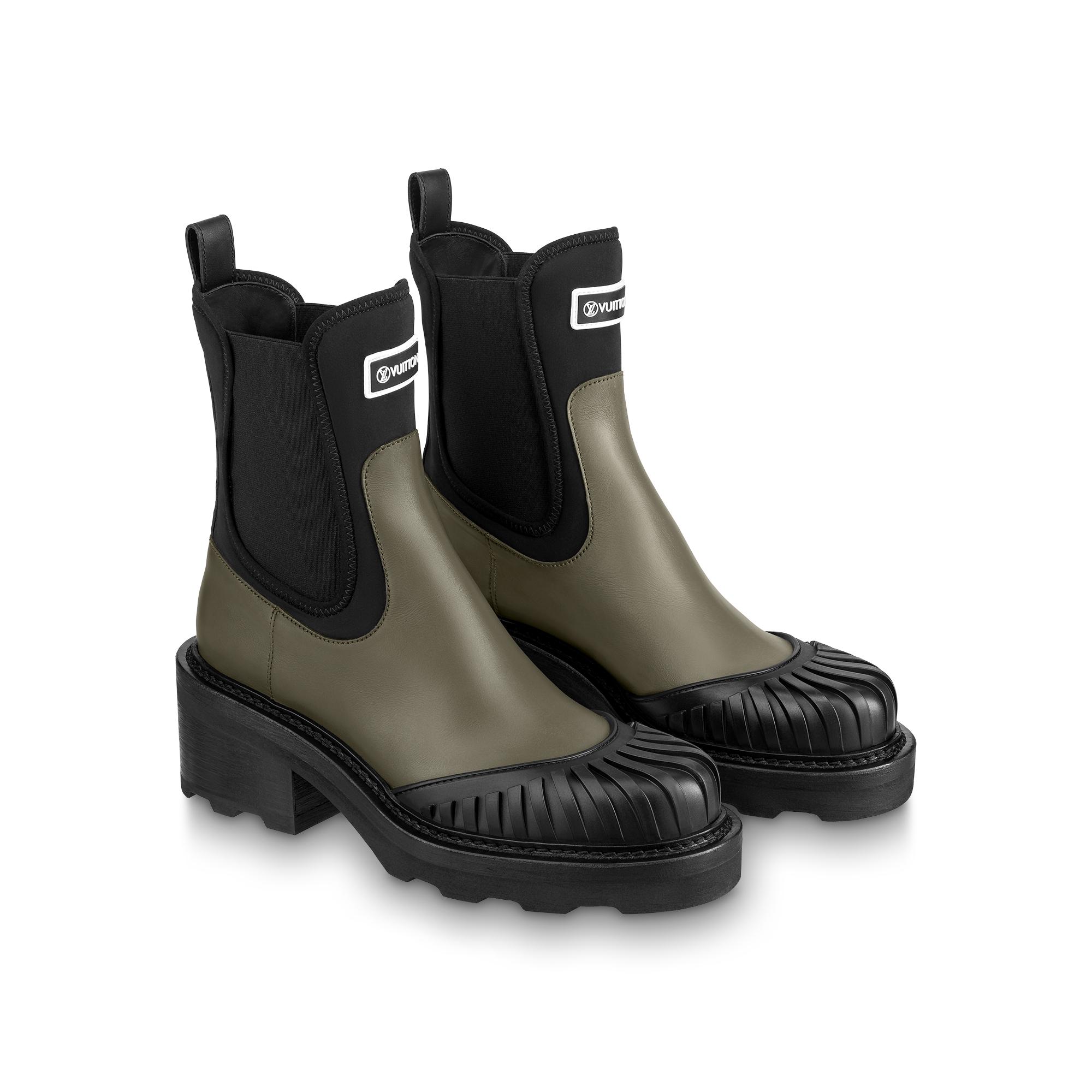 The LV Beaubourg ankle boot is a fashion-forward reinterpretation of the classic Chelsea boot. Its upper combines calf leather with technical neoprene and features a distinctive rubber tip. This model is signed with a rubber Vuitton tag on the upper and gold-tone LV Initials studs in the heel, which are arranged symmetrically to create an original mirror effect. Product details Khaki Green Calf leather and neoprene Elastic side panels Micro and leather outsole 4 cm / 1.6-inch heel Vuitton rubber tag LV Initials insert in the heel Patent Monogram-canvas back loop Made in Italy1A9GYP KhakiLouis Vuitton Lv Beaubourg Ankle Boot - Women - ShoesWomen - Shoes - Boots and Booties - Lv Beaubourg Ankle Boot