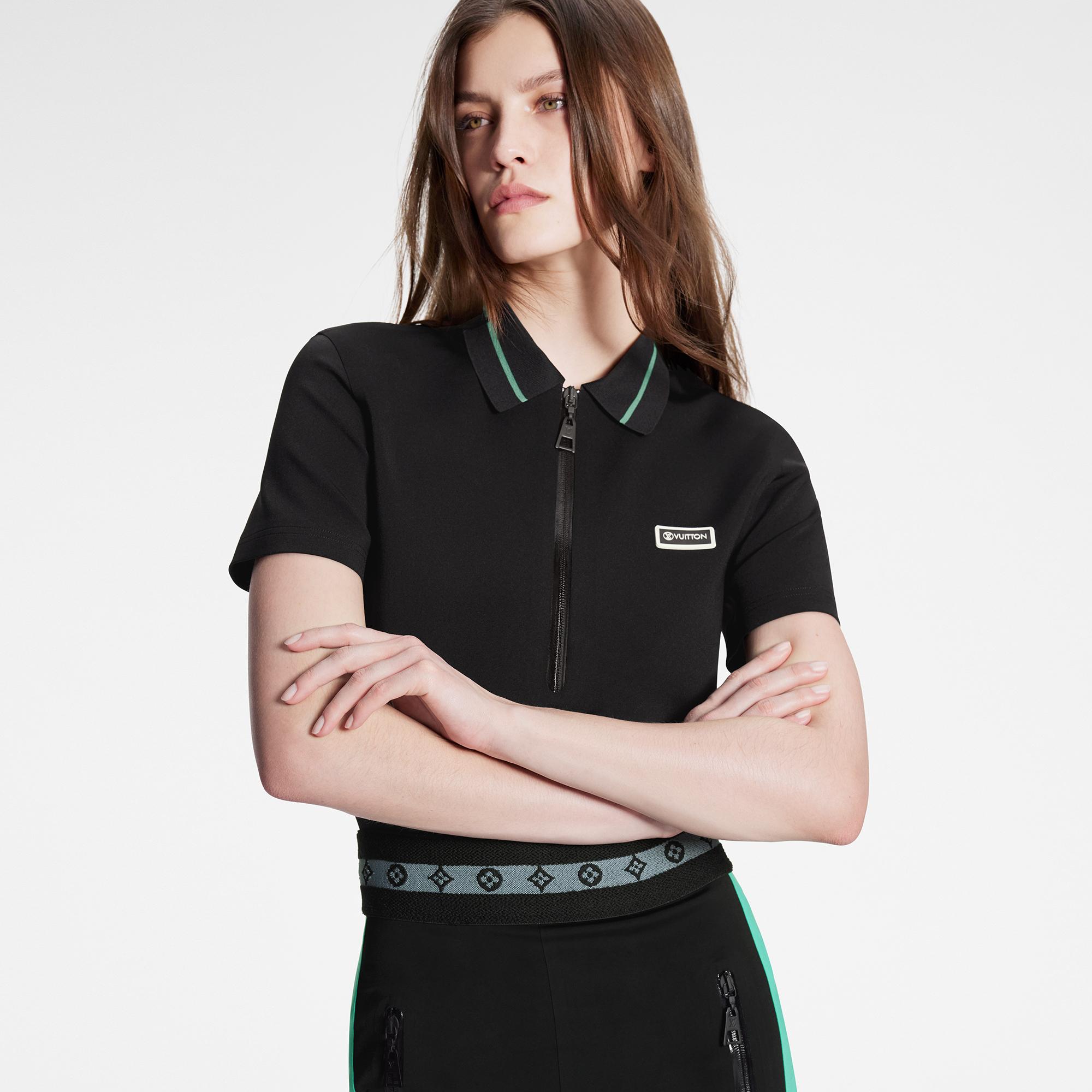 The LV Match capsule’s spirited update on a classic polo top. The timeless cut is revisited in soft technical stretch jersey detailed with a sleek coated half-zipper for a contemporary twist. The collar is highlighted with a single stripe that introduces an understated graphic feel, while a rubber Louis Vuitton Vuittamins patch signs the look. Product details Main Material : 72% Polyamide, 28% Elastane Other Material : 98% Polyamide, 2% Elastane Black Regular fit Model wears size 36 Model measurements : Bust 32'' / 81 cm, Height 5' 9" / 175 cm, Waist 24'' / 60 cm, Hips 35'' / 88 cm Made in Italy Do not wash Do not bleach Do not tumble dry Iron at a maximum sole-plate temperature of 110°C Mild professionnal dry cleaning in hydrocarbons1AA8VV BlackLouis Vuitton LV Match Polo Top - Women - Ready-to-WearWomen - Ready-to-Wear - Tops - LV Set Polo Top