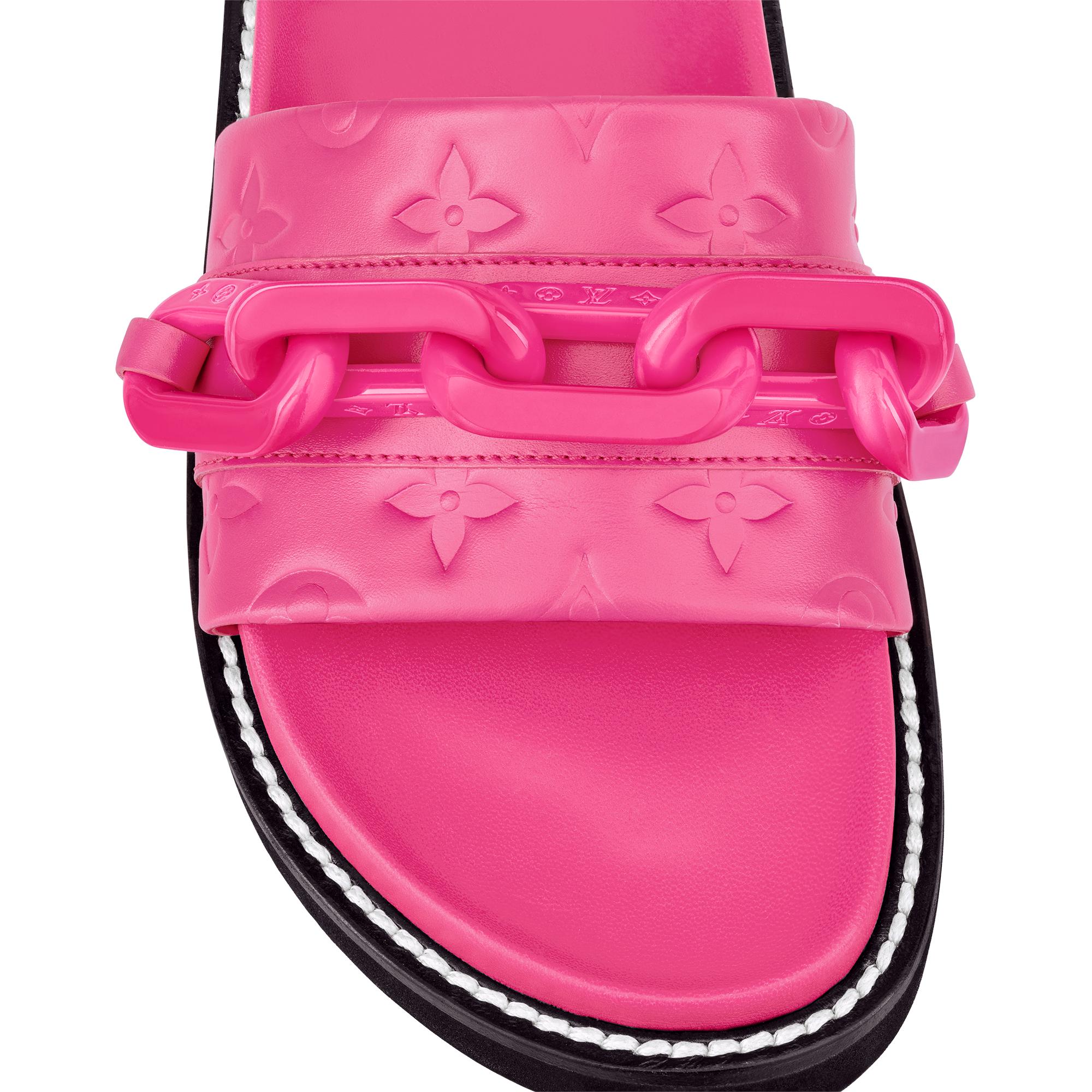 The LV Sunset flat comfort mule features a wide front strap in calf leather embossed with the iconic Monogram pattern. The strap is embellished with an oversized, color-matched resin chain referencing Louis Vuitton leather goods. This easy-to-wear slide has a comfortable anatomic insole and a lightweight micro outsole. Product details Rose Pop Pink Monogram-embossed calf leather Anatomic insole Micro outsole Chain accessory Made in Italy1A9RB0 Louis Vuitton Lv Sunset Flat Comfort Mule - Women - ShoesWomen - Shoes - Mules and Slides - Lv Sunset Flat Comfort Mule