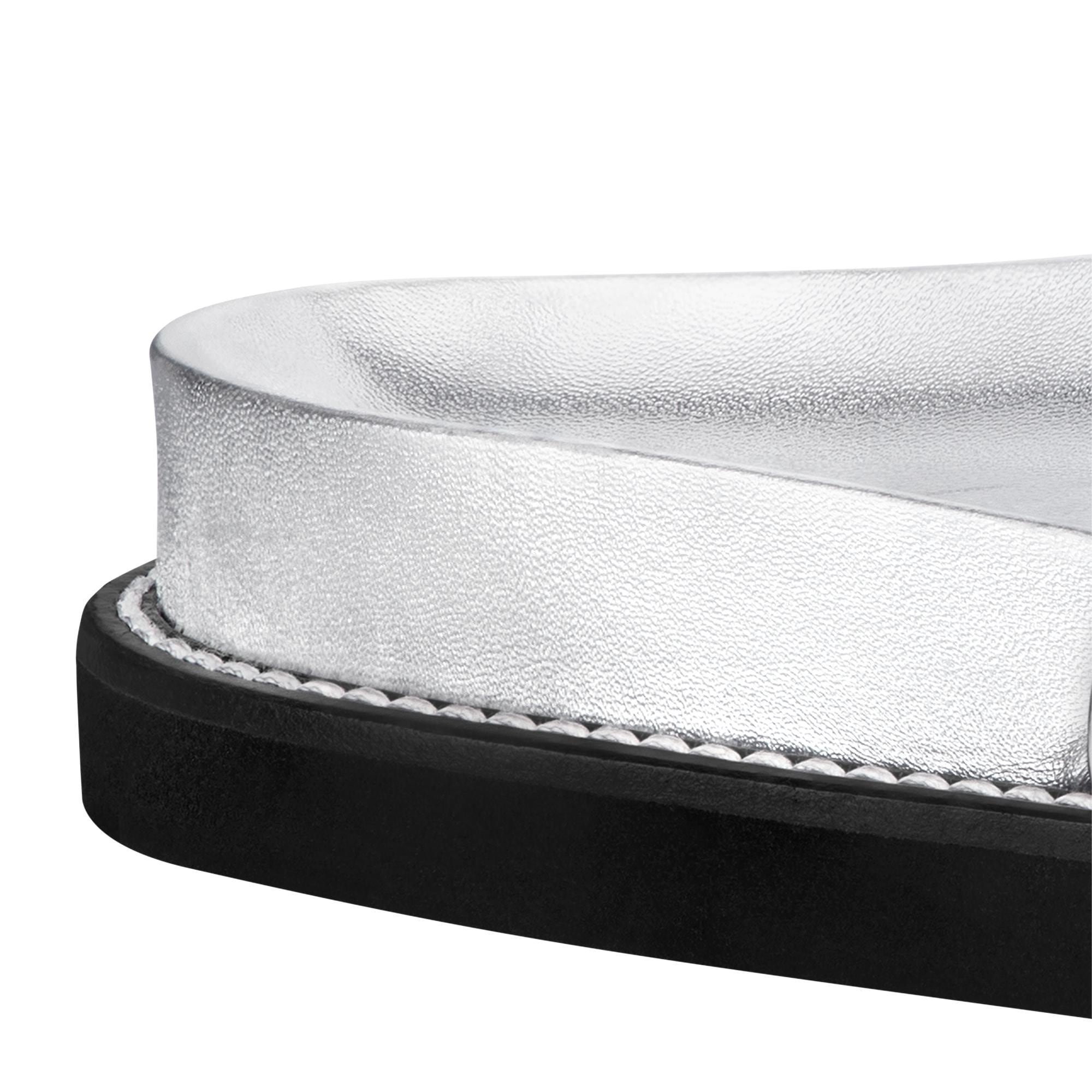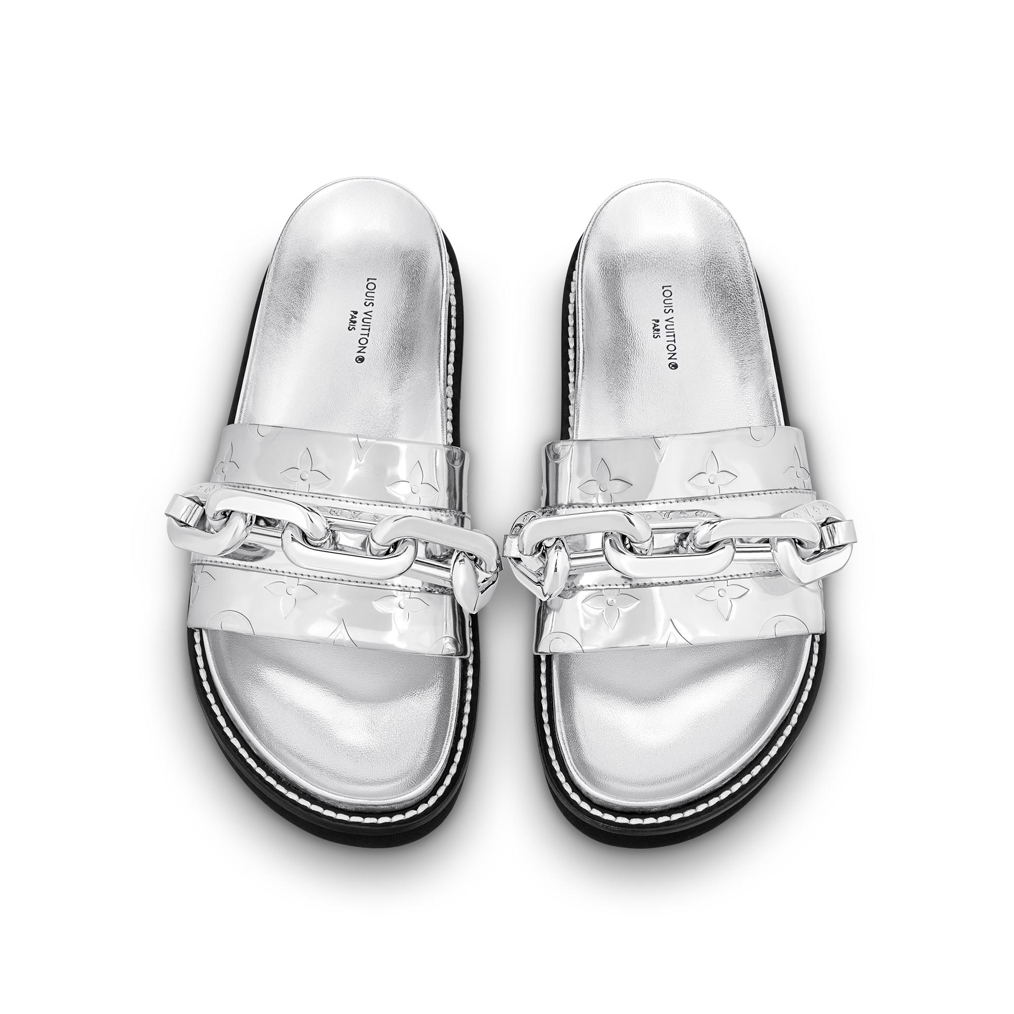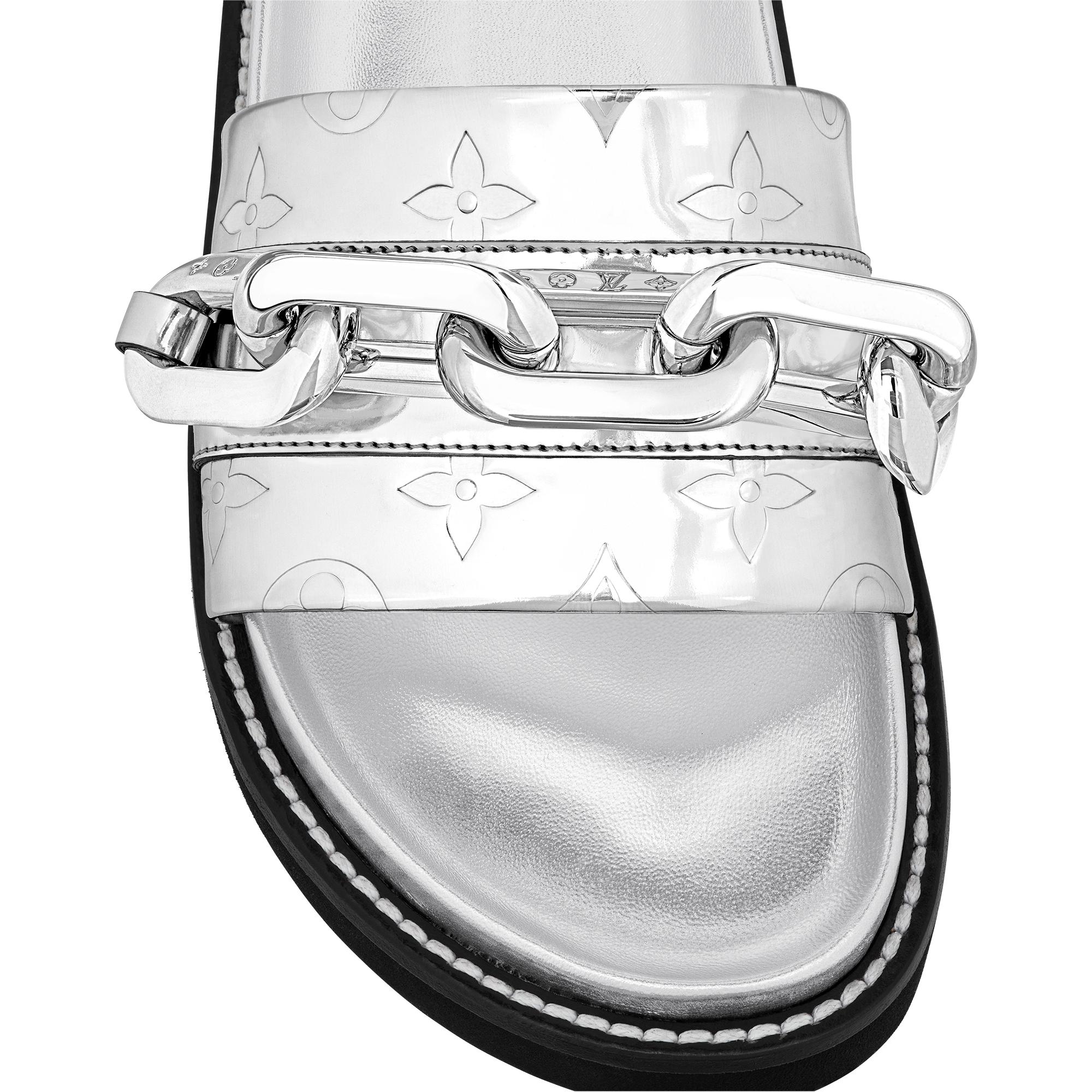 This glamorous take on the LV Sunset flat comfort mule comes in metallic calf leather embossed with the Monogram pattern. The wide front strap is embellished with an oversized metal chain inspired by Louis Vuitton leather goods. An anatomic insole and lightweight micro outsole enhance the comfort of this on-trend, easy-to-wear slide. Product details Silver Monogram-embossed metallic calf leather Anatomic insole Micro outsole Chain accessory Made in Italy1A9SDI Louis Vuitton Lv Sunset Flat Comfort Mule - Women - ShoesWomen - Shoes - Mules and Slides - Lv Sunset Flat Comfort Mule