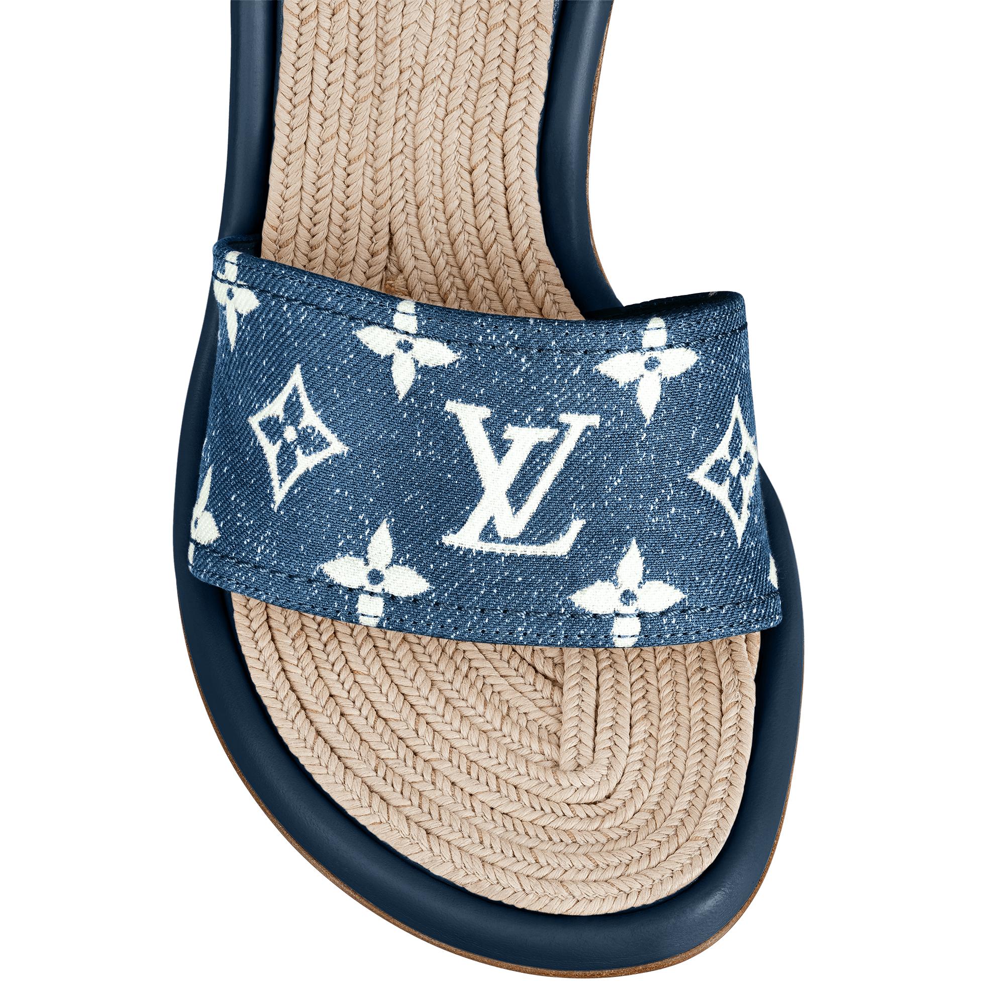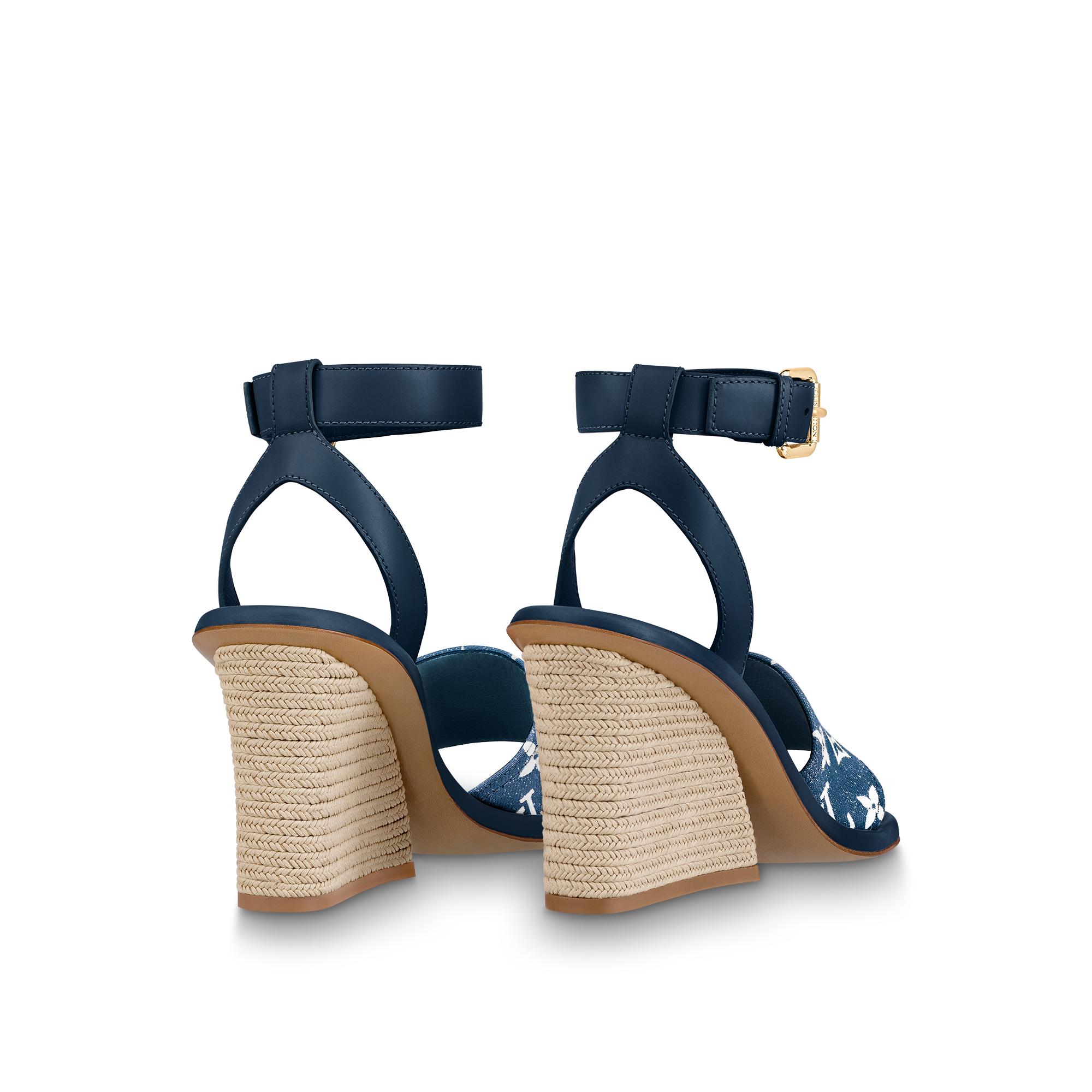 The Maia wedge sandal combines a wide front strap in Monogram denim with an ankle strap in matching calf leather. It features a sole and footbed in natural braided rope, inspired by the classic espadrille. A gold-tone buckle engraved with the Louis Vuitton signature completes this summer-ready design. Product details Navy Blue Monogram denim and calf leather Rope sole and footbed Rubber outsole 9 cm / 3.5-inch wedge heel Louis Vuitton-engraved buckle Made in Italy1A9RM1 Louis Vuitton Maia Wedge Sandal - Women - ShoesWomen - Shoes - Sandals and Espadrilles - Maia Wedge Sandal