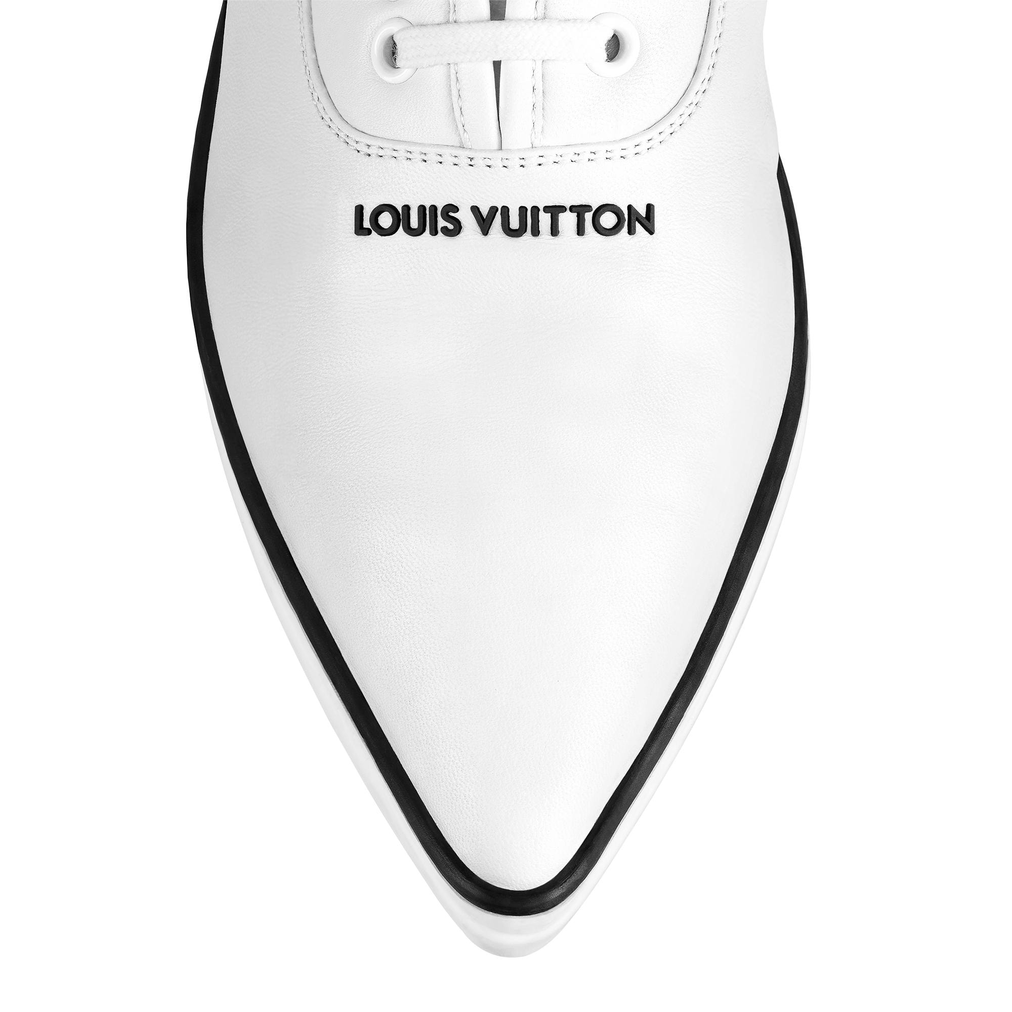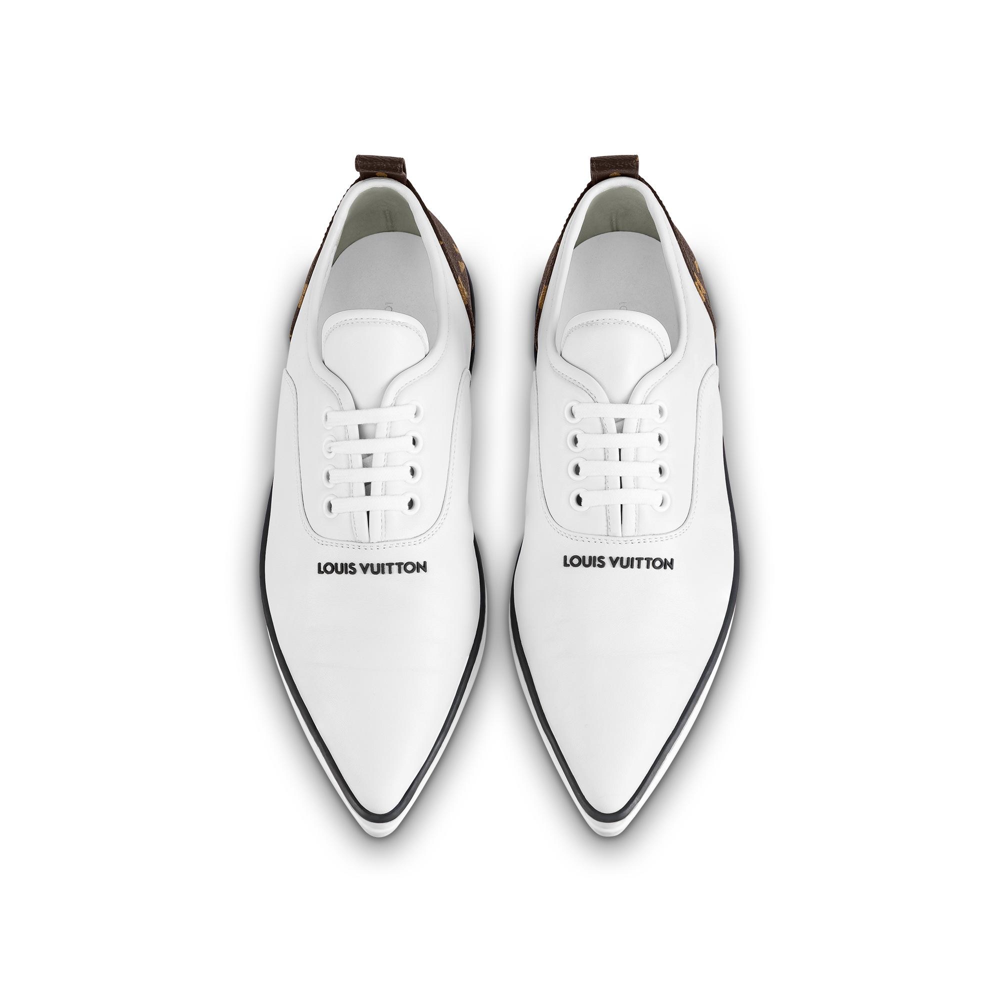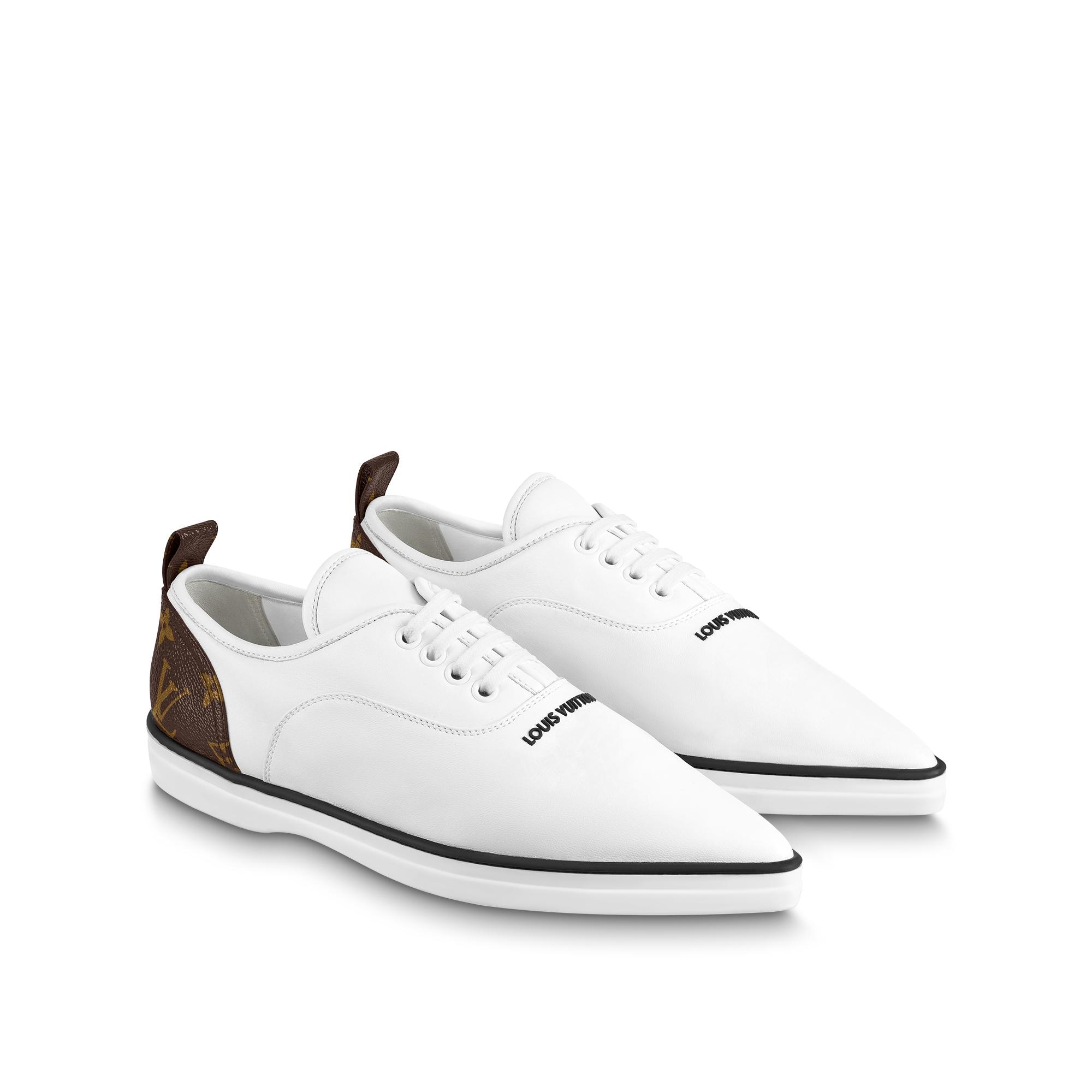 Designed by Louis Vuitton Artistic Director Nicolas Ghesquière, The Matchpoint sneaker is notable for its sleek lines and pointed toe. This version comes in supple lambskin, complemented by trim in Monogram canvas at the back. The upper features an injected Louis Vuitton signature, while the rubber outsole is bordered by a colored line. Product details White Lambskin and Monogram canvas Rubber outsole Louis Vuitton signature on the upper Patent Monogram-canvas back loop Made in Italy1AAD2B 38.0Louis Vuitton Matchpoint Sneaker - Women - ShoesWomen - Shoes - Sneakers - Matchpoint Sneaker