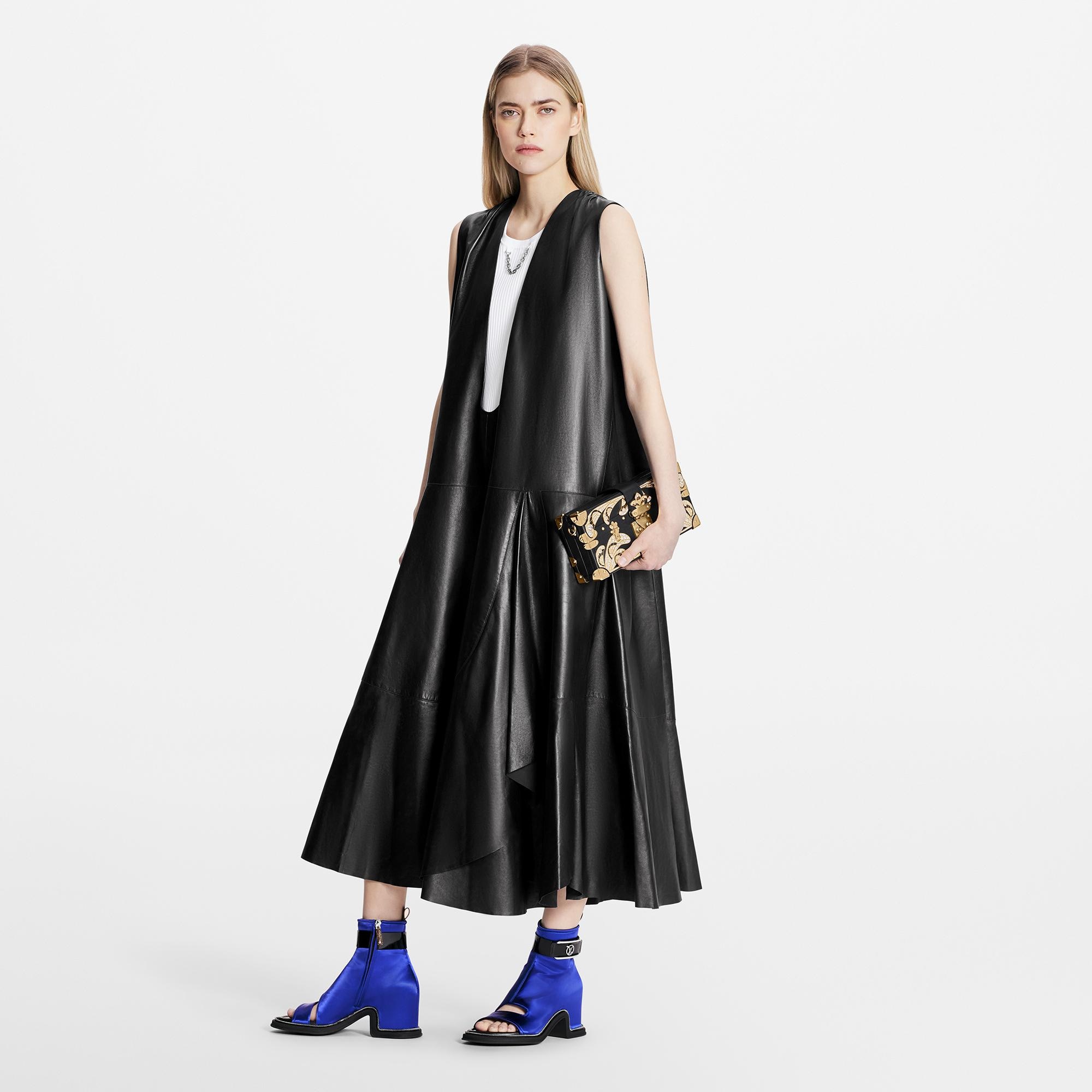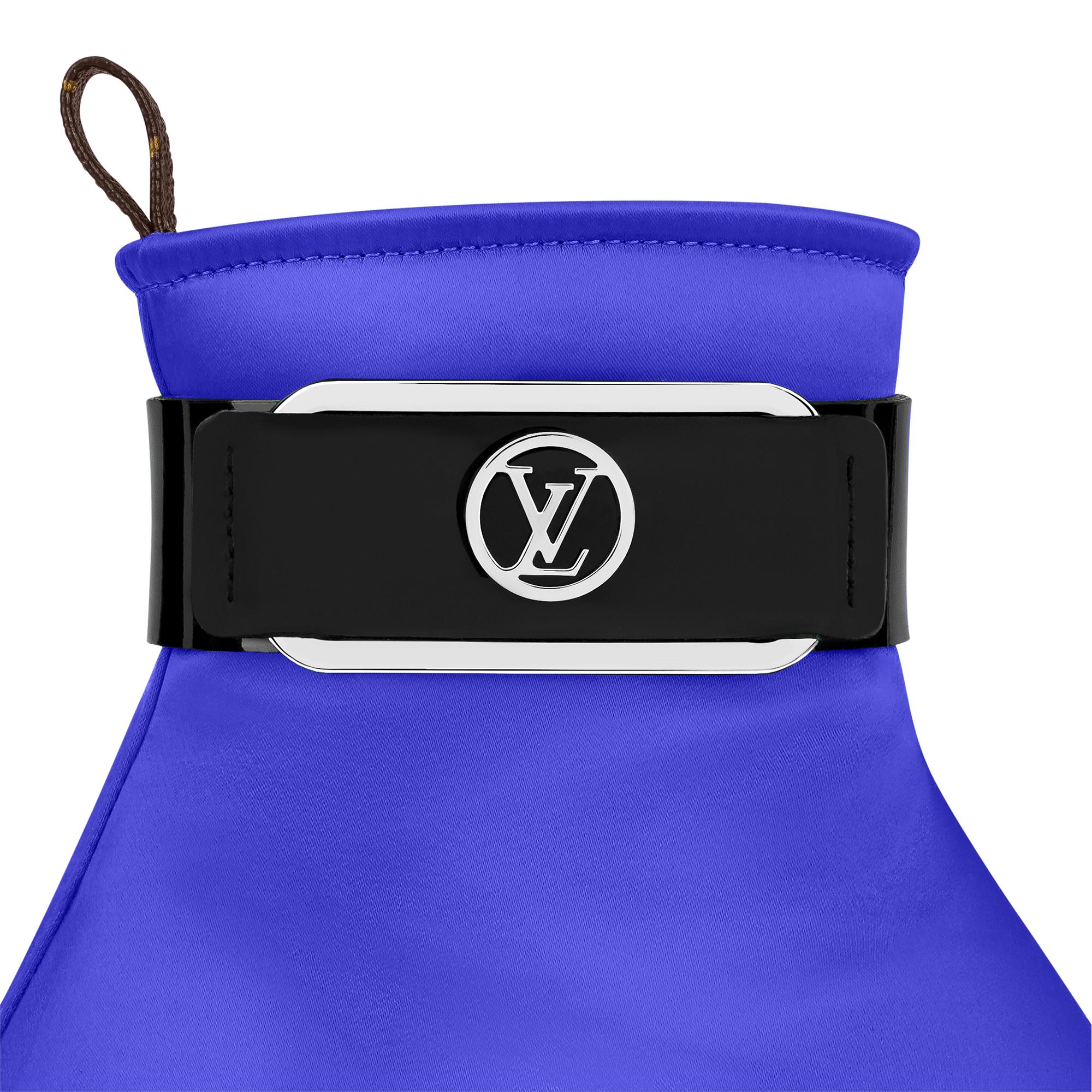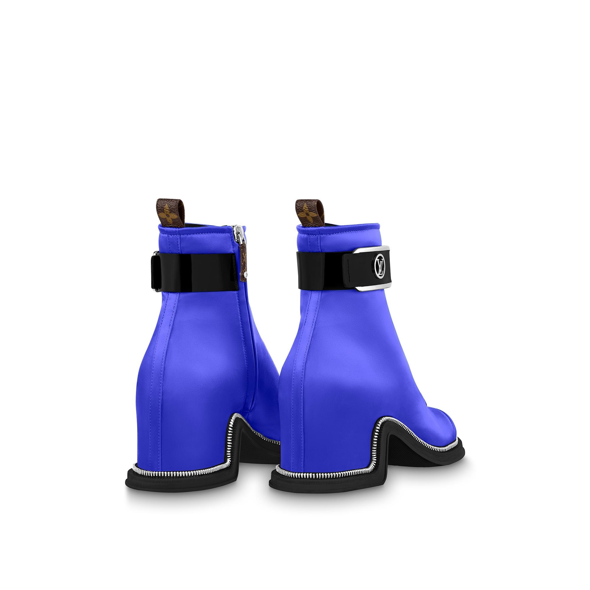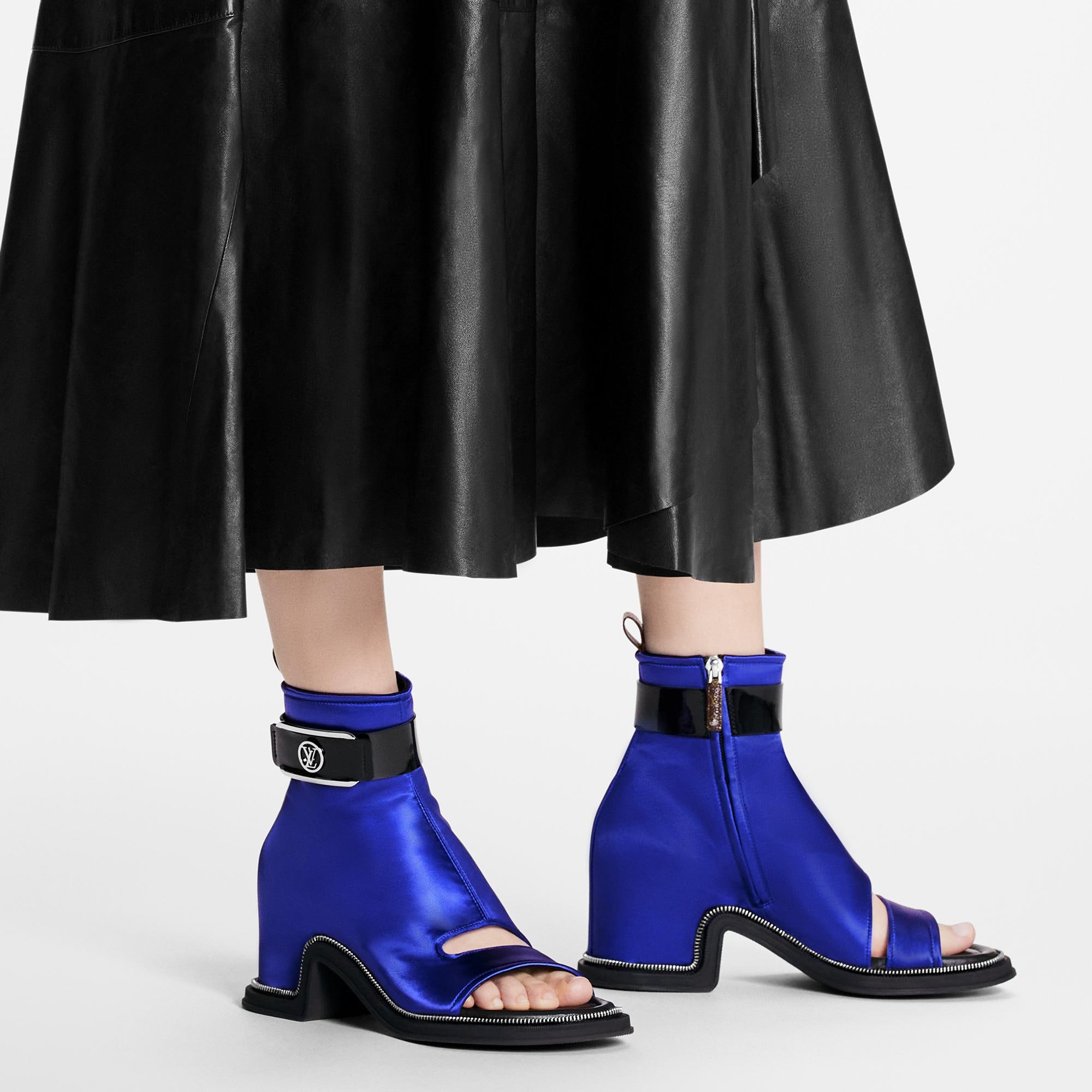 The Moonlight ankle boot is a fashion-forward, hybrid design which was the statement shoe of Louis Vuitton's Spring-Summer 2022 show. Crafted from brightly colored satin, it features an open toe and a sturdy heel which offers lift, yet remains easy to walk in. The wavy design of the outsole is highlighted by a decorative zip detail. Product details Bleu Roi Blue Satin Side zip Padded footbed Rubber outsole 5 cm / 2-inch heel LV Circle buckle Monogram-canvas back loop Made in Italy1AA0JN Royal BlueLouis Vuitton Moonlight Ankle Boot - Women - ShoesWomen - Shoes - Boots and Booties - Moonlight Ankle Boot