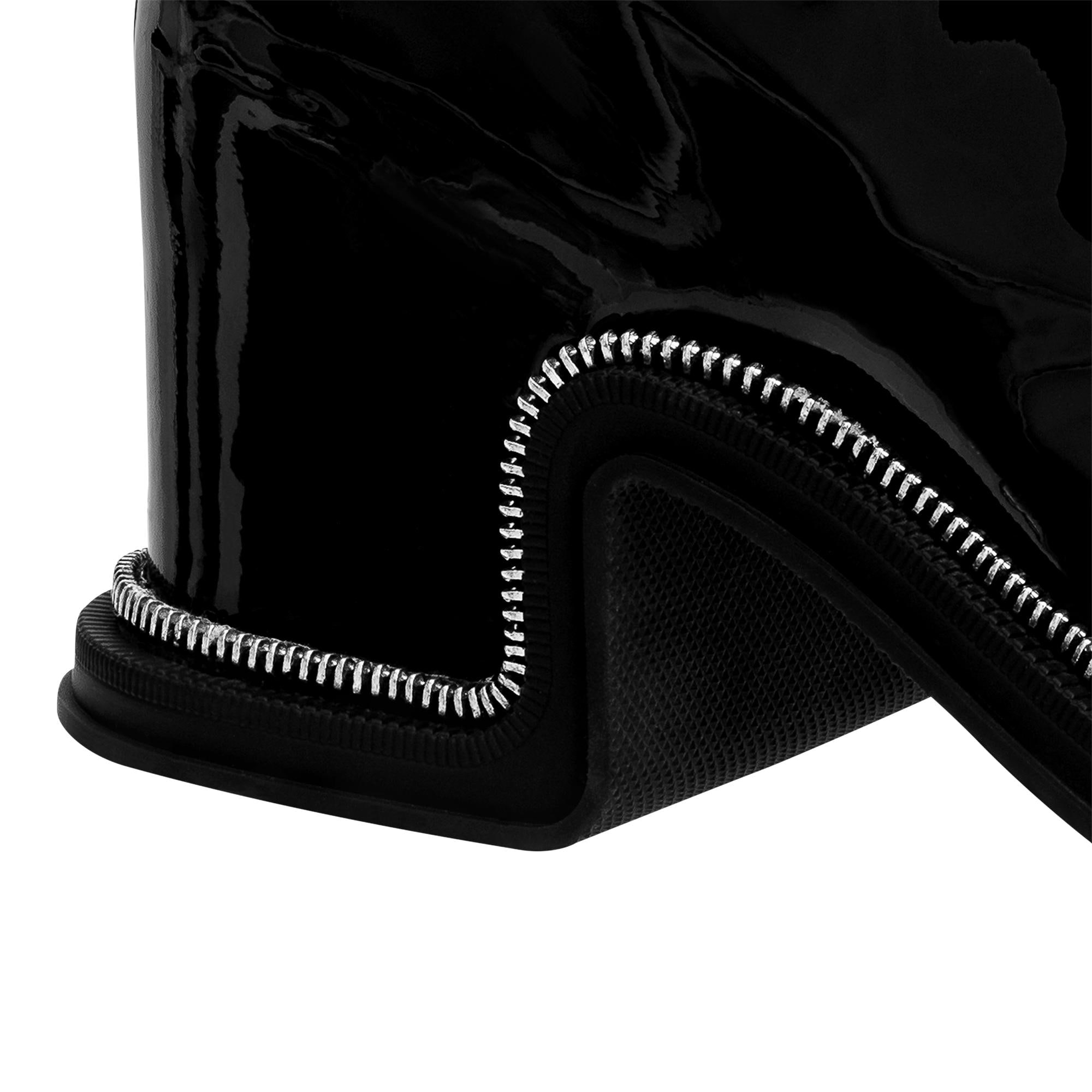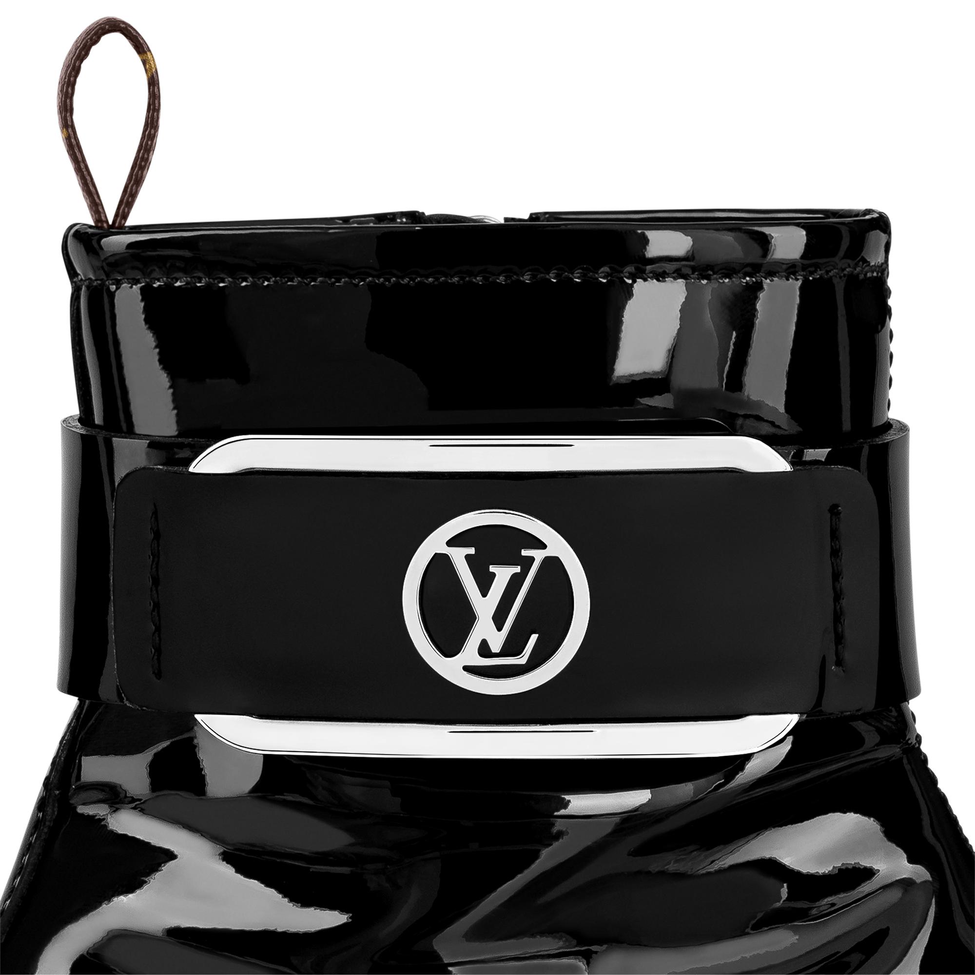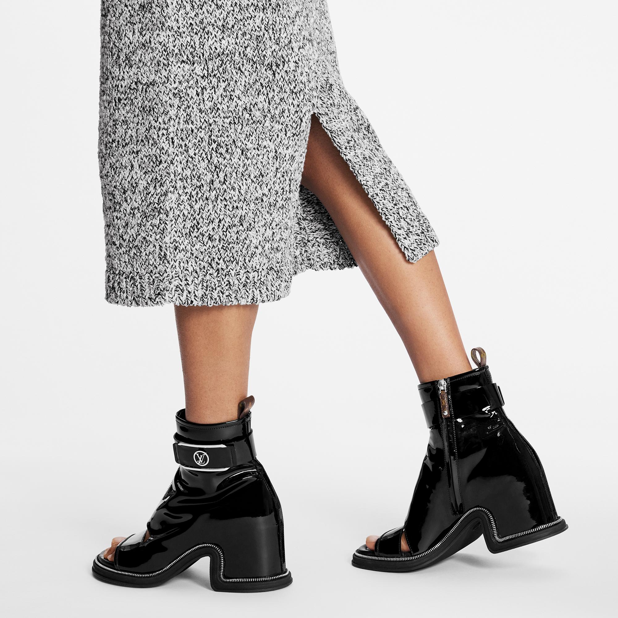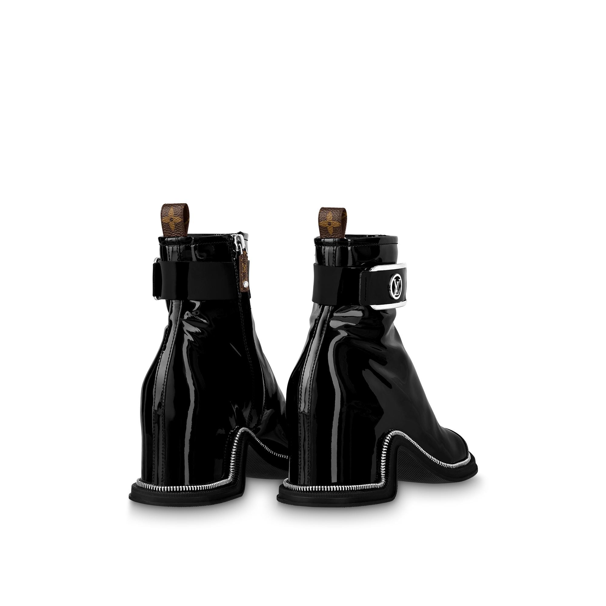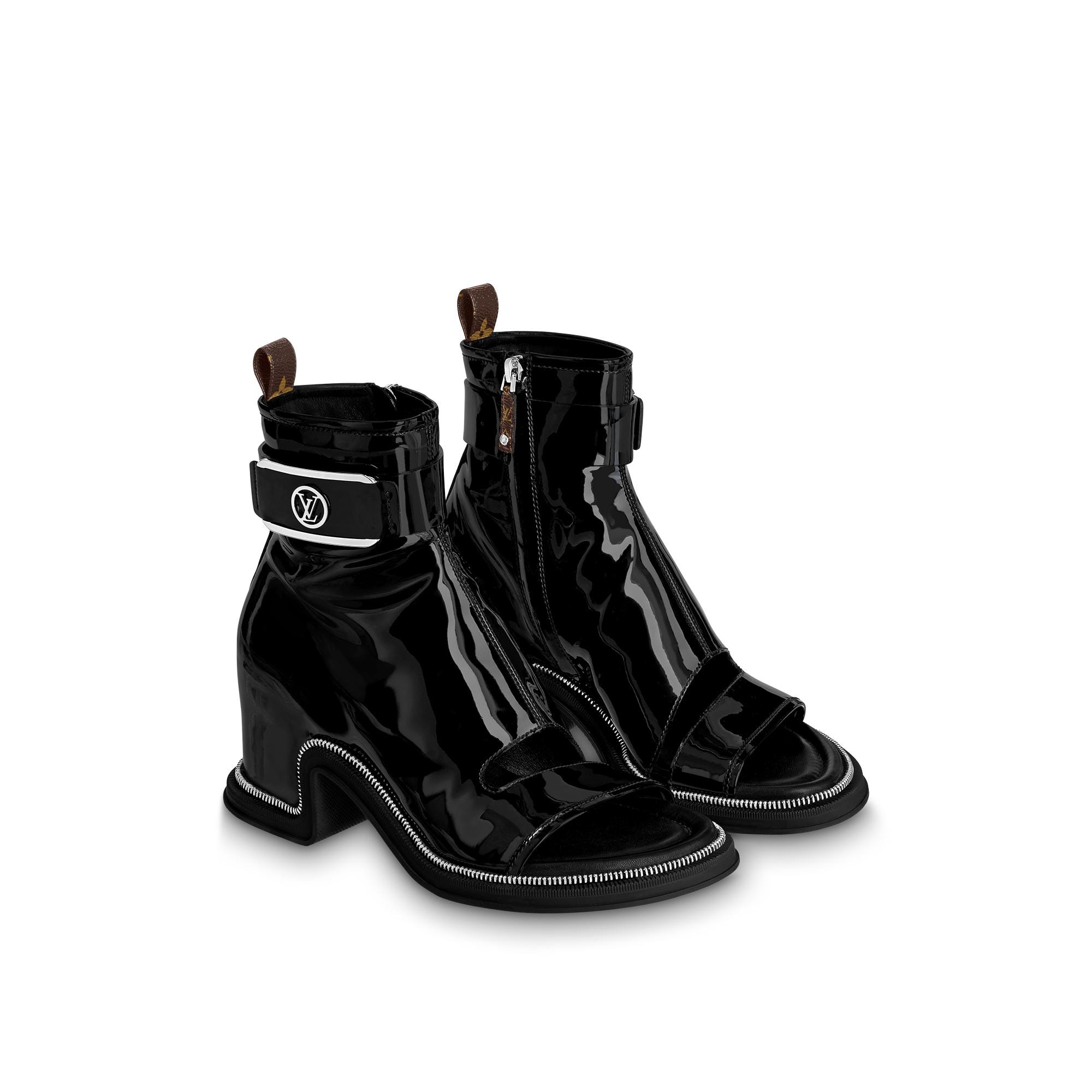 This version of the Moonlight ankle boot is crafted from glossy patent calf leather with silver-tone metal details: the LV Circle buckle on the strap and the decorative zip highlighting the wavy design of the outsole. This fashion-forward, hybrid style, which features an open toe and sturdy square heel, was the statement shoe of Louis Vuitton's Spring-Summer 2022 show. Product details Black Patent calf leather Side zip Padded footbed Rubber outsole 5 cm / 2-inch heel LV Circle buckle Monogram-canvas back loop Made in Italy1AA1YM Louis Vuitton Moonlight Ankle Boot - Women - ShoesWomen - Shoes - Boots and Booties - Moonlight Ankle Boot