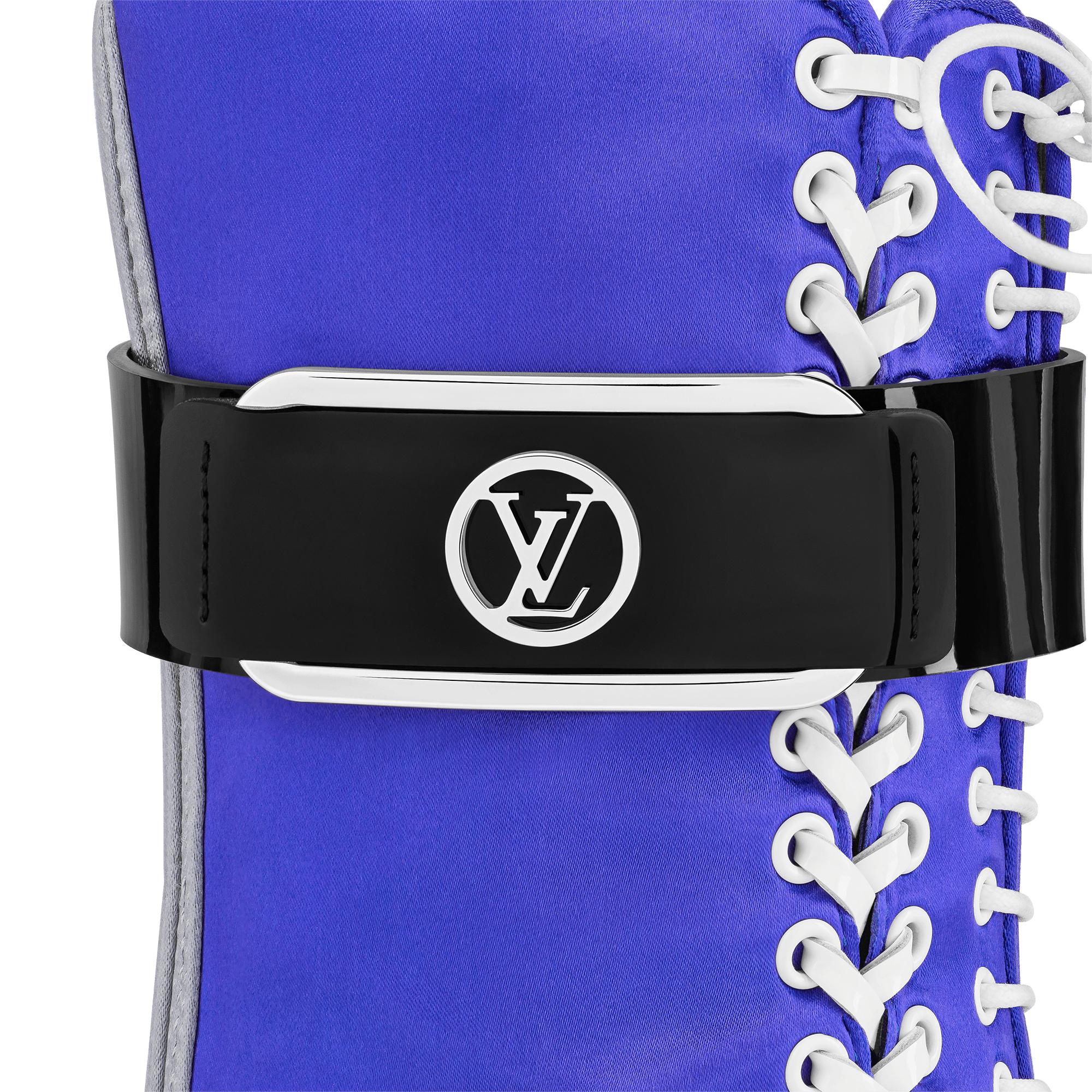 The Moonlight half boot was the stand-out style on Louis Vuitton's Spring-Summer 2022 runway. This version in brightly colored satin fuses past, present and future with its laces inspired by 19th-century corsets, open toe, and sturdy heel with decorative zip detailing. The strap around the top features a silver-tone LV Circle buckle. Product details Bleu Roi Blue Satin Side zip Padded footbed Rubber outsole 5 cm / 2-inch heel LV Circle buckle Monogram-canvas back loop Made in Italy1AA0MZ Louis Vuitton Moonlight Half Boot - Women - ShoesWomen - Shoes - Boots and Booties - Moonlight Half Boot