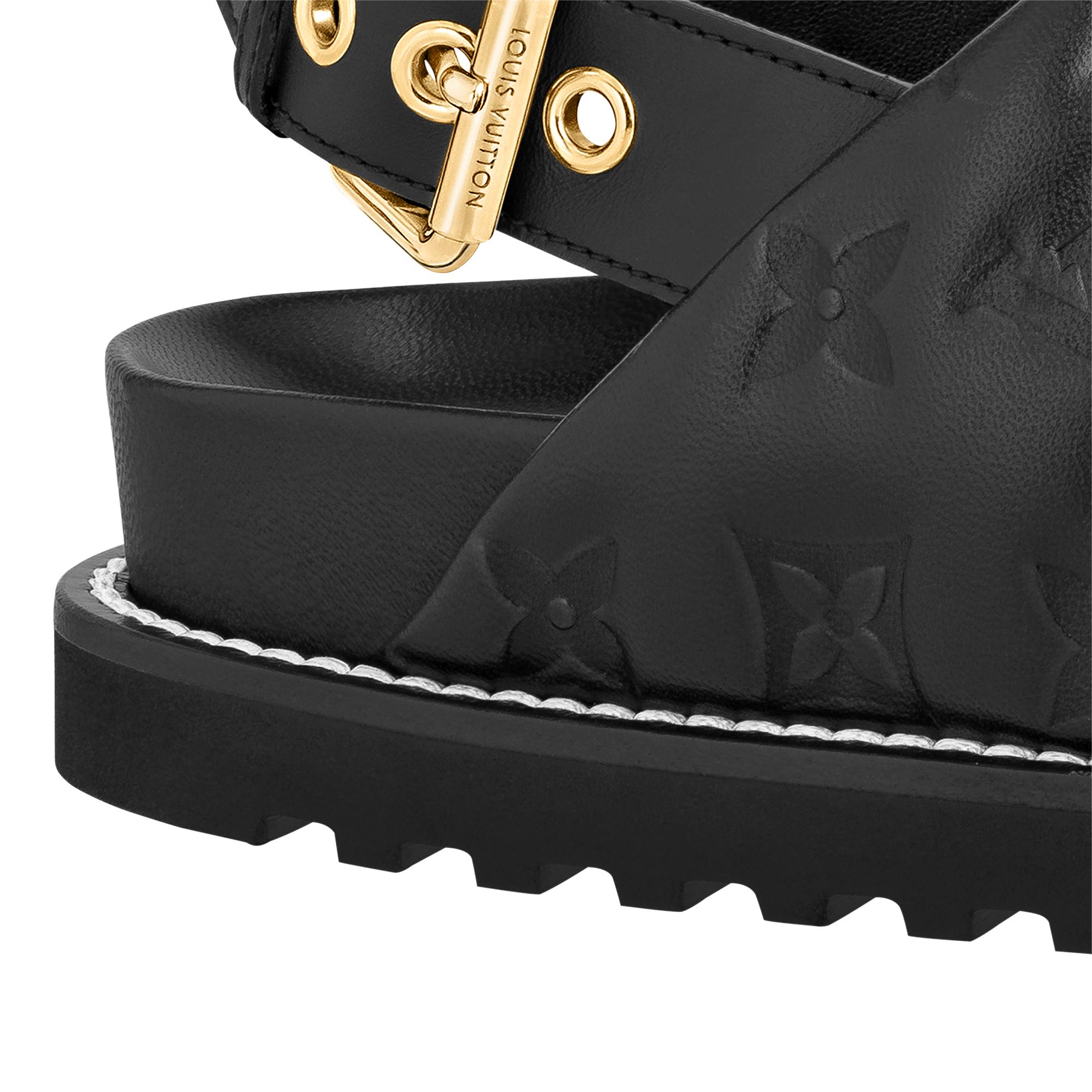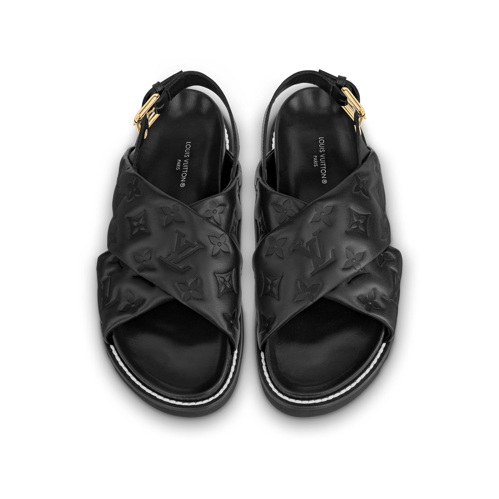 The Paseo flat comfort sandal is reworked this season with two wide, crossover straps in soft, padded lambskin embossed with the iconic Monogram pattern. This fashionable, easy-to-wear style features a lightweight rubber outsole and an anatomical footbed for all-day comfort. The back strap is adjusted with an engraved, gold-tone buckle. Product details Black Monogram-embossed lambskin Anatomic insole Treaded rubber outsole Louis Vuitton-engraved buckle Made in Italy1A9RDO BlackLouis Vuitton Paseo Flat Comfort Sandal - Women - ShoesWomen - Shoes - Sandals and Espadrilles - Paseo Flat Comfort Sandal