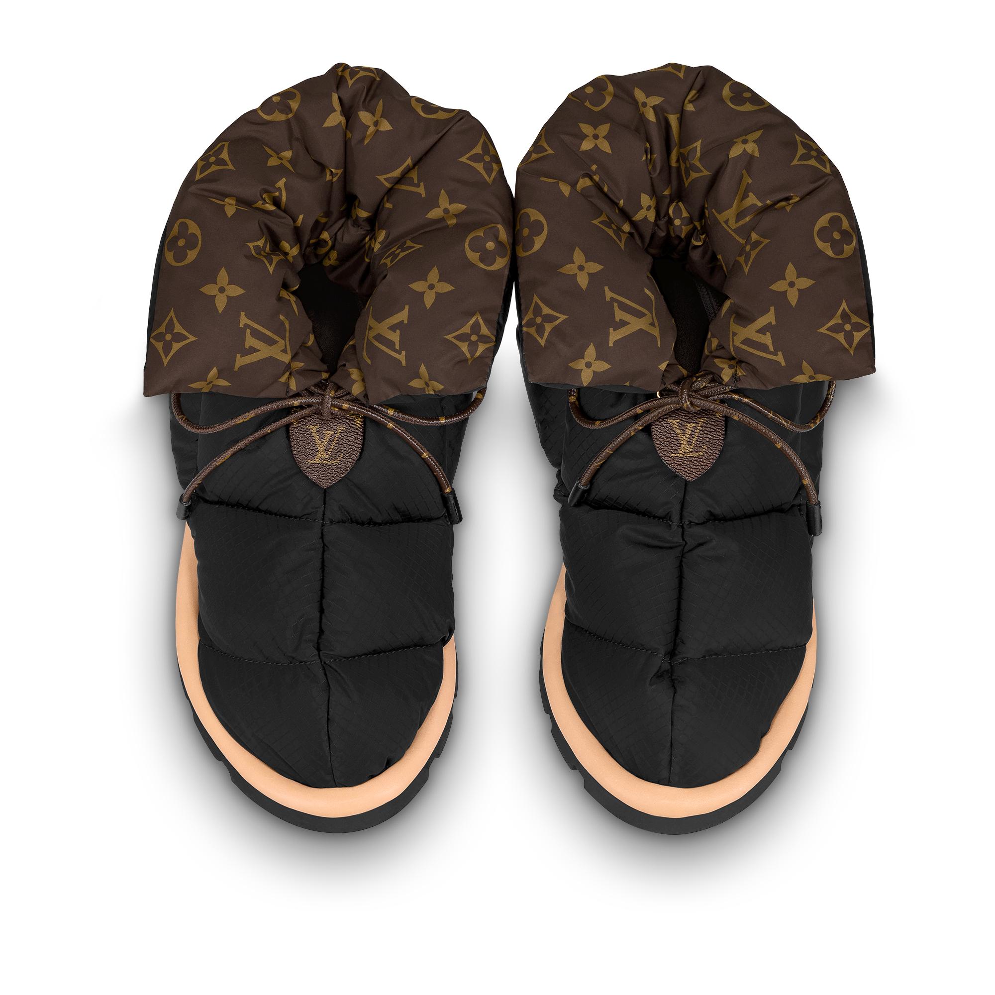 A cold-weather essential, the Pillow comfort ankle boot comes in water-repellent nylon with a warm down filling. The upper has a refined quilted finish, while the lining features the iconic Monogram pattern Its "sock like" inner layer in mesh textile ensures a perfect hold of the feet while offering comfort. Designed by Louis Vuitton Artistic Director Nicolas Ghesquière, this model is finished with a lightweight micro outsole with a contour in nappa leather, and can be worn outdoors as well as indoors. Product details Black Nylon Down interior Treaded micro outsole Monogram-canvas laces Made in Italy1A8T3F BlackLouis Vuitton Pillow Comfort Ankle Boot - Women - ShoesWomen - Shoes - Boots and Booties - Pillow Comfort Ankle Boot