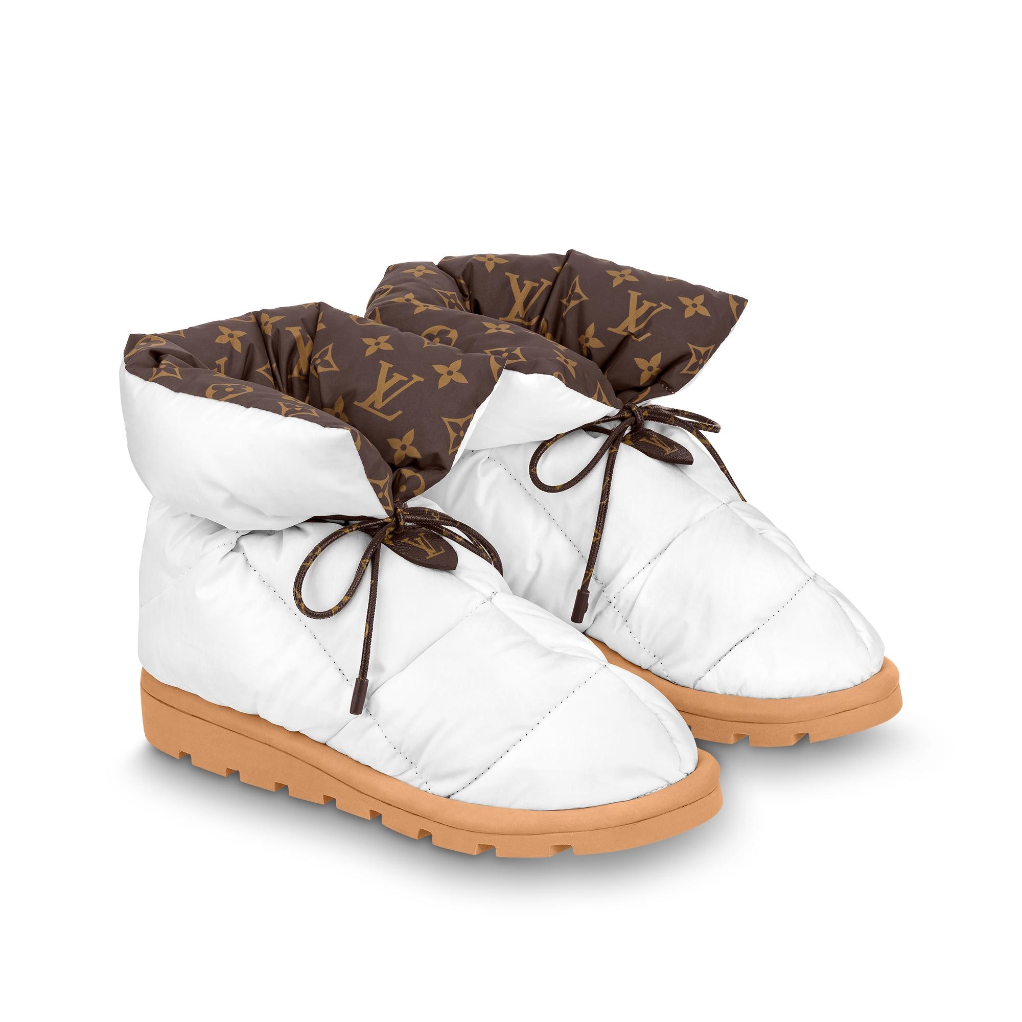 A cold-weather essential, the Pillow flat ankle boot comes in water-repellent nylon with a warm down filling. The upper has a refined quilted finish, while the lining features the iconic Monogram pattern. Designed by Louis Vuitton Artistic Director Nicolas Ghesquière, this model is finished with a lightweight micro outsole with a contour in nappa effect. Product details White Nylon Down interior Treaded micro outsole Monogram-canvas label Monogram-canvas laces Made in Italy1A8T3X WhiteLouis Vuitton Pillow Comfort Ankle Boot - Women - ShoesWomen - Shoes - Boots and Booties - Pillow Comfort Ankle Boot
