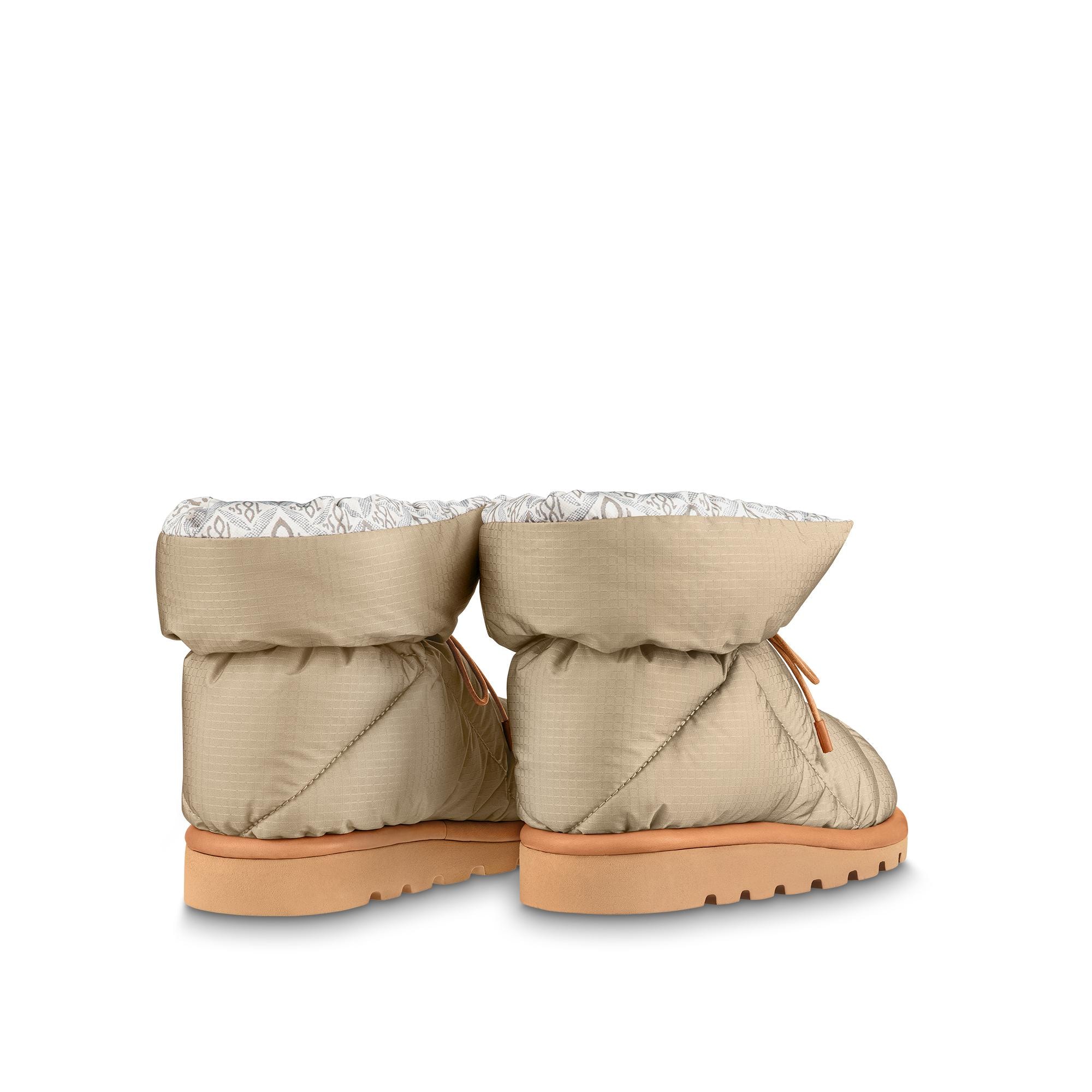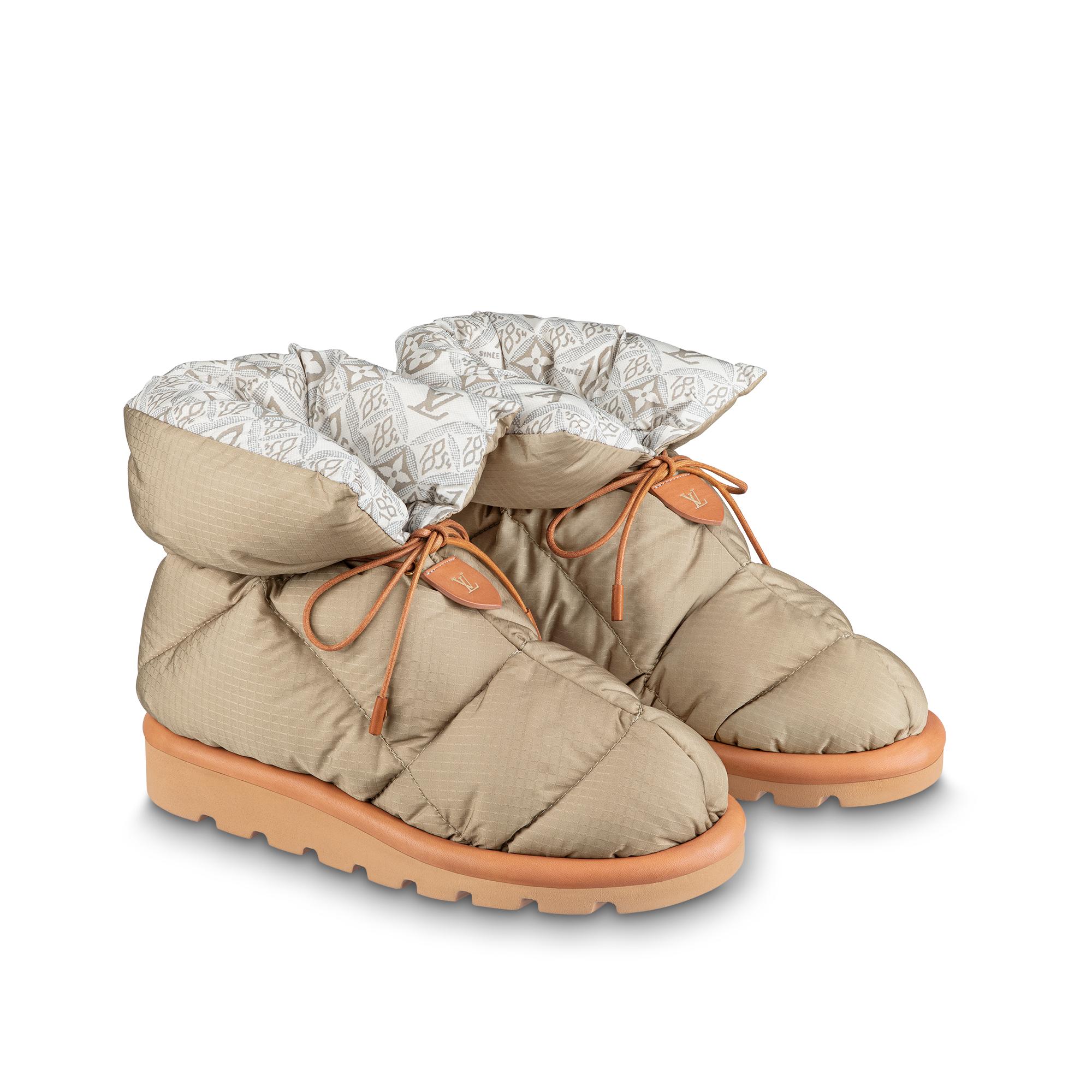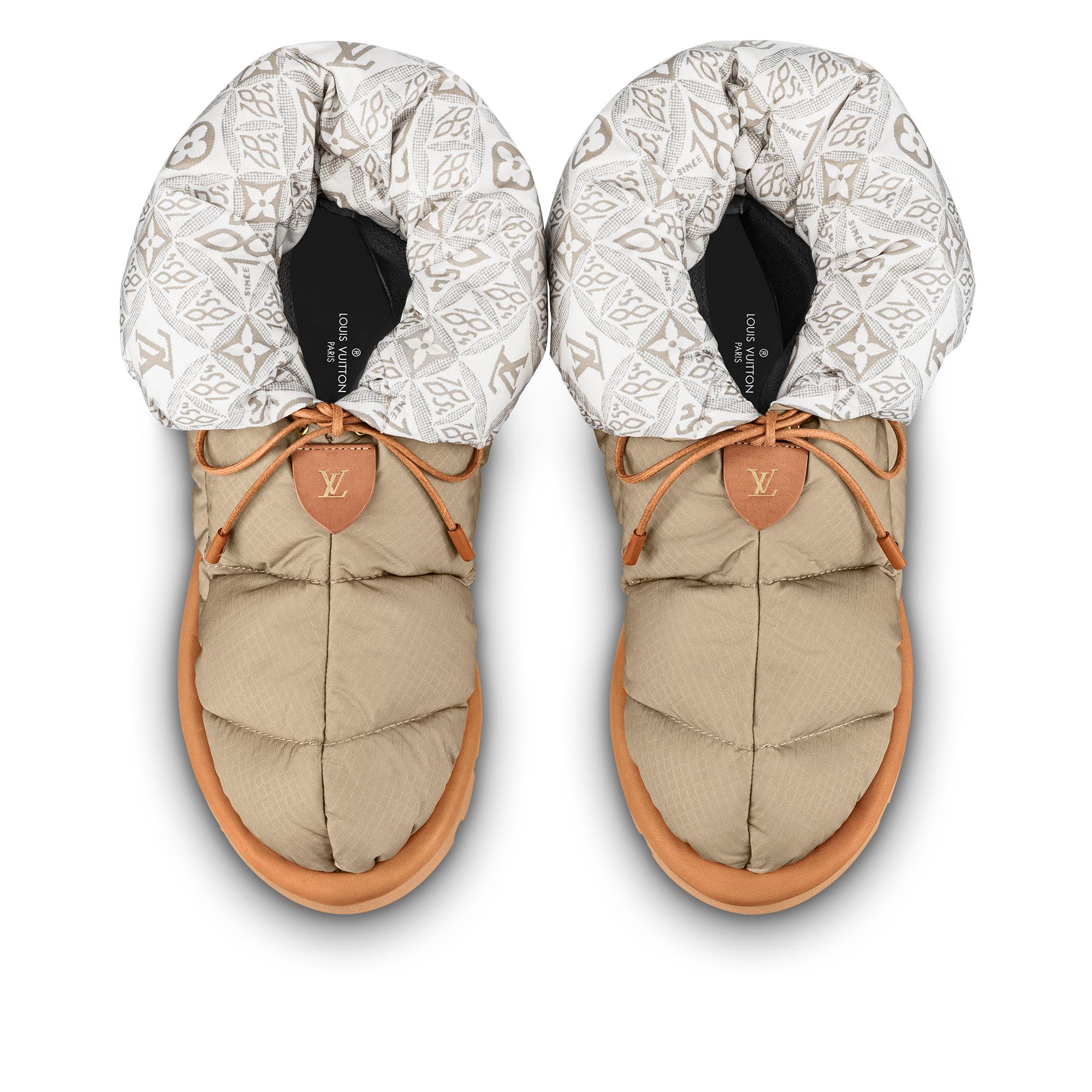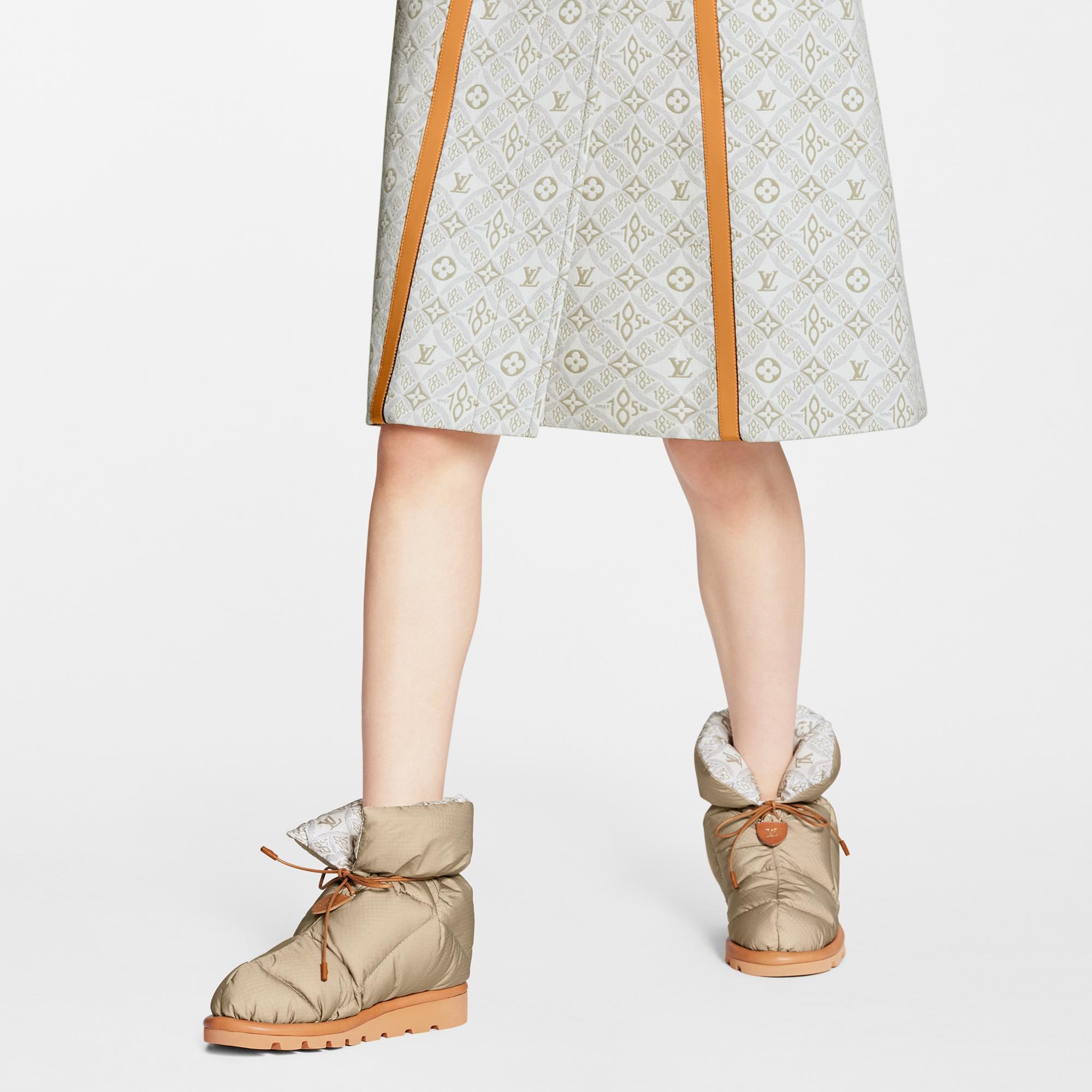 A cold-weather essential, the Pillow comfort ankle boot comes in recycled nylon with a warm down filling. It is lined with the Since 1854 print, which combines Louis Vuitton symbols with the date the House was founded. This model provides exceptional comfort with its down-filled upper, mesh inner layer which supports the foot, and lightweight micro outsole. Product details Beige Recycled nylon Down filling Anatomic insole Treaded micro outsole LV Initials tag Made in Italy1A9RLO Louis Vuitton Pillow Comfort Ankle Boot - Women - ShoesWomen - Shoes - Boots and Booties - Pillow Comfort Ankle Boot