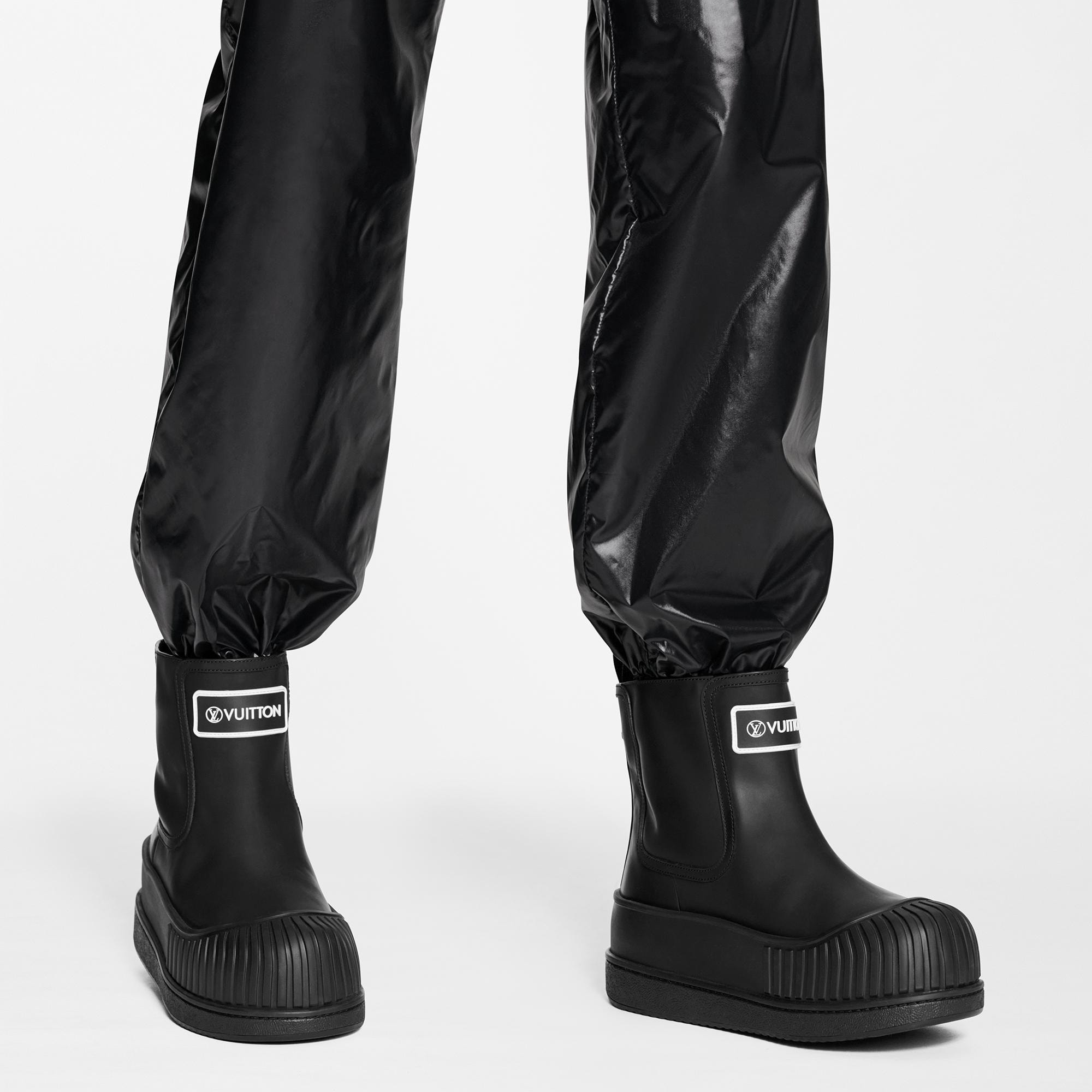 The Polar flat ankle boot comes in rubber-effect calf leather. The thick rubber outsole and rounded toe are color-matched to the upper for a distinctive "dipped-in-paint" look. Both waterproof and lightweight, this boot is easy to slip on and off thanks to its elastic side panels. Product details Black Calf leather Elastic side panels Rubber outsole Vuitton rubber tag Patent Monogram-canvas back loop Made in Italy1A9H49 Louis Vuitton Polar Flat Ankle Boot - Women - ShoesWomen - Shoes - Boots and Booties - Polar Flat Ankle Boot
