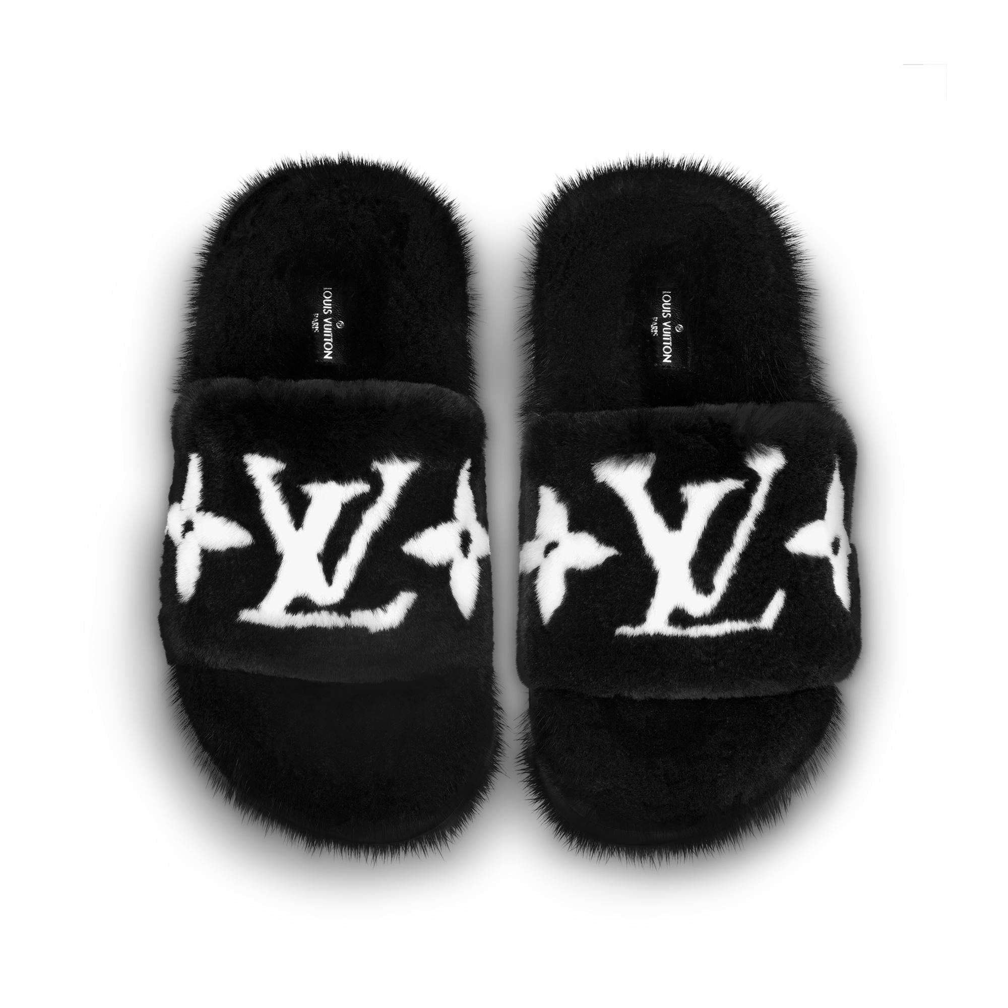 This exotic piece cannot be shipped to the city of San Francisco, Berkley and Los Angeles, California. Please call Client Services at +1.866.VUITTON for more details.This luxurious version of the Pool Pillow comfort mule is crafted from soft mink fur for instant warmth and comfort. The wide front strap features contrasting mink inserts, which form the LV Initials and Monogram Flowers. This model is finished with an anatomic footbed, also covered in mink, and a lightweight micro outsole with a contour in napa leather. Product details Black Mink Anatomic insole Treaded micro outsole LV Initials and Monogram Flowers Made in Italy1A9BZJ BlackLouis Vuitton Pool Pillow Comfort Mule - Women - ShoesWomen - Shoes - Mules and Slides - Pool Pillow Comfort Mule