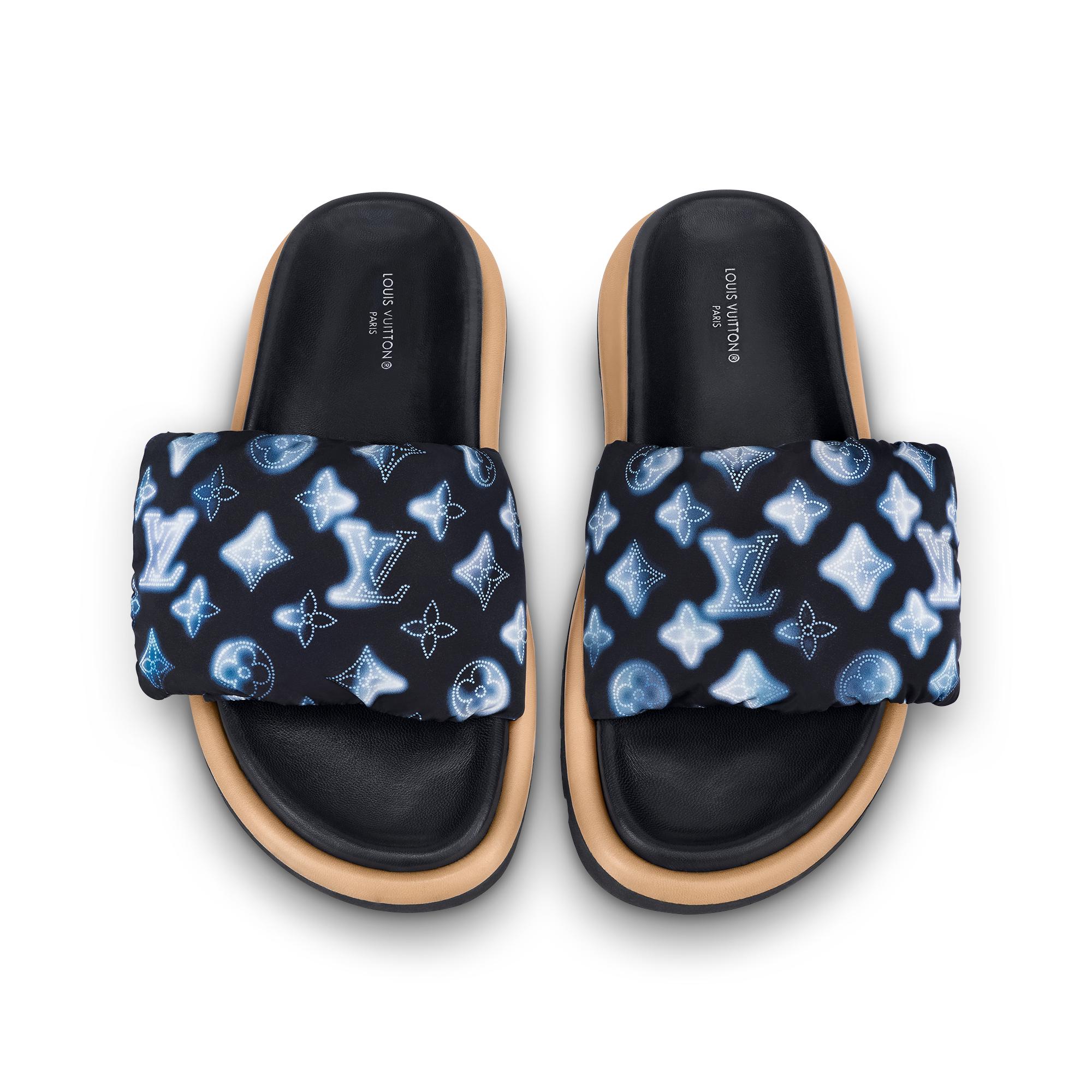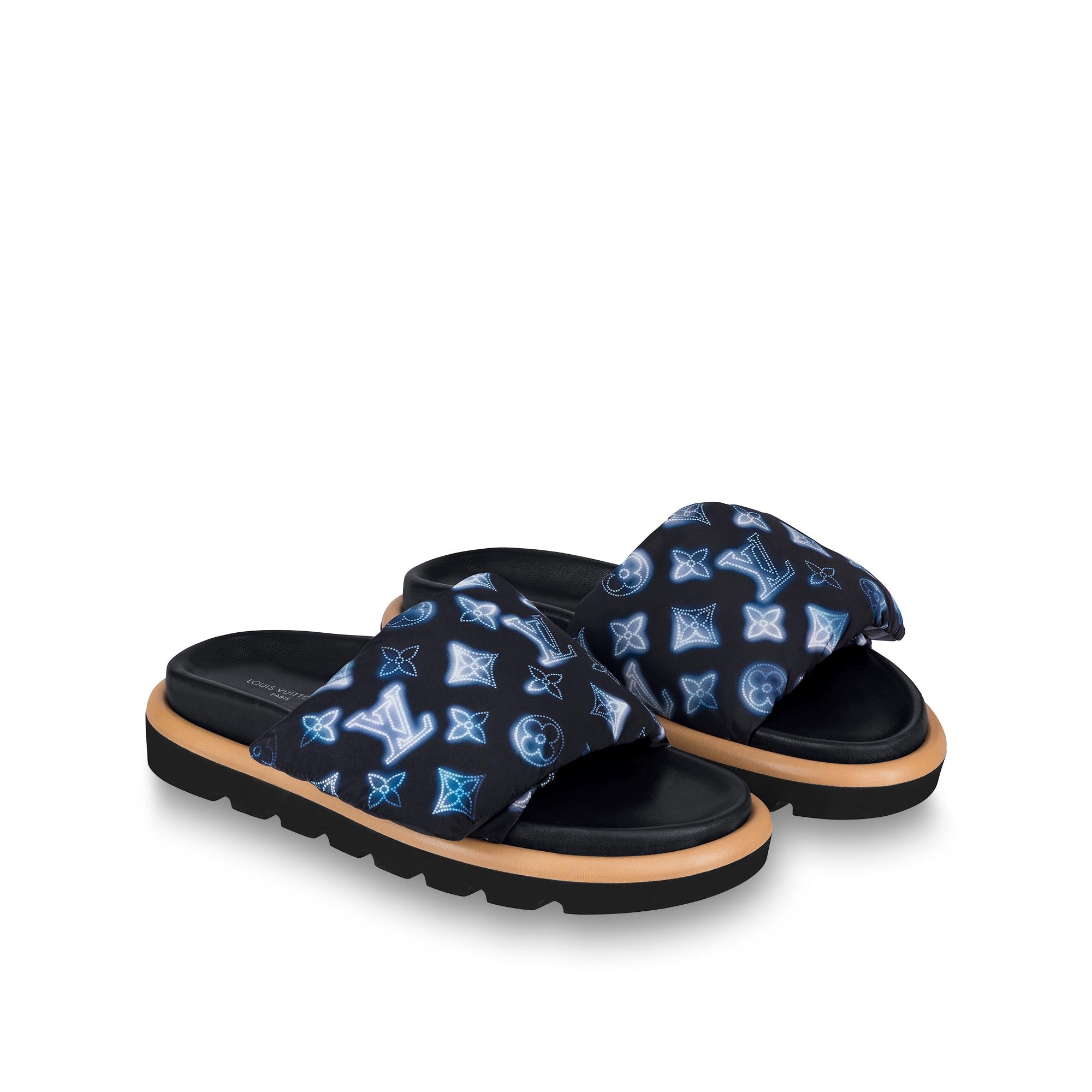 The Pool Pillow comfort mule is a warm-weather version of the must-have Pillow ankle boot. It features an adjustable front strap in recycled nylon with a soft down filling, and a lightweight micro outsole with a contour in nappa leather. The strap is printed with the season's Flight Mode pattern, which reinterprets Louis Vuitton's iconic Monogram. Product details Navy Blue Recycled, printed nylon Down filling Velcro strap Anatomic insole Treaded micro outsole Made in Italy1A9SMR Louis Vuitton Pool Pillow Comfort Mule - Women - ShoesWomen - Shoes - Mules and Slides - Pool Pillow Comfort Mule