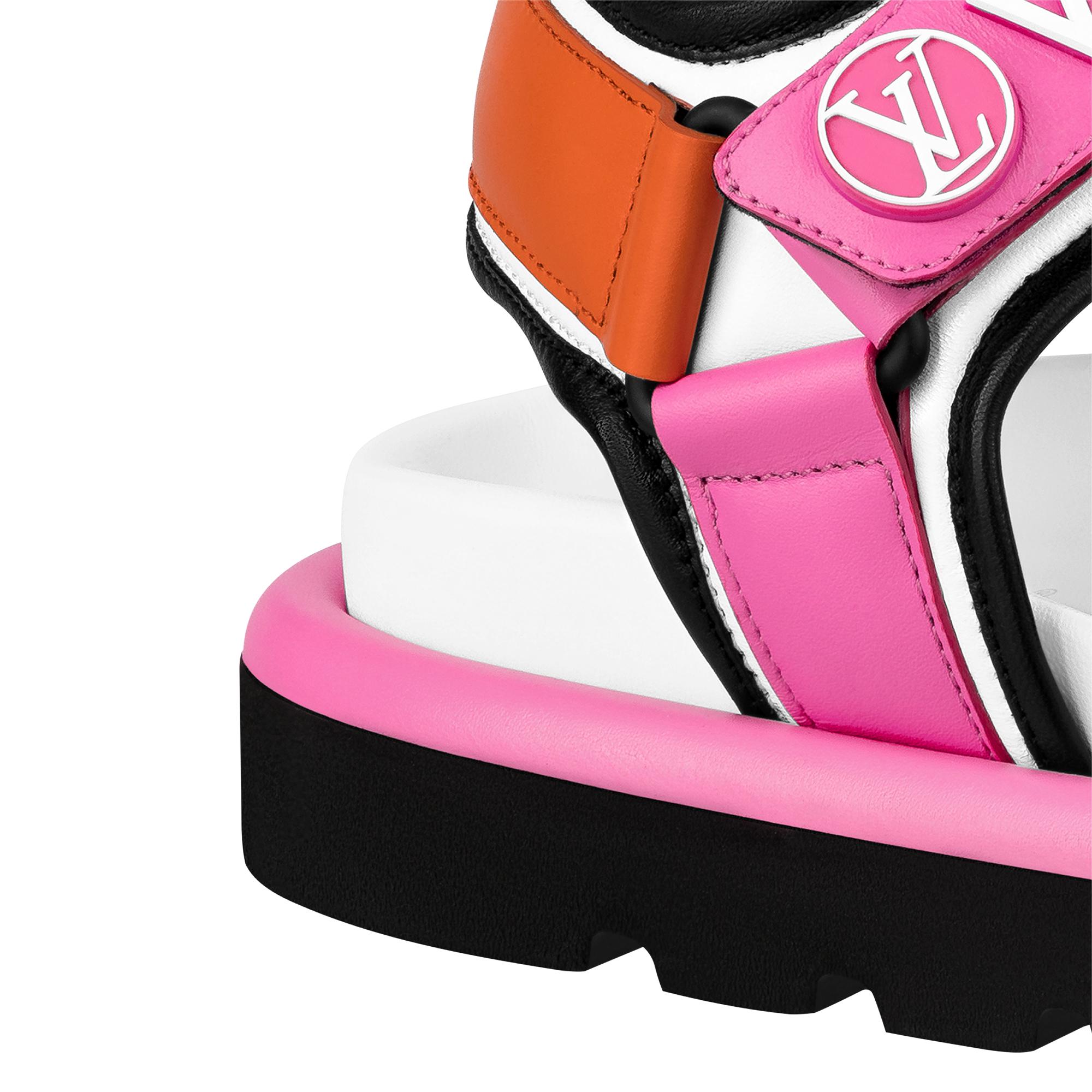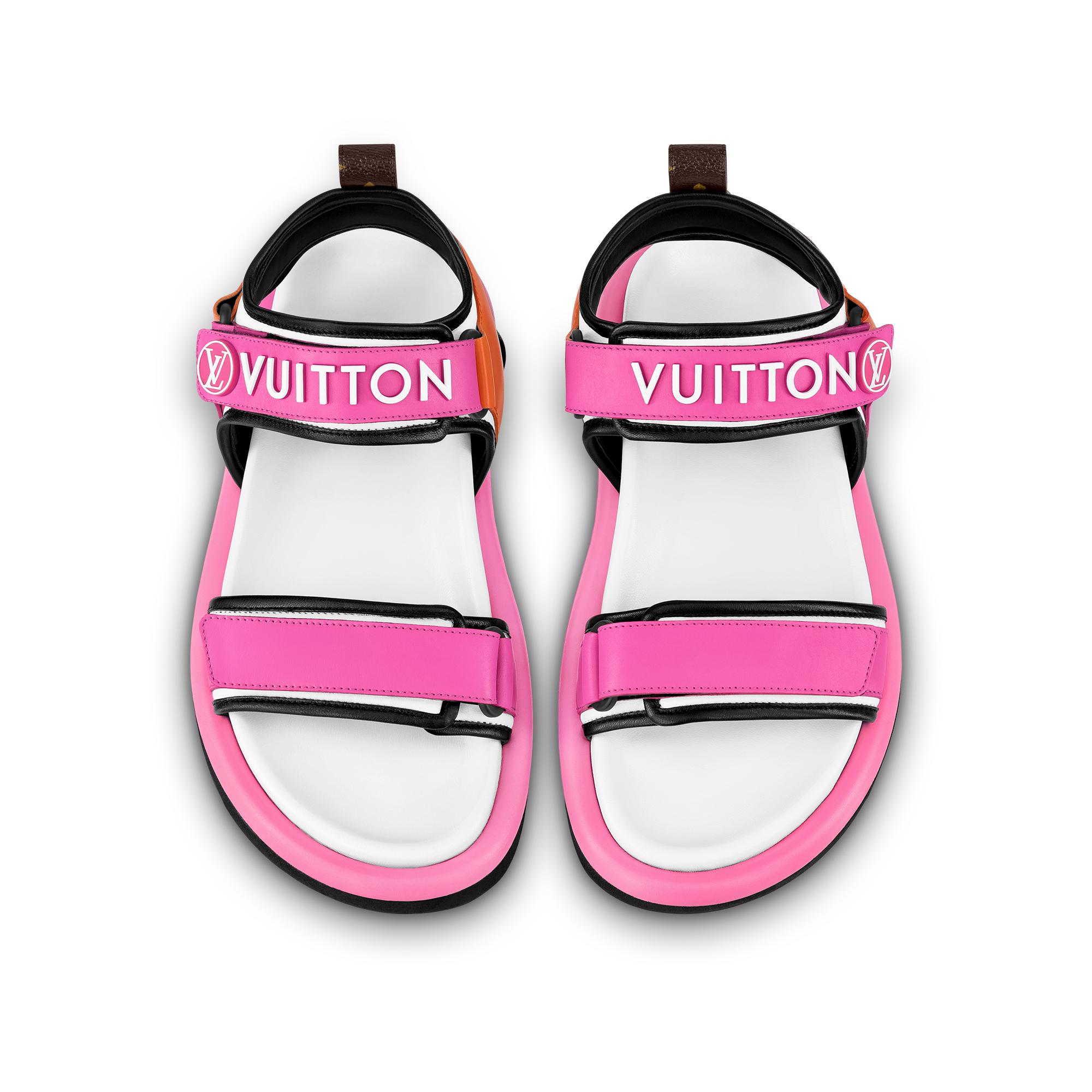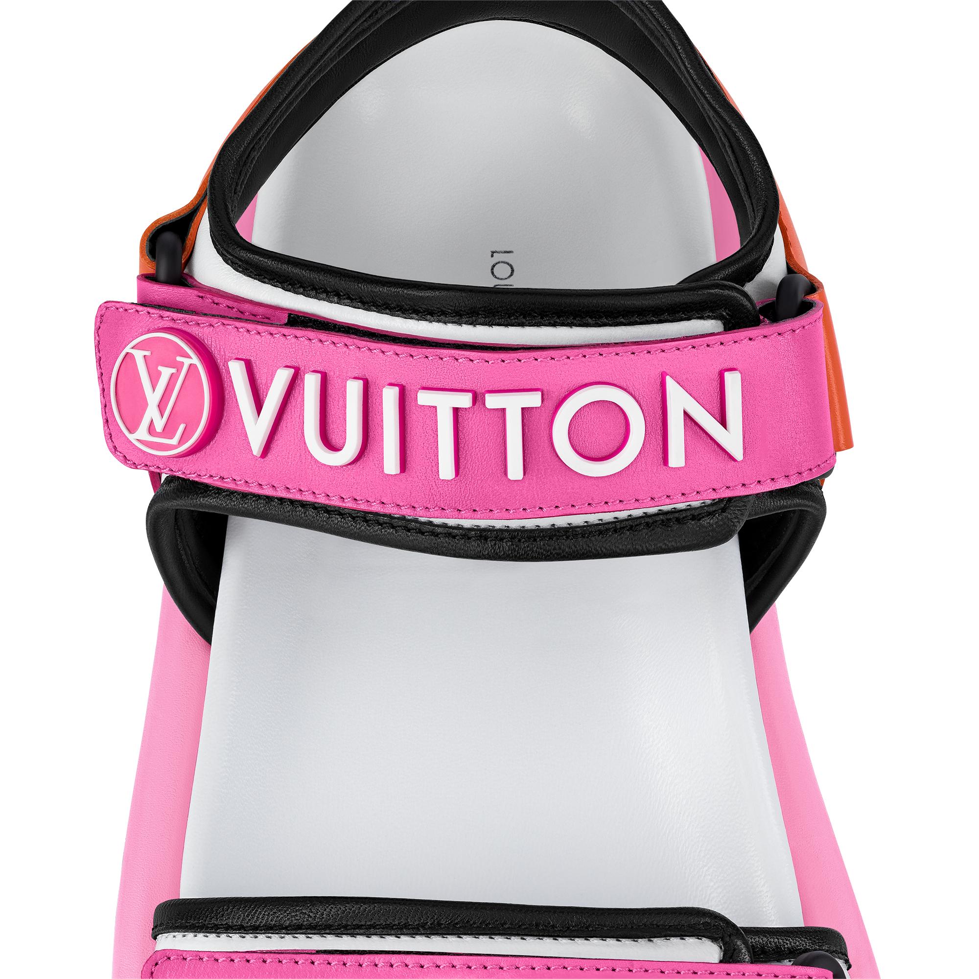 This sporty version of the Pool Pillow flat comfort sandal references the vibrant colors and graphic effects of Louis Vuitton's Cruise 2022 collection. It features adjustable velcro straps, one of which bears the LV Circle and Vuitton signatures in rubber. With its anatomic insole and lightweight micro outsole, this model offers ultimate comfort. Product details Rose Pop Pink Calf leather Velcro straps Anatomic insole Treaded micro outsole LV Circle rubber patch Rubber Vuitton signature Patent Monogram-canvas back loop Made in Italy1A9OCL PinkLouis Vuitton Pool Pillow Comfort Sandal - Women - ShoesWomen - Shoes - Sandals and Espadrilles - Pool Pillow Comfort Sandal