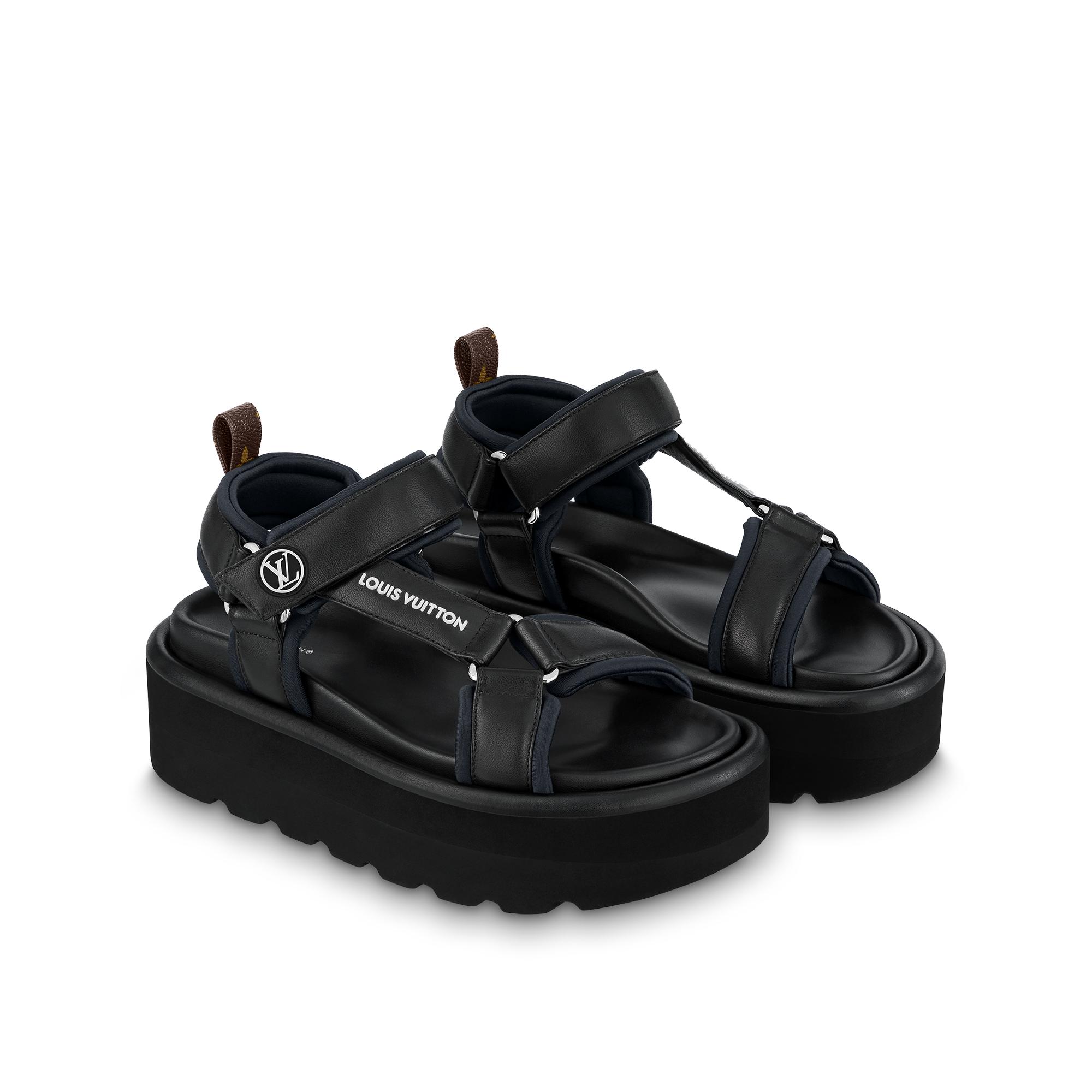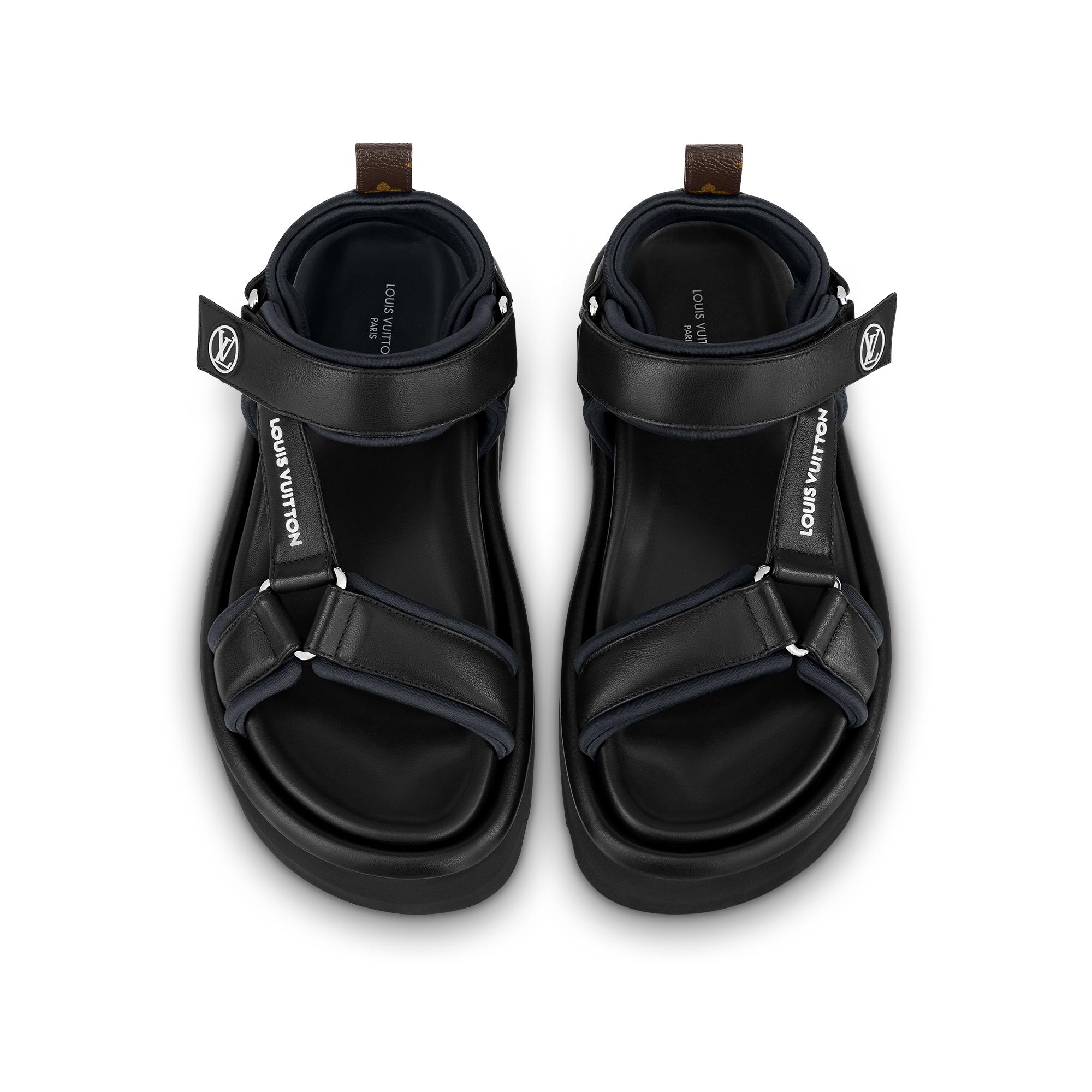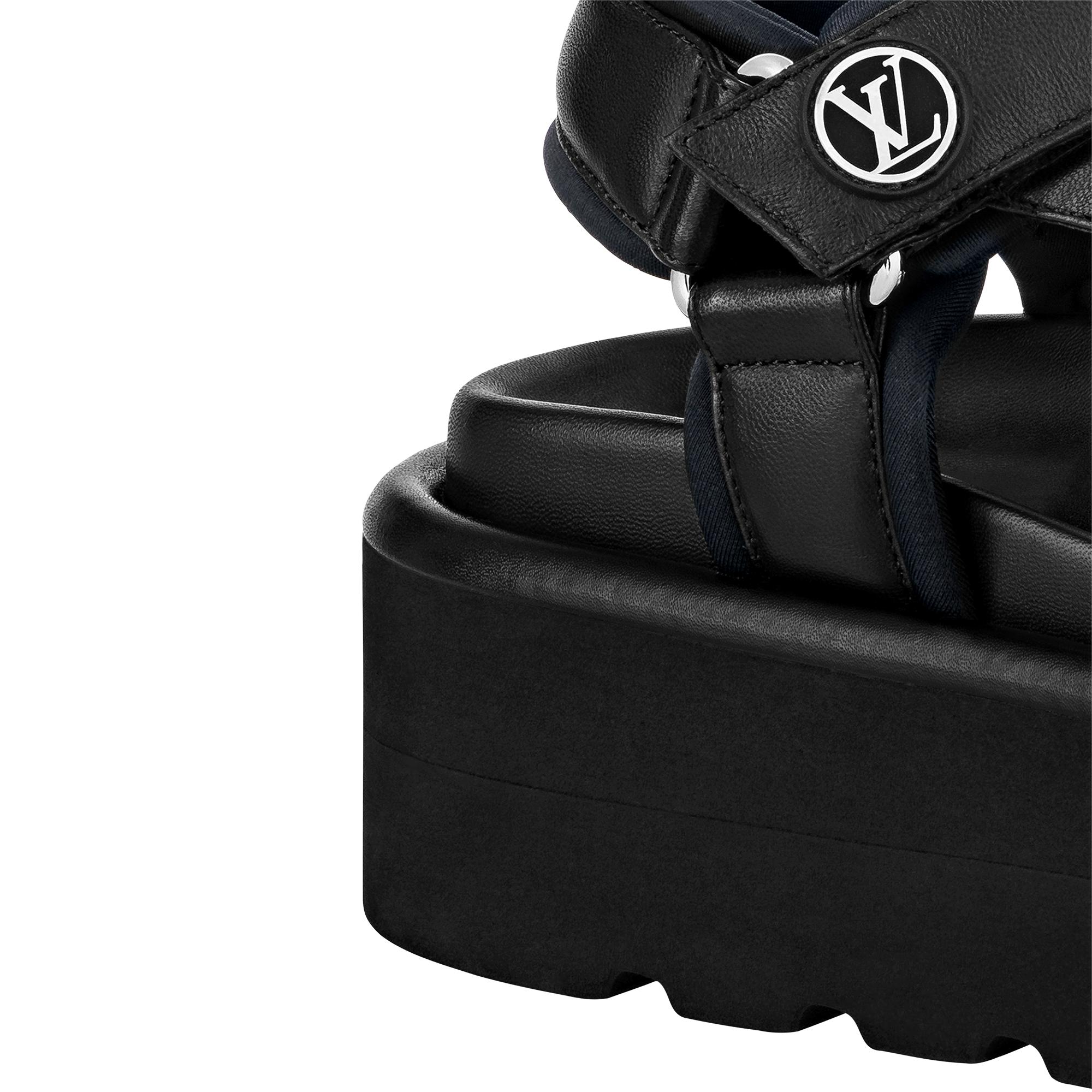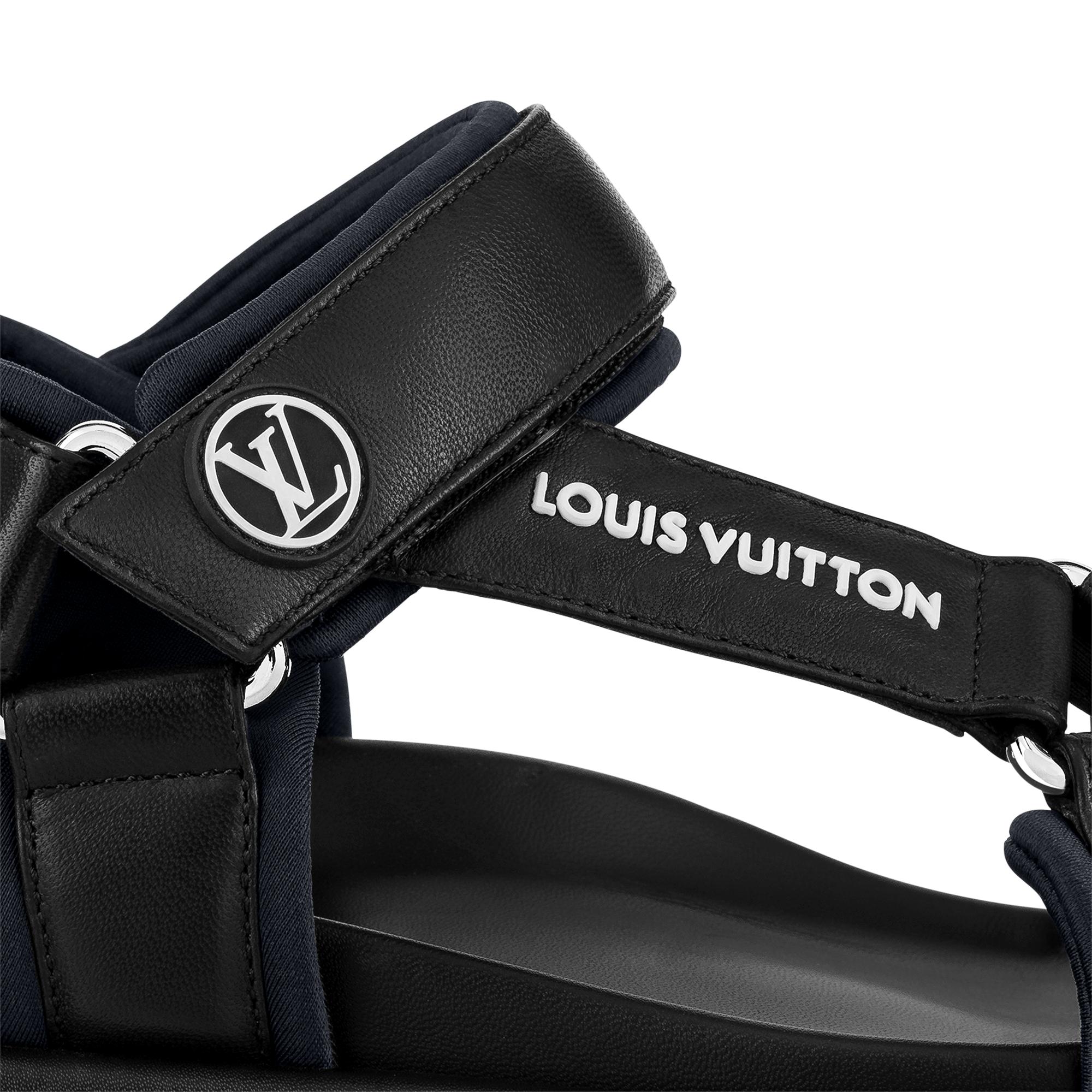 The Pool Pillow flatform comfort sandal comes in extremely soft lambskin. This on-trend, sporty model features an adjustable velcro strap with a rubber LV Circle signature. The key detail of this design is its 4-cm flatform sole in extremely lightweight micro, which is complemented by an anatomic footbed for extra comfort. Product details Black Lambskin Adjustable velcro strap Anatomic footbed Treaded micro outsole 4 cm / 1.6-inch platform LV Circle on the strap Louis Vuitton signature on the strap Patent Monogram-canvas back loop Made in Italy1AABR3 Louis Vuitton Pool Pillow Flat Comfort Sandal - Women - ShoesWomen - Shoes - Sandals and Espadrilles - Pool Pillow Flat Comfort Sandal