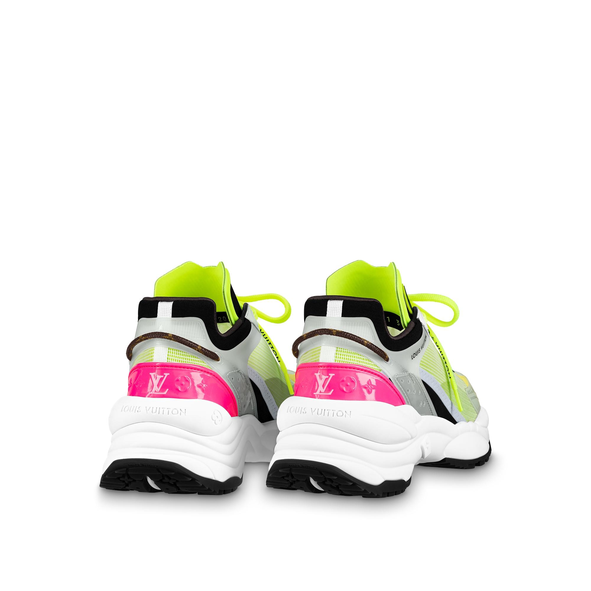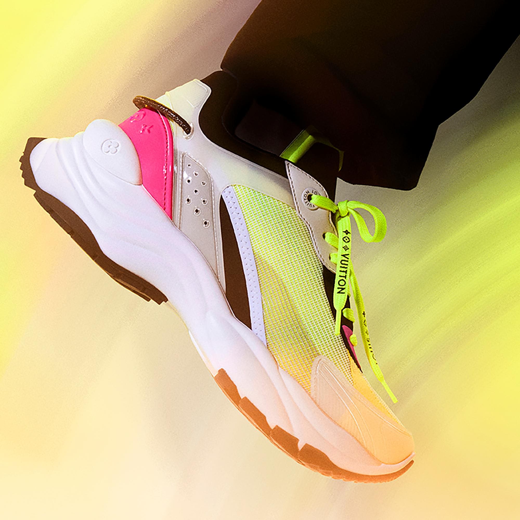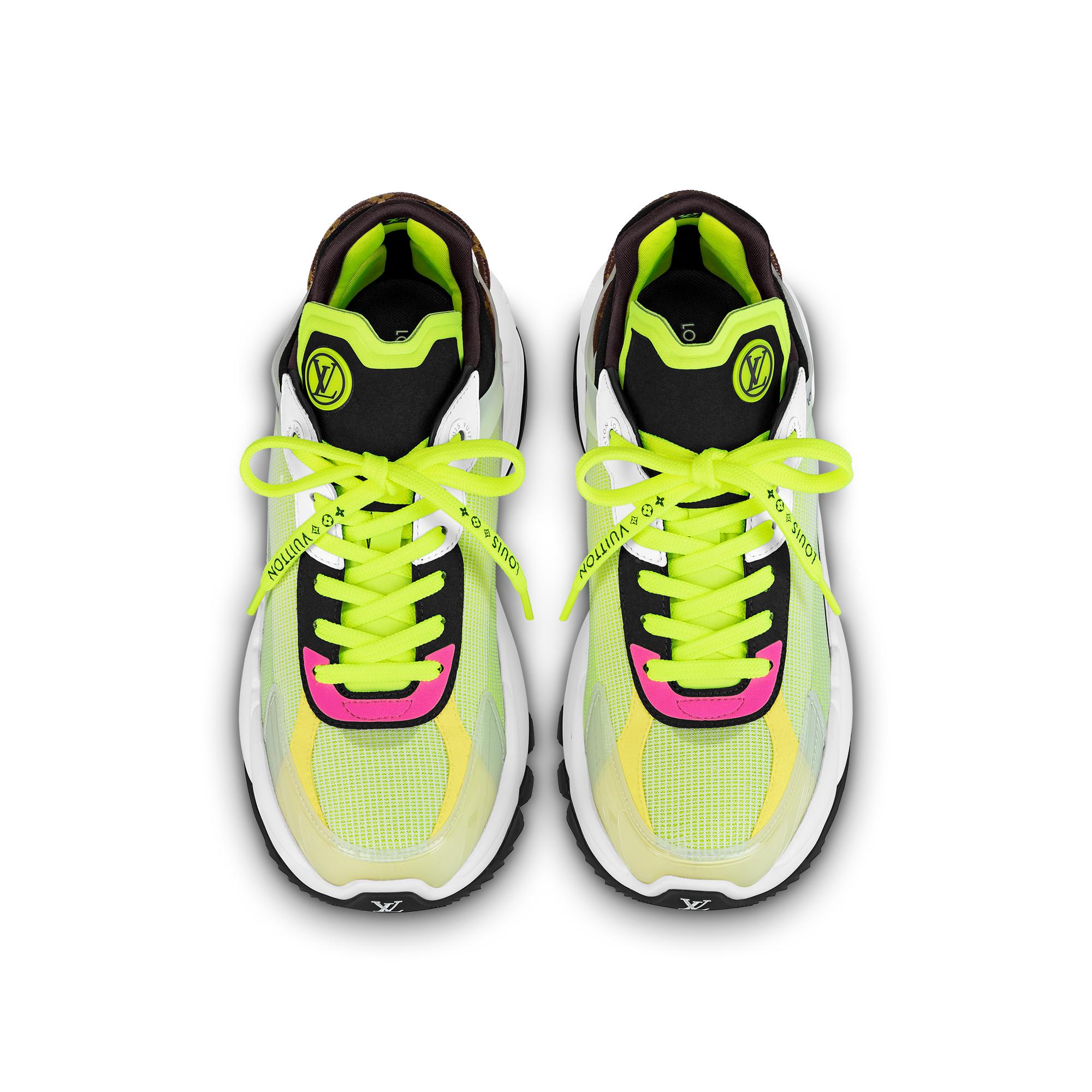 The Run 55 sneaker is a sporty model crafted from a combination of technical materials, including mesh, rubber and tape, as well as plain and suede calf leather. Geared to comfort, this running shoe features a lining with cushioned inserts and a lifted outsole for optimum bounce. The design incorporates multiple signatures, including a Monogram-canvas lace at the back. Product details Yellow Mix of materials Cushioned lining Lifted rubber outsole Louis Vuitton-engraved eyelets Monogram-Flower and Vuitton signatures on the laces LV Circle rubber patch on the tongue LV Initials on the front and back Louis Vuitton signature on the back Patent Monogram-canvas lace on the back Made in Italy1A9H4T YellowLouis Vuitton Run 55 Sneaker - Women - ShoesWomen - Shoes - Sneakers - Run 55 Sneaker