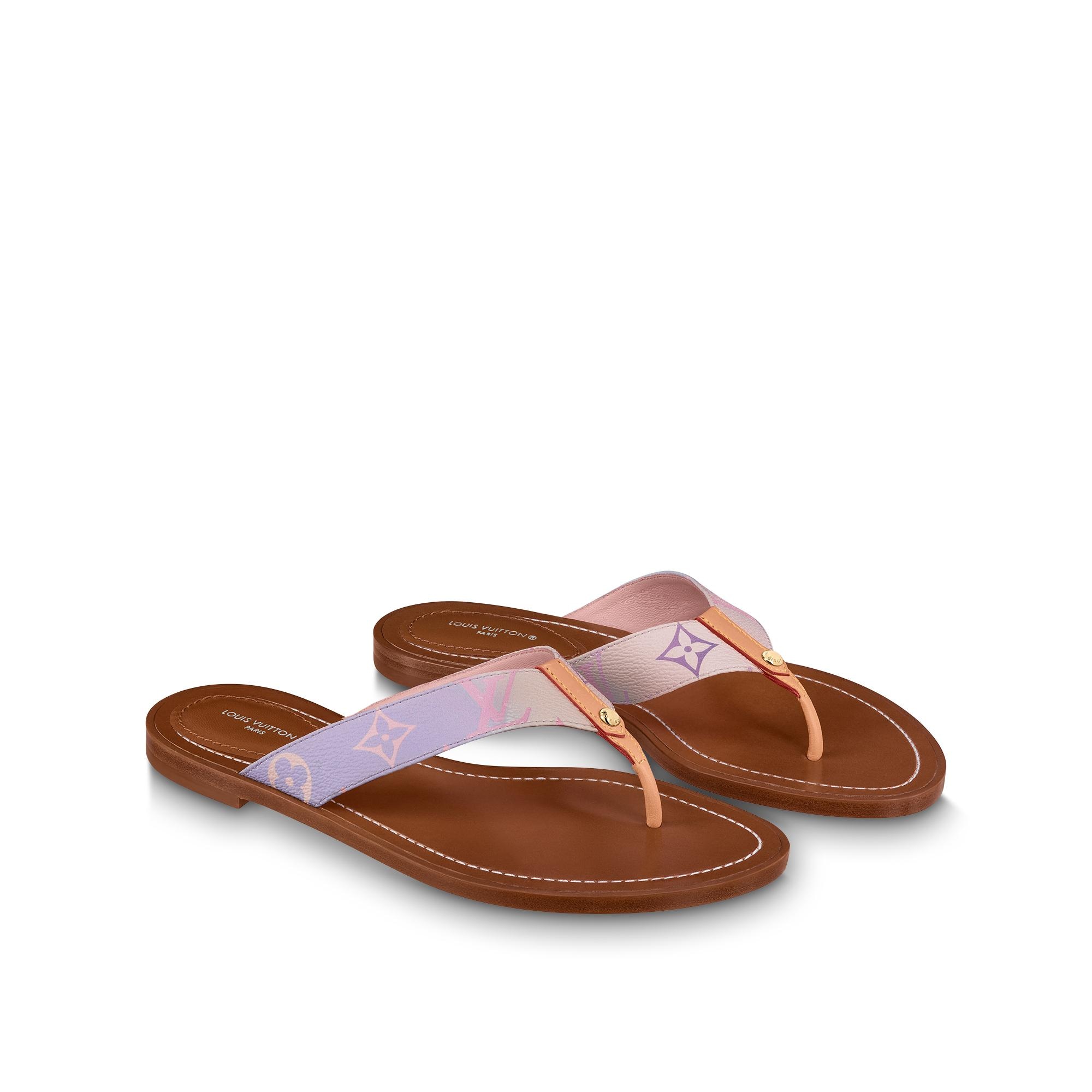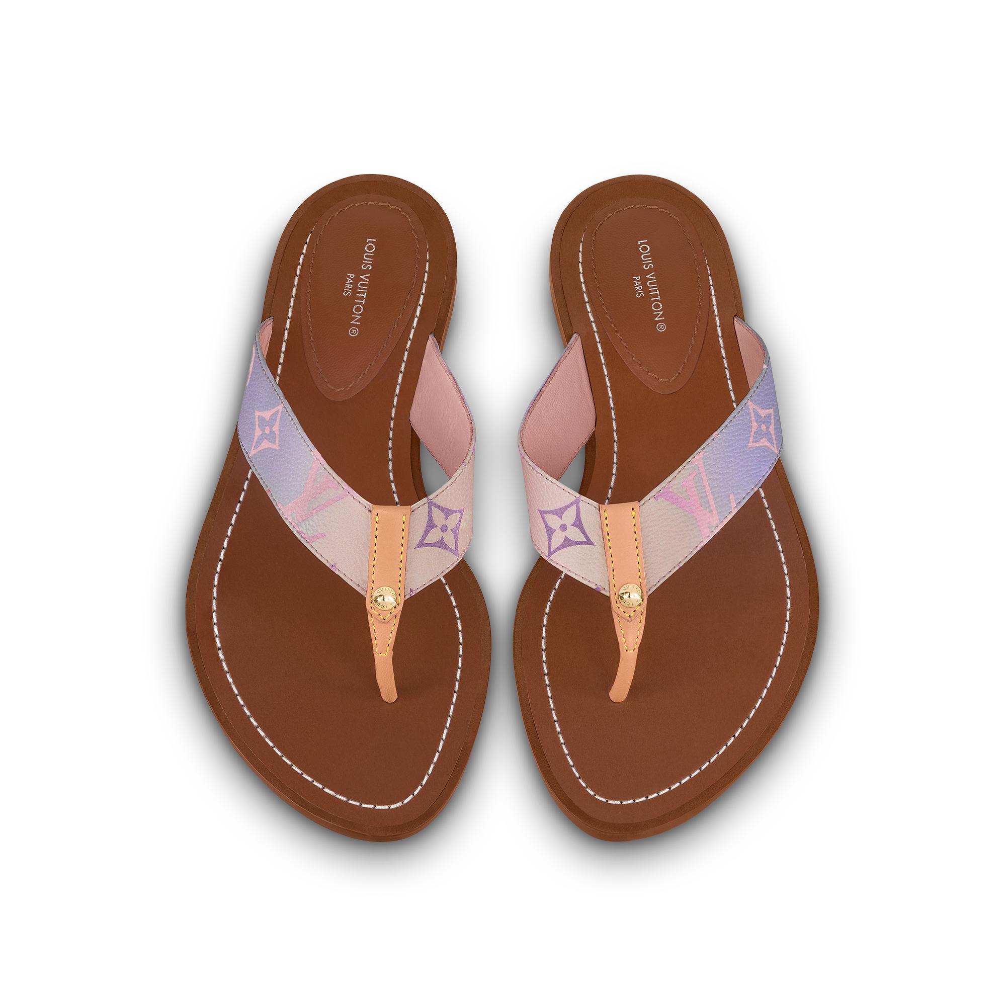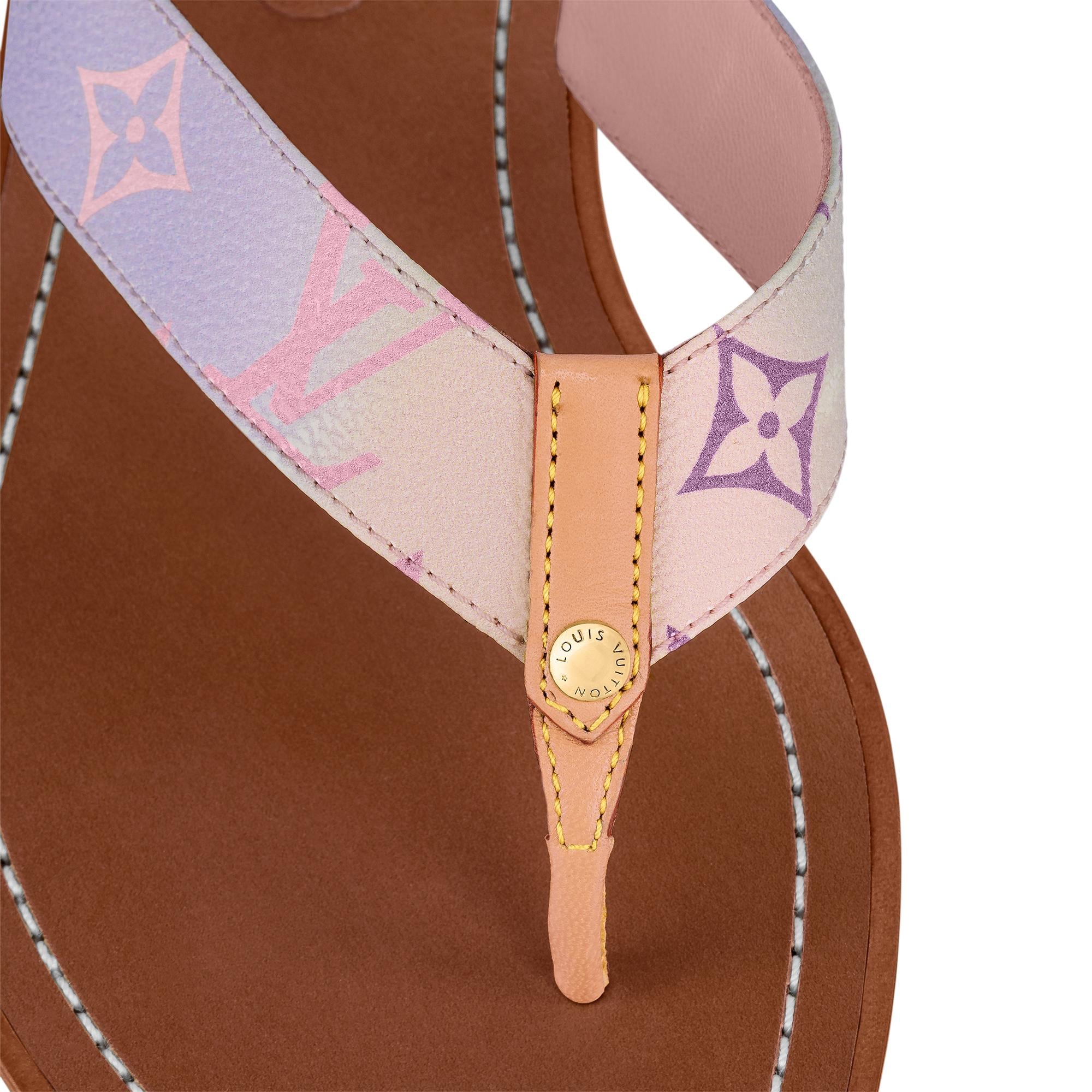 The Sunny flat thong is crafted from patent Monogram canvas with a color-gradient effect. The two main straps are joined by a slender central strap in natural leather, which is embellished with a gold-tone stud engraved with the Louis Vuitton signature. A durable leather outsole completes this casual-chic design. Product details Rose Clair Pink Patent Monogram canvas Leather outsole Louis Vuitton-engraved stud Made in Italy1AA0Y7 Louis Vuitton Sunny Flat Thong - Women - ShoesWomen - Shoes - Mules and Slides - Sunny Flat Thong