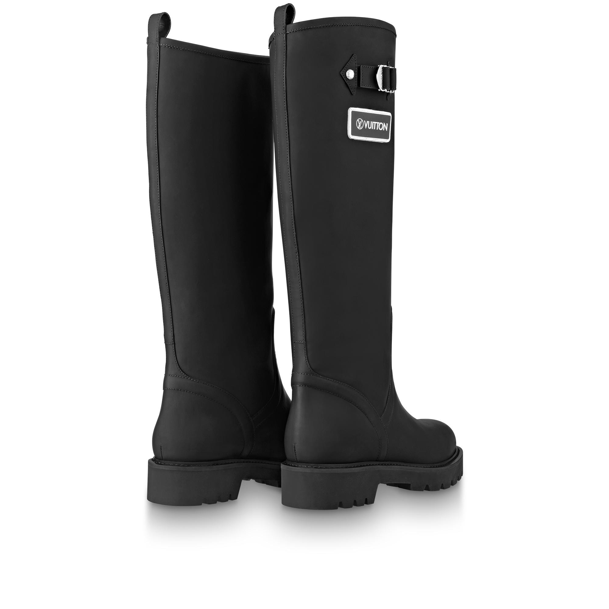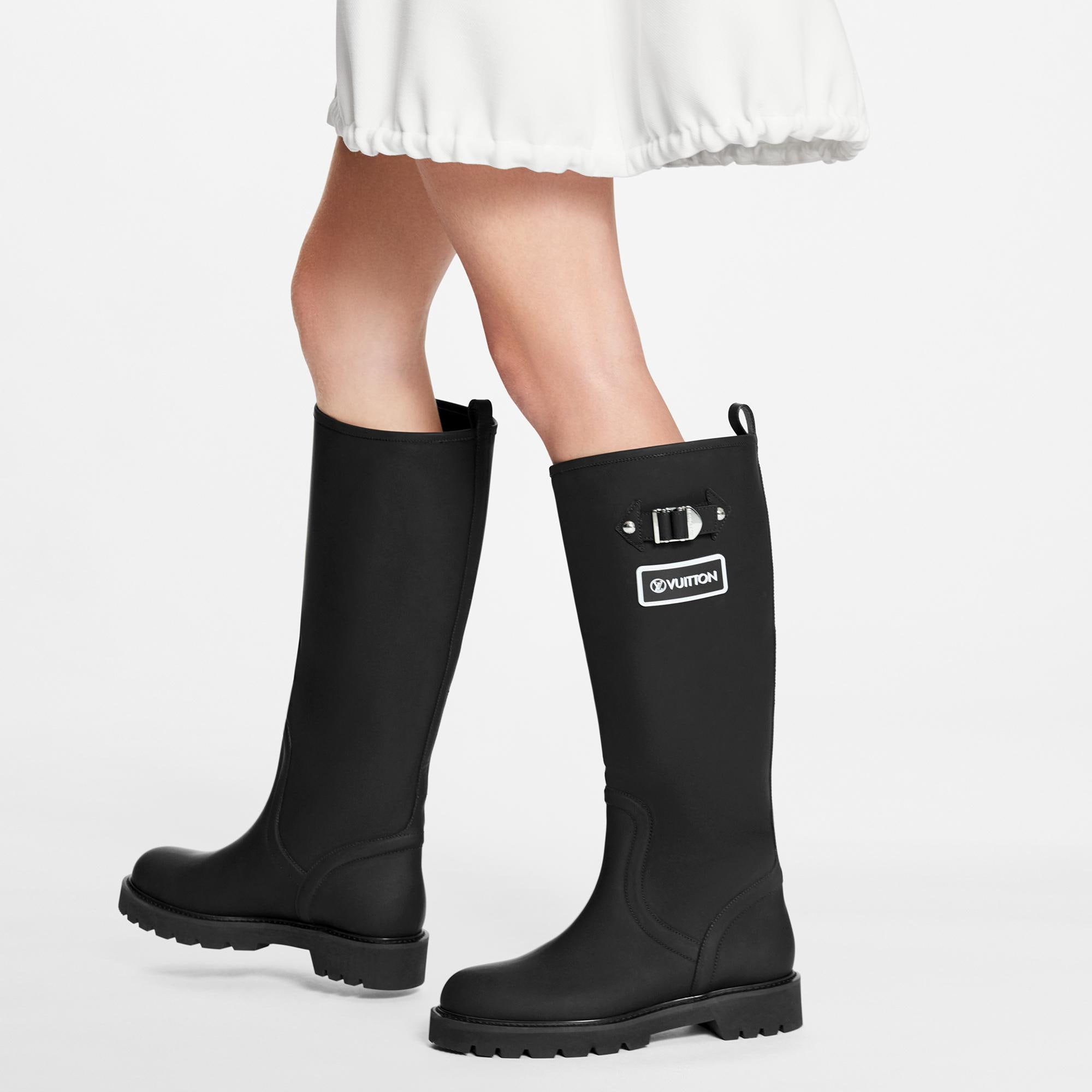 Rubber-effect calf leather gives the Territory flat high boot the appearance of an authentic rain boot. The rubber outsole is color-matched to the upper for an original "dipped-in-paint" look. This slip-on model is signed with a Vuitton tag and an engraved, silver-tone buckle and studs. Product details Black Calf leather Treaded rubber outsole with leather welt Vuitton rubber tag Louis Vuitton-engraved buckle and studs Made in Italy1A9H21 BlackLouis Vuitton Territory Flat High Boot - Women - ShoesWomen - Shoes - Boots and Booties - Territory Flat High Boot