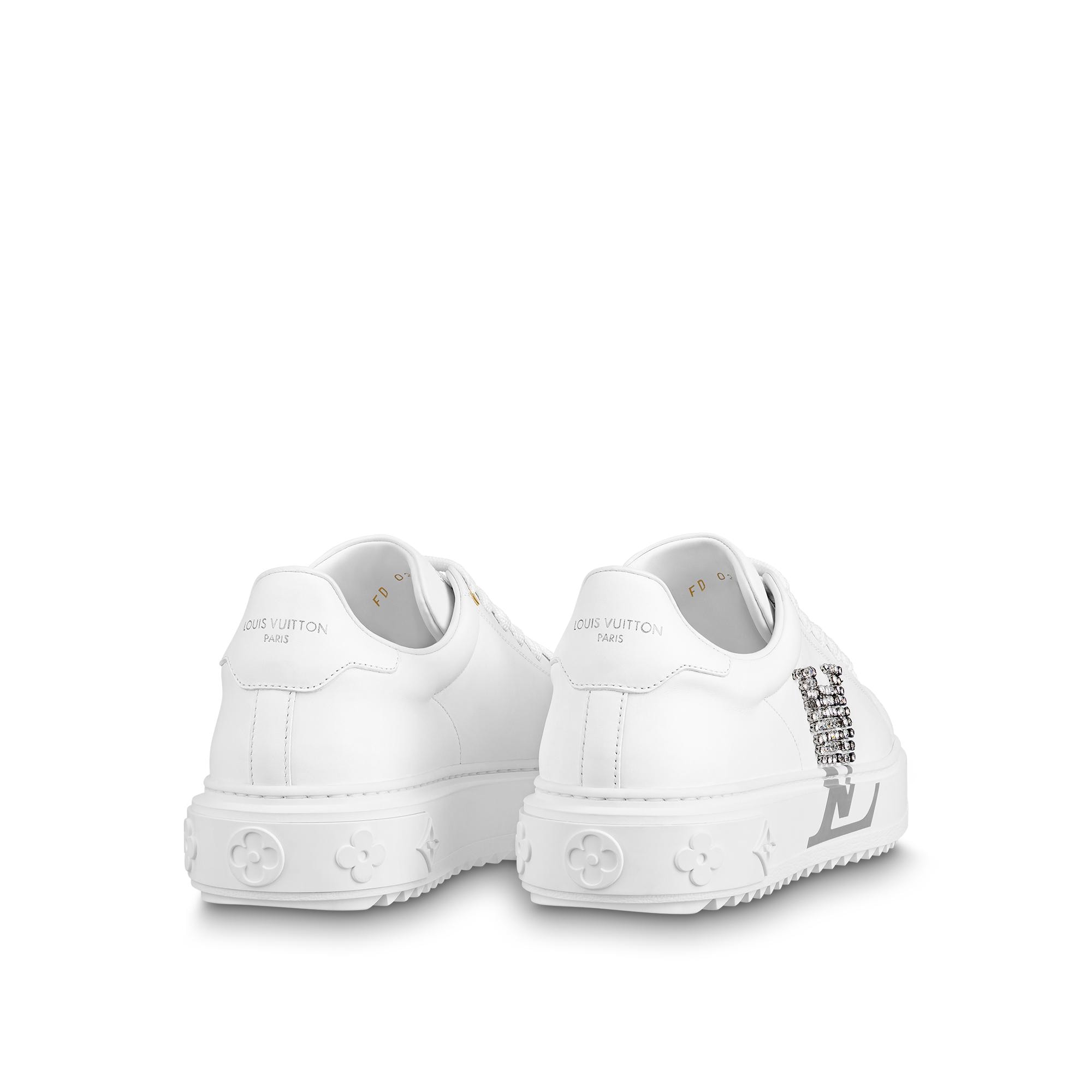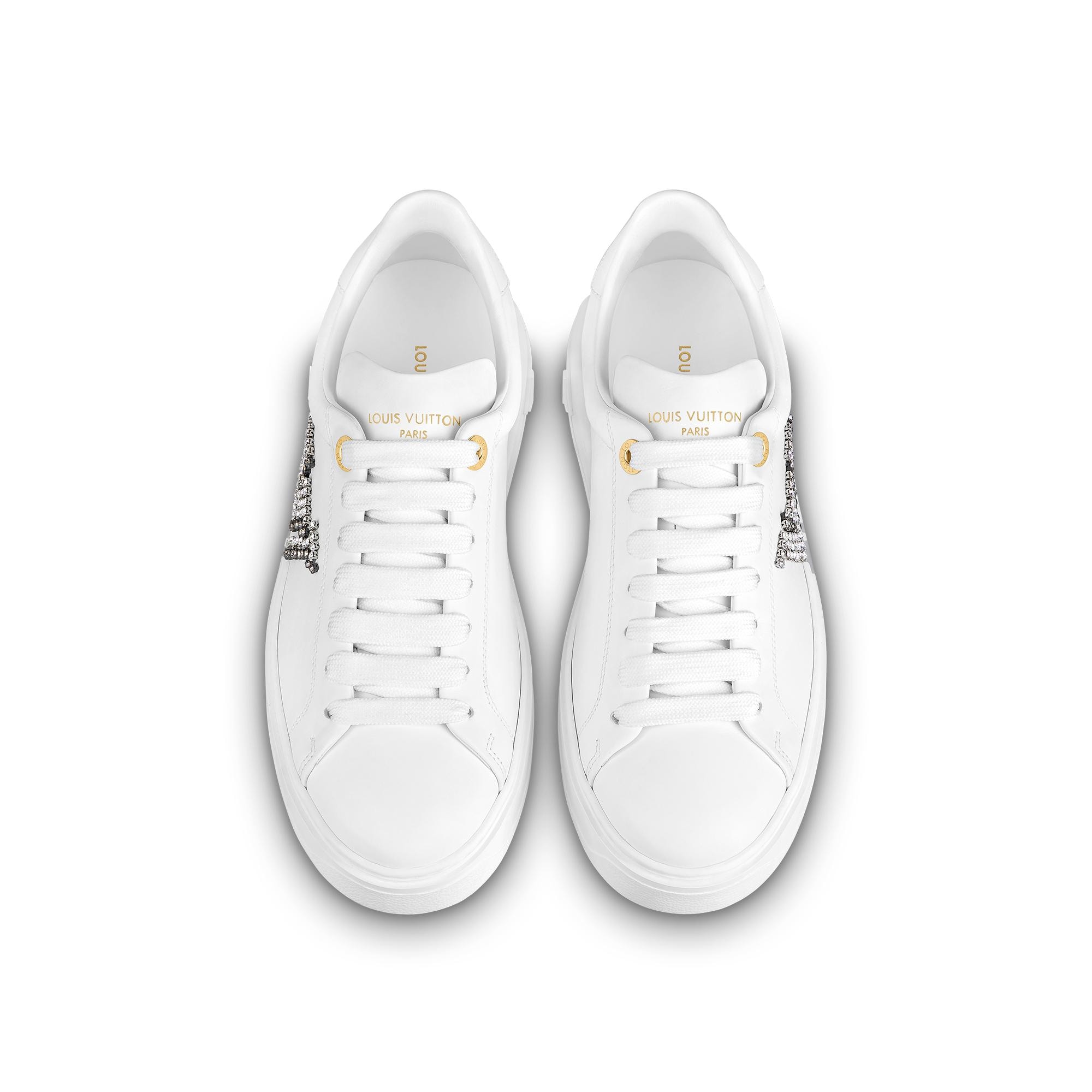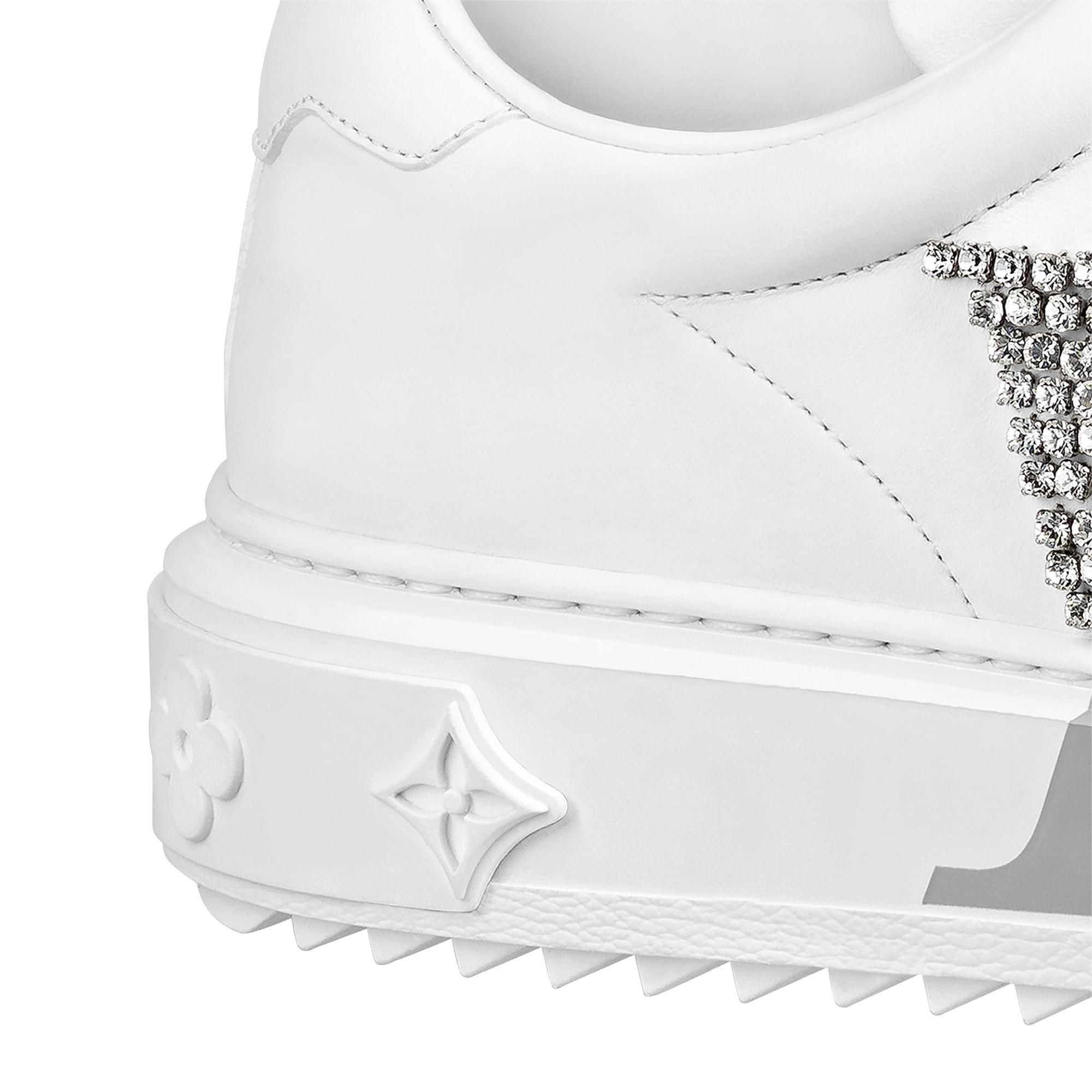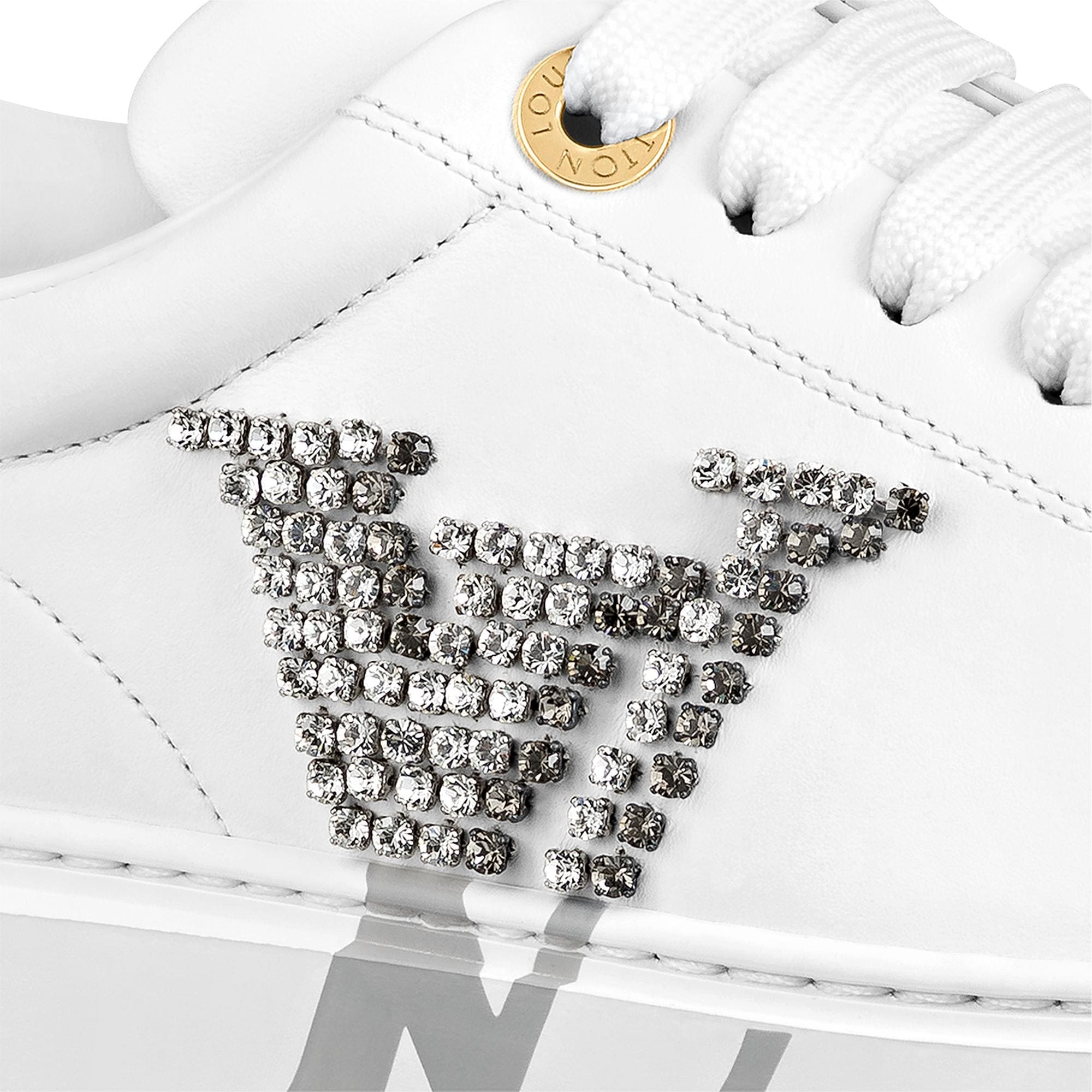Crafted from soft white calf leather, this day-to-night version of the Time Out sneaker is embroidered with an LV Initials signature in sparkling crystals on the side. This emblematic design is enhanced by other refined details, including engraved, gold-tone eyelets and 3-D Monogram-Flower motifs on the elevated rubber outsole. Product details Silver Calf leather and strass Elevated, treaded rubber outsole Louis Vuitton-engraved eyelets Louis Vuitton signature on the tongue LV Initials on the side Monogram Flowers on the outsole Made in Italy1A9Q2G Louis Vuitton Time Out Sneaker - Women - ShoesWomen - Shoes - Sneakers - Time Out Sneaker