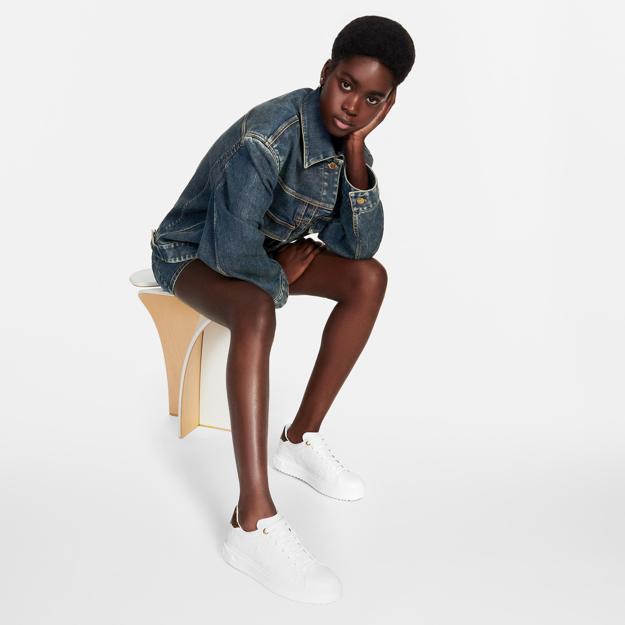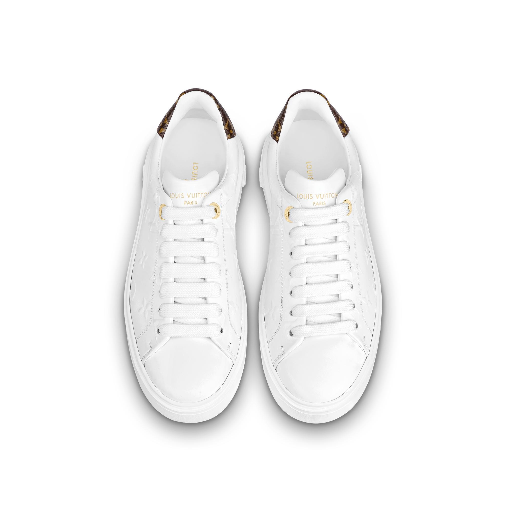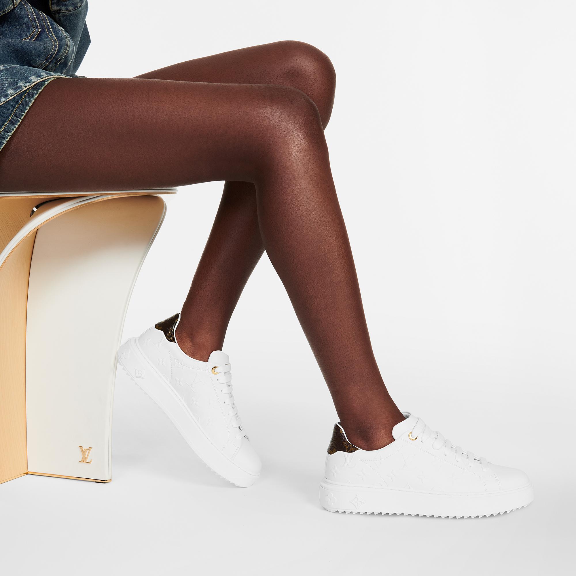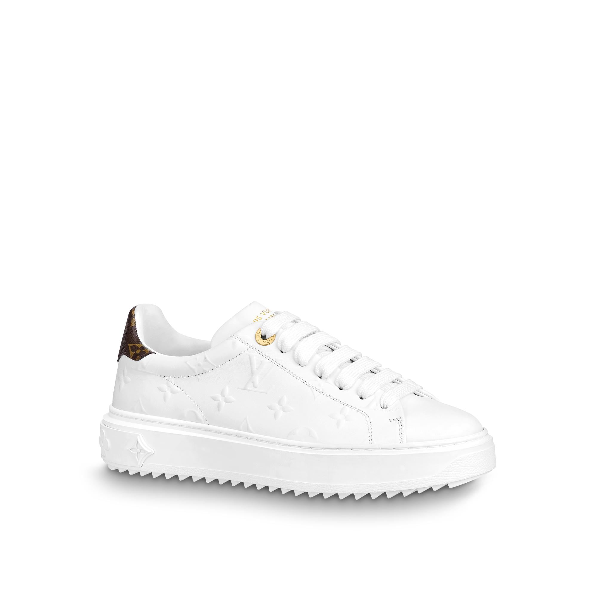 Louis Vuitton's Time Out sneaker is reinterpreted in soft calf leather, which is debossed with the iconic Monogram to create a raised pattern. Monogram-canvas trim at the back complements this richly detailed design, which also features engraved, gold-tone eyelets. The sneaker's elevated outsole is debossed with motifs of Monogram Flowers. Product details White Monogram-debossed calf leather Elevated, treaded rubber outsole Louis Vuitton-engraved eyelets Louis Vuitton signature on the tongue Monogram Flowers on the outsole Made in Italy1AAE5O Louis Vuitton Time Out Sneaker - Women - ShoesWomen - Shoes - Sneakers - Time Out Sneaker